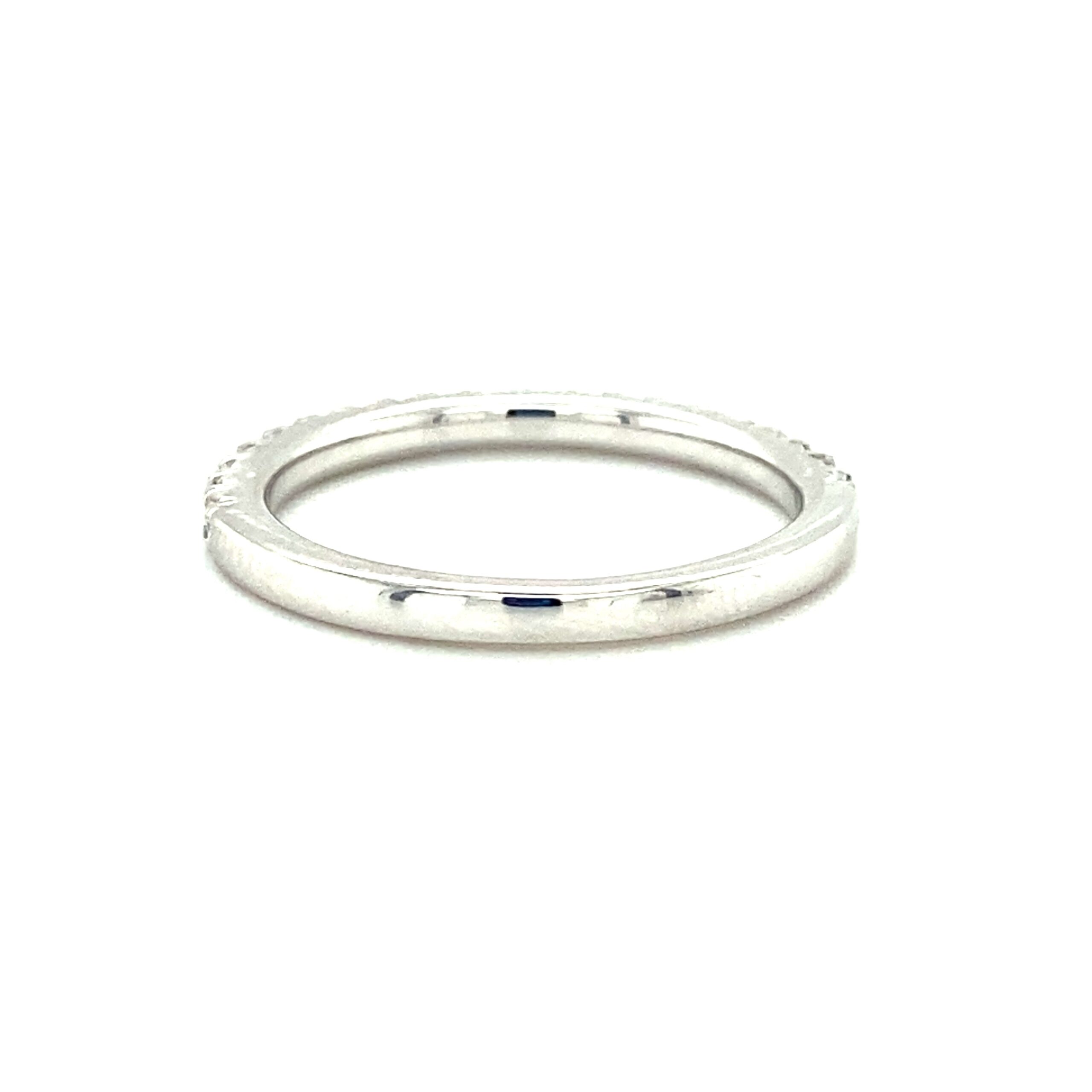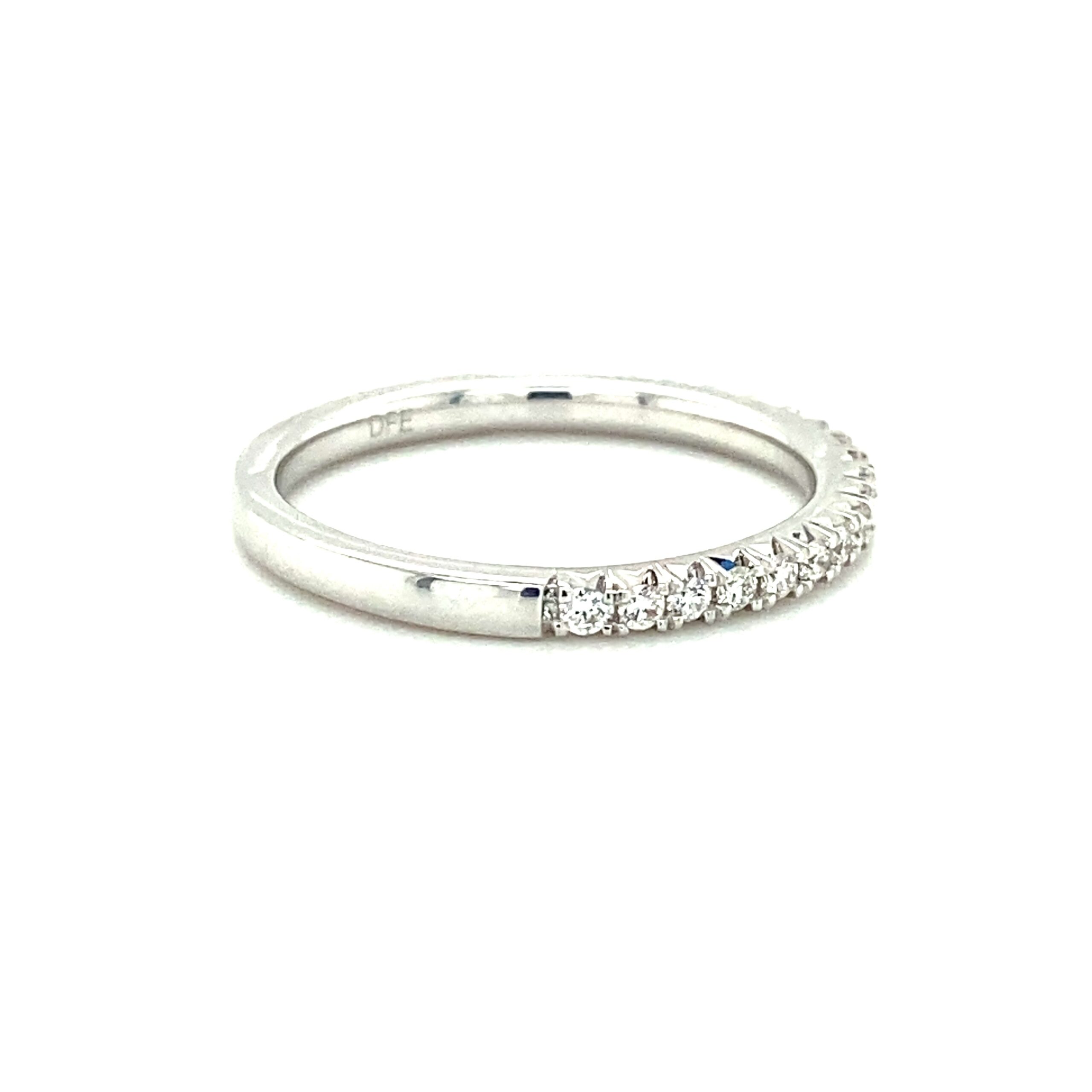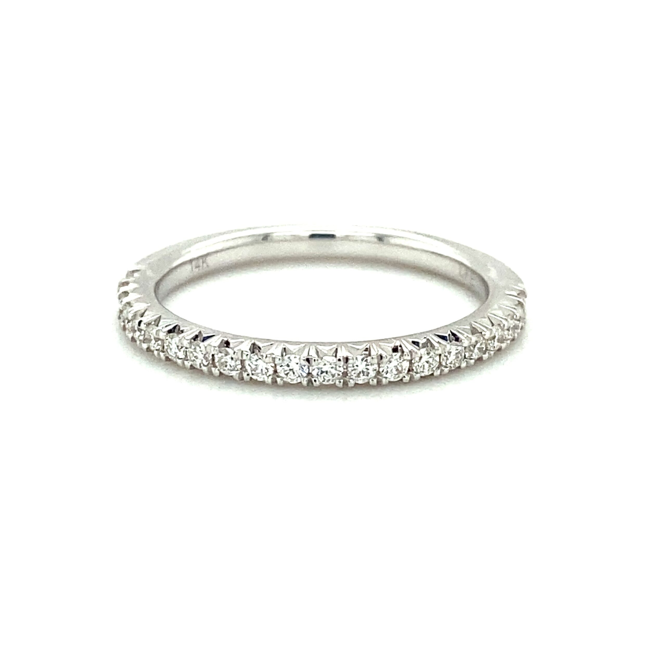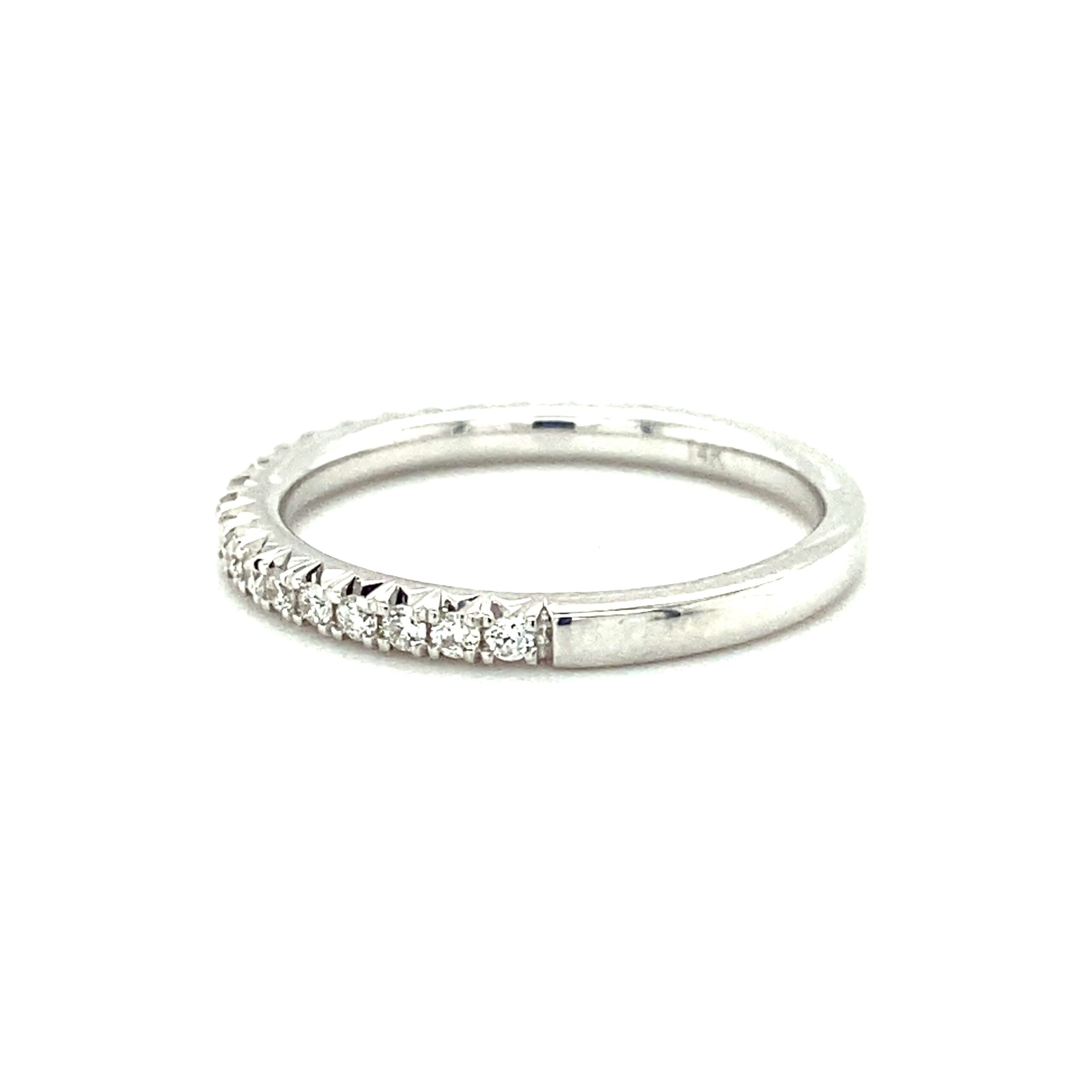 The 0.26ctw Fishtail Prong Diamond Band in 14 karat white gold features 21 round brilliant diamonds weighing 0.26ctw with G-H color and VS2-SI1 clarity in fishtail-prong settings. The band measures 1.99mm wide at the top and tapers to 1.92mm wide at the bottom of the shank. Stamped with “14K DFE.” Finger size 6.5.