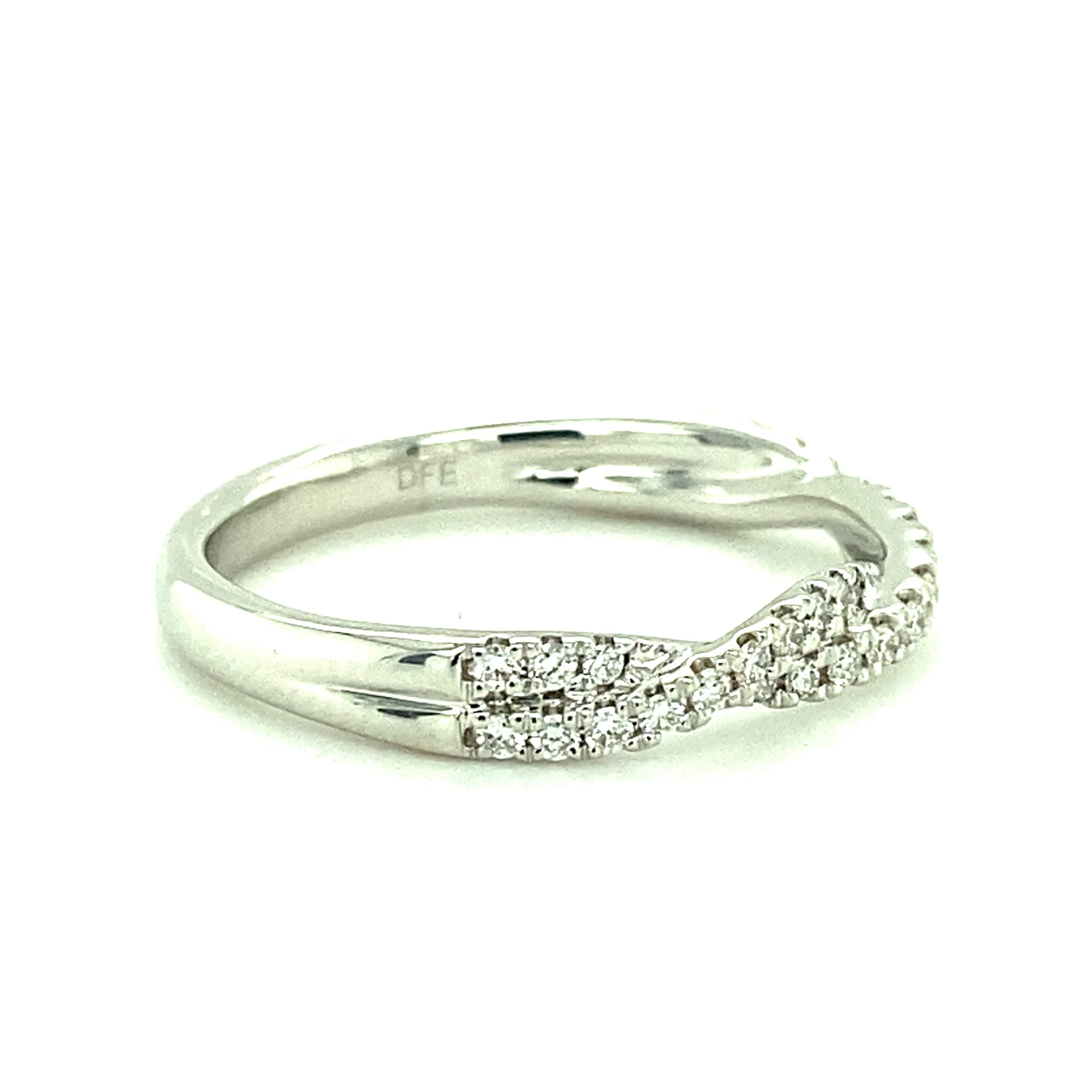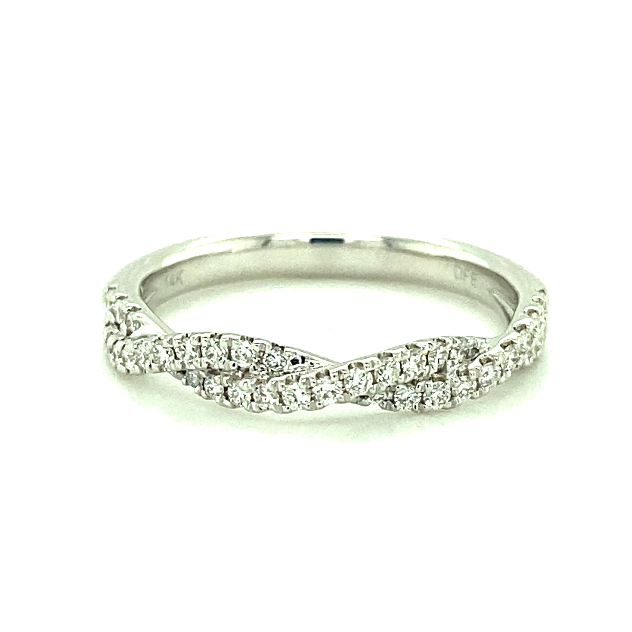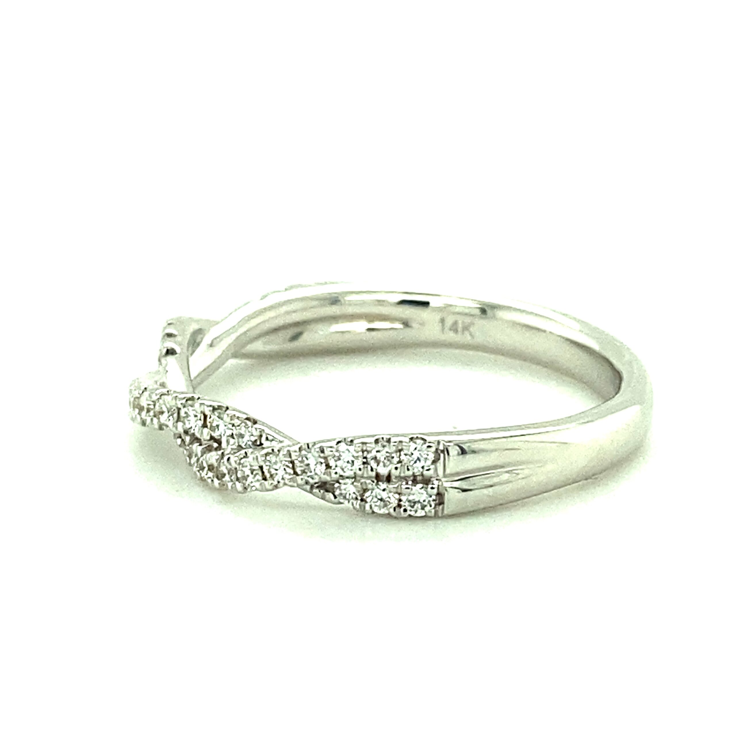 The 0.29ctw Twist Diamond Band in 14 karat white gold features 36 round brilliant diamonds weighing 0.29ctw with G-H color and VS2-SI1 clarity in prong settings. Stamped with “14K DFE.” Finger size 6.75.