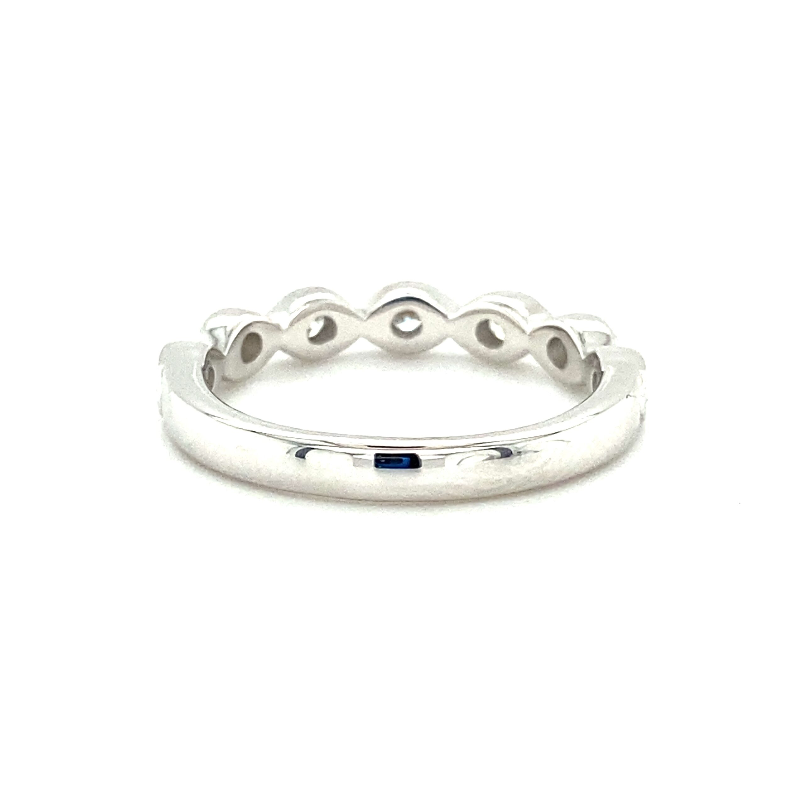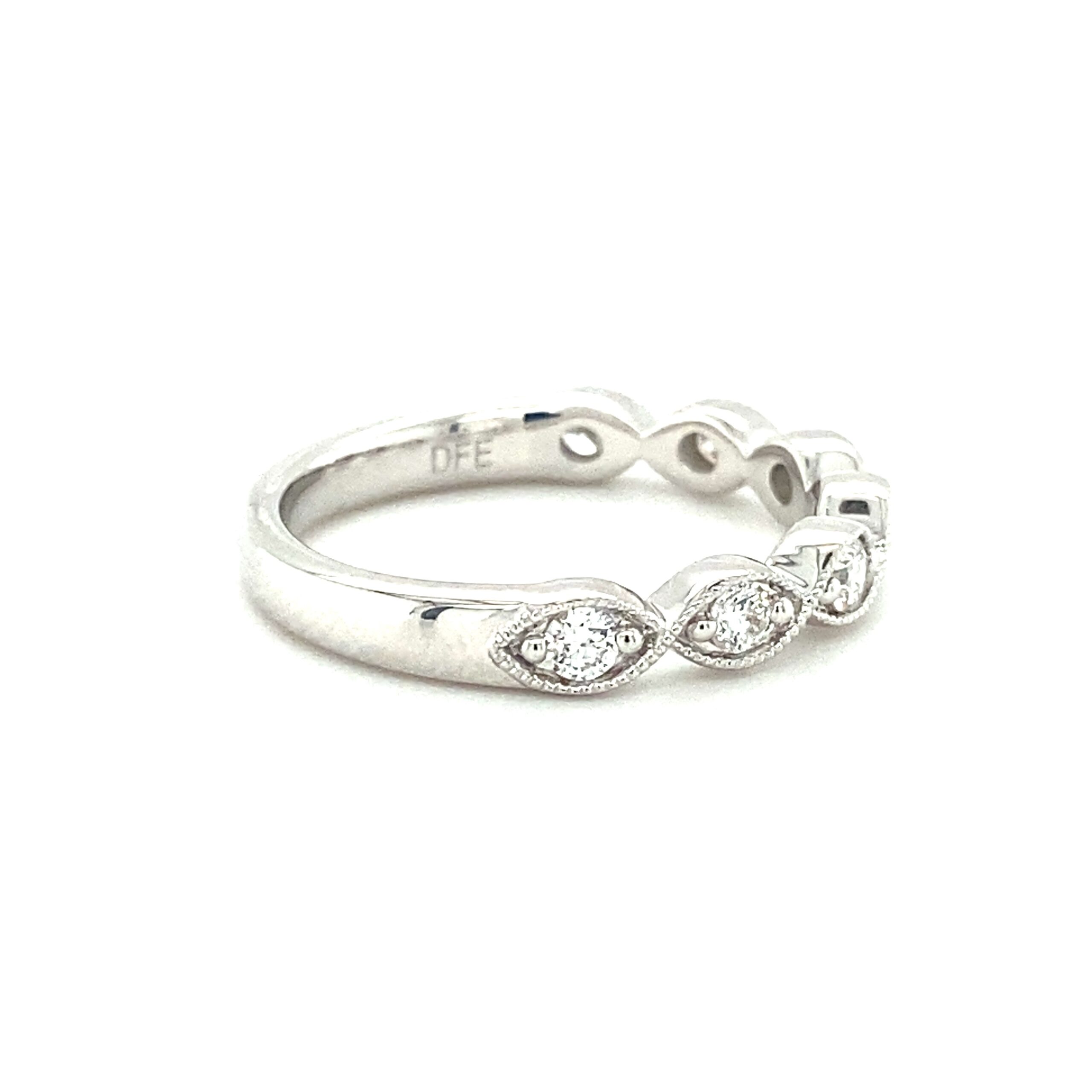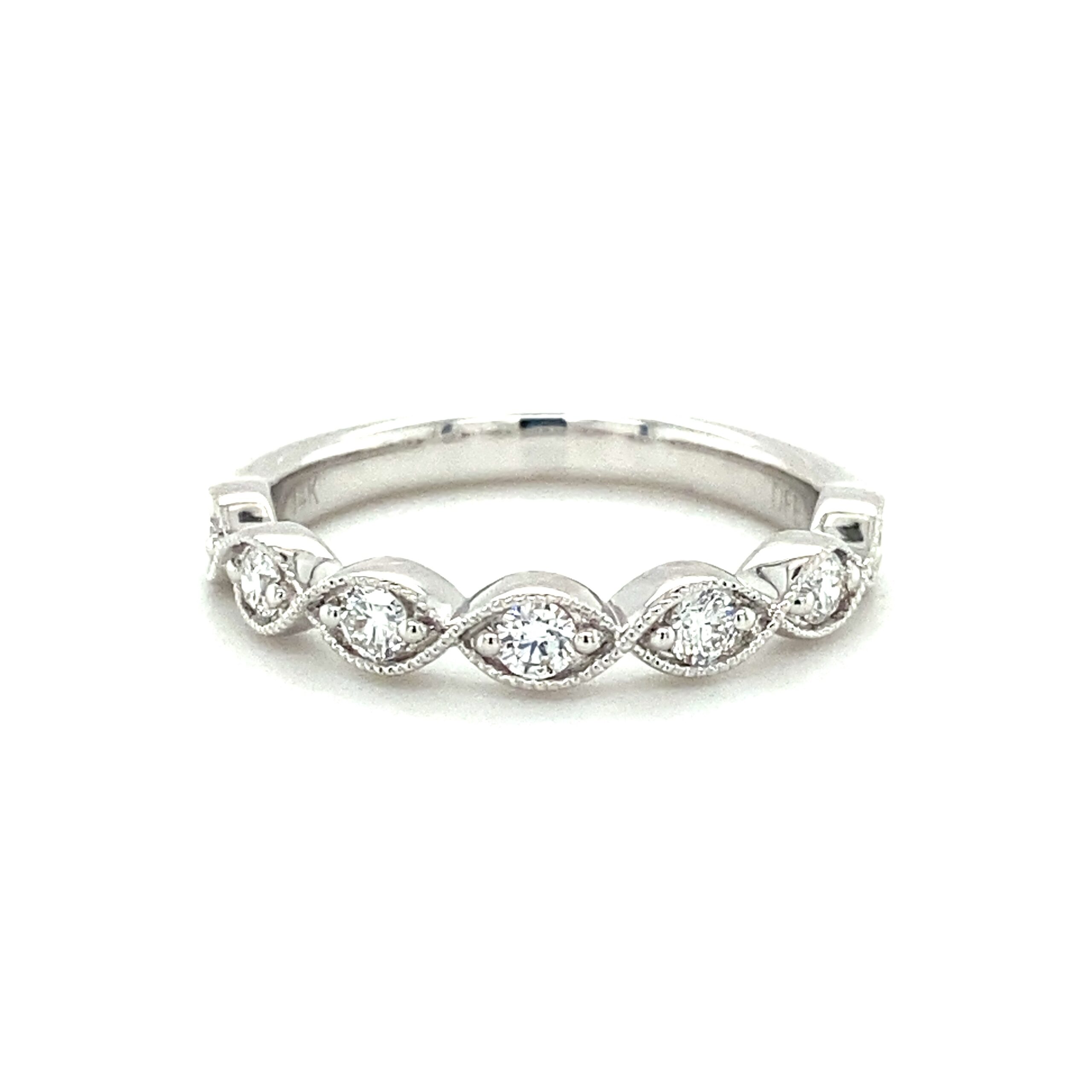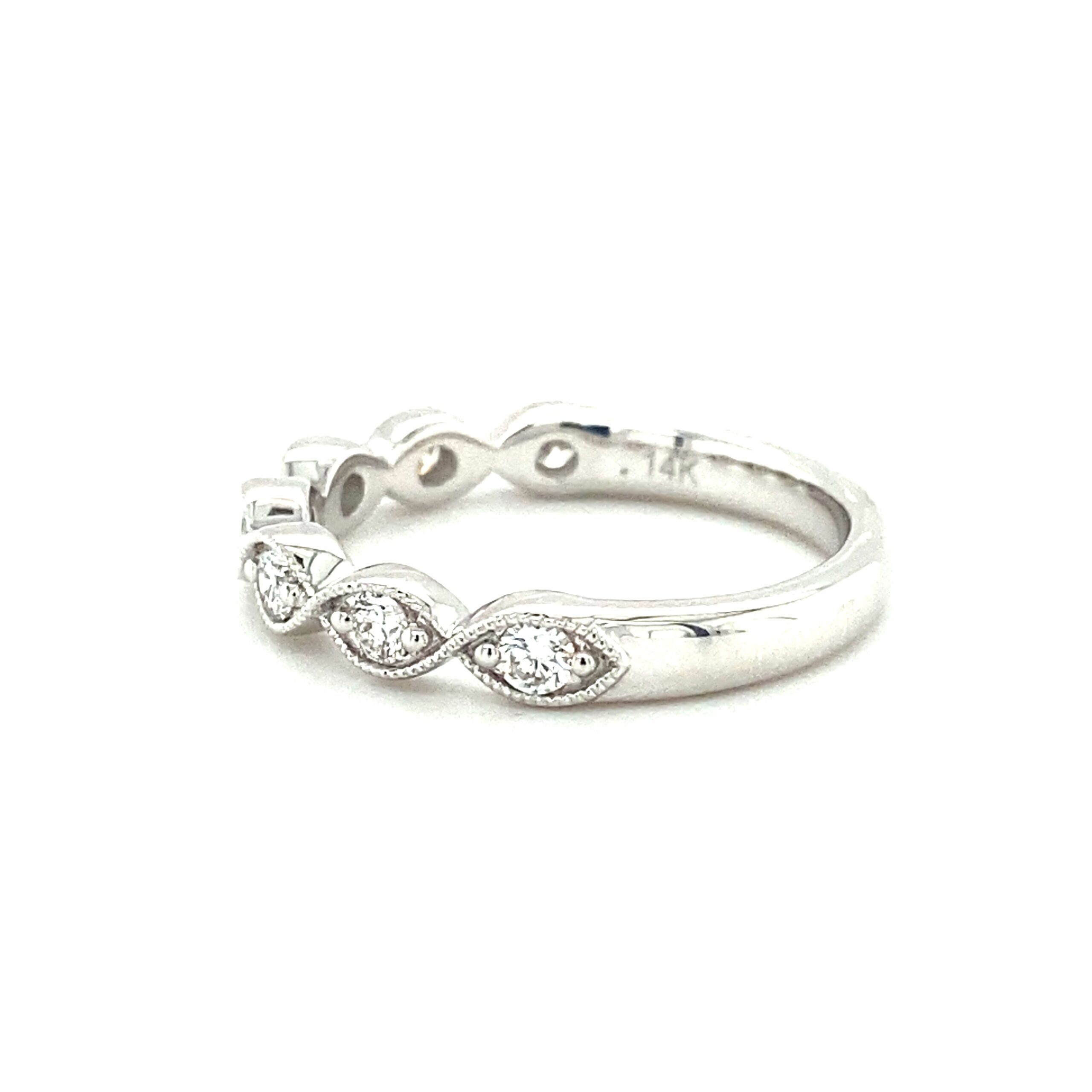 The 0.34ctw Milgrain Twist Diamond Band in 14 karat white gold features 7 round brilliant diamonds weighing 0.34ctw with G-H color and VS2-SI1 clarity bead-set in a marquise shape encased by delicate milgrain details in a twisting design. The top of the band measures 3.30mm wide and tapers to 2.79mm at the bottom of the shank. Stamped with “14K DFE.” Finger size 6.5.