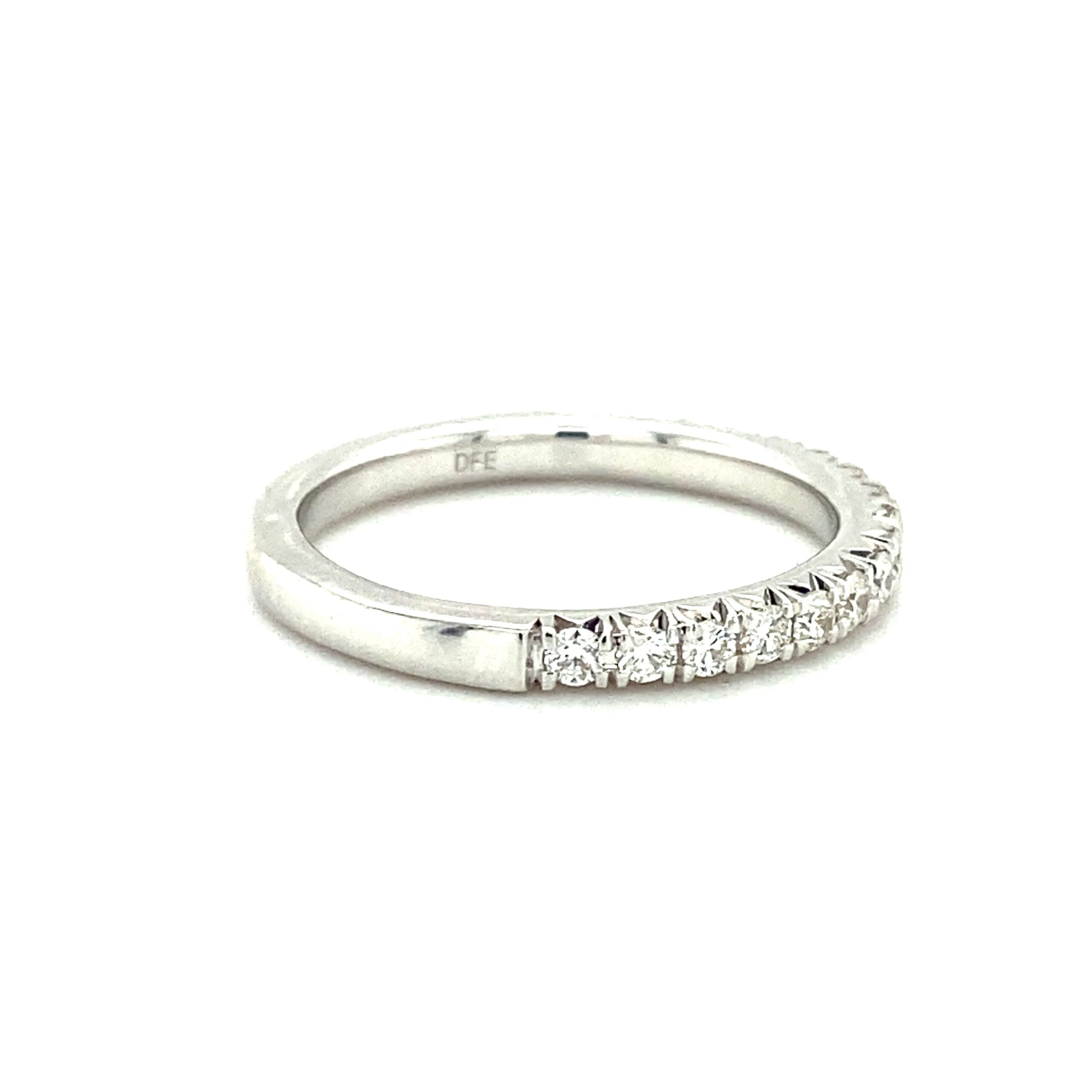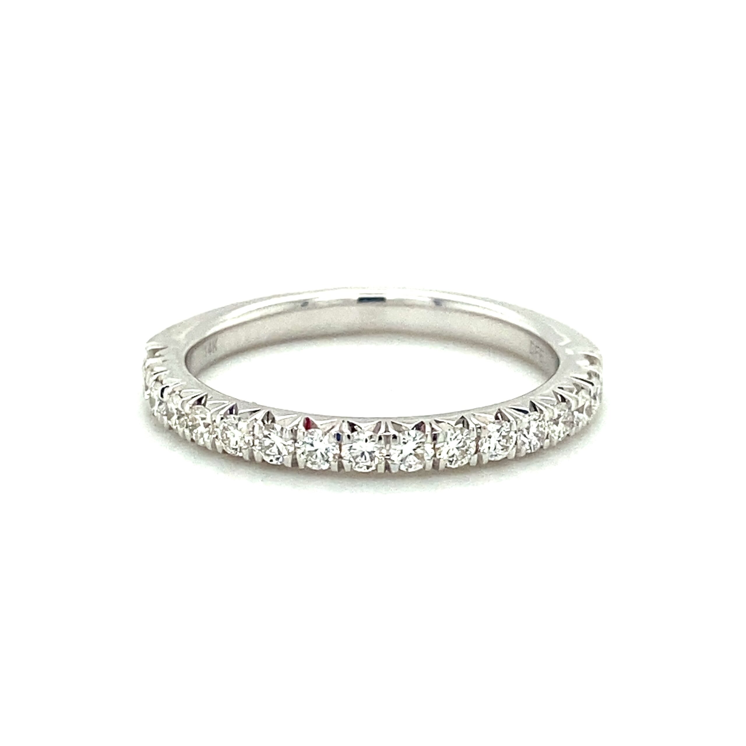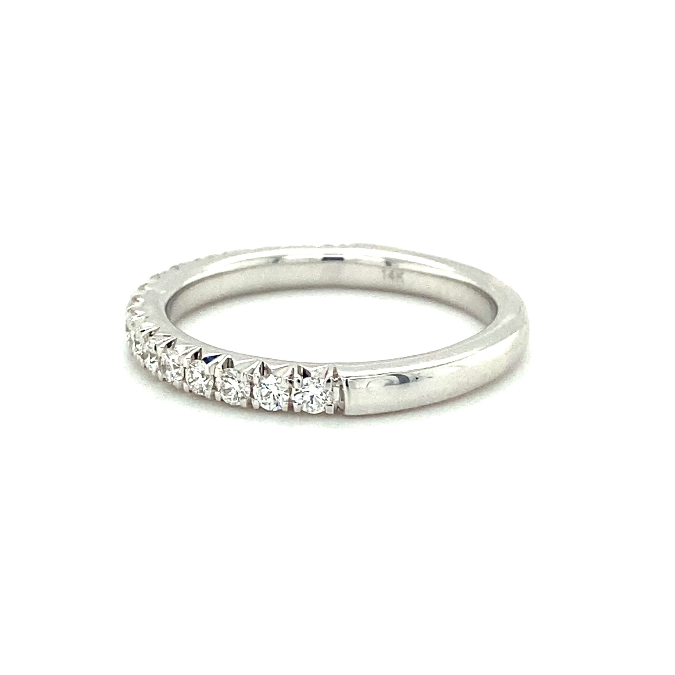 The 0.43ctw Fishtail Prong Diamond Band in 14 karat white gold features 17 round brilliant diamonds weighing 0.43ctw with G-H color and VS2-SI1 clarity in fishtail-prong settings. The band measures 2.30mm wide at the top and tapers to 2.29mm wide at the bottom of the shank. Stamped with “14K DFE.” Finger size 6.5.