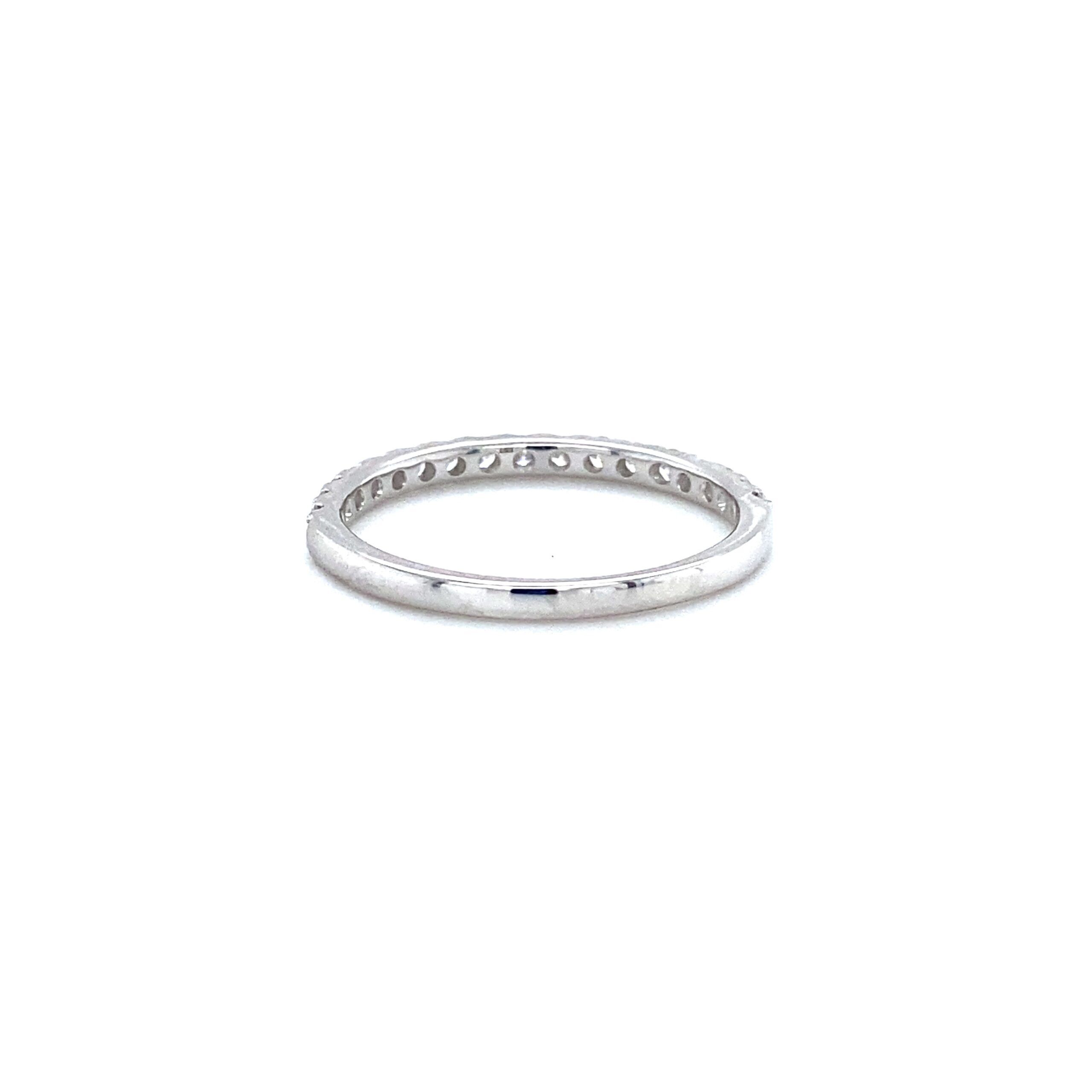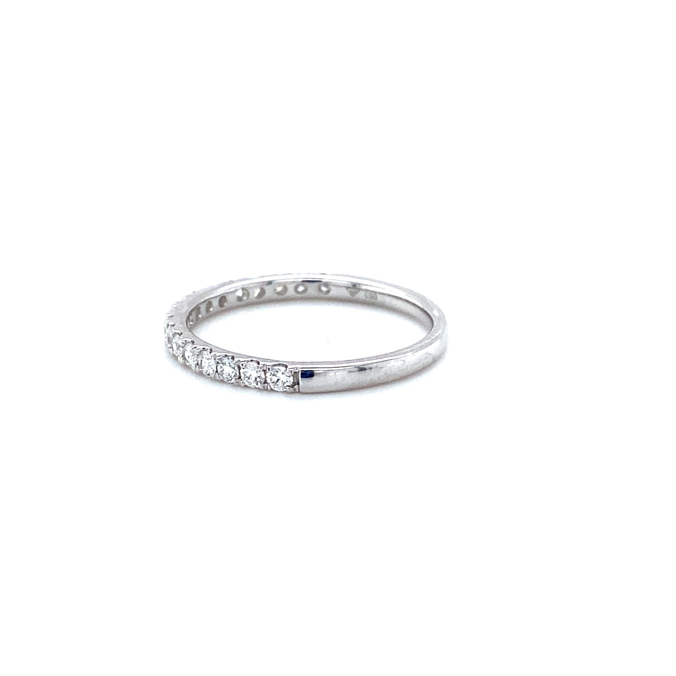 The 0.43ctw Lab-Created Diamond Band in 14 karat white gold features 17 lab-created round brilliant diamonds weighing 0.43ctw with G-H color and VS-SI1 clarity in prong settings. Finger size 7.