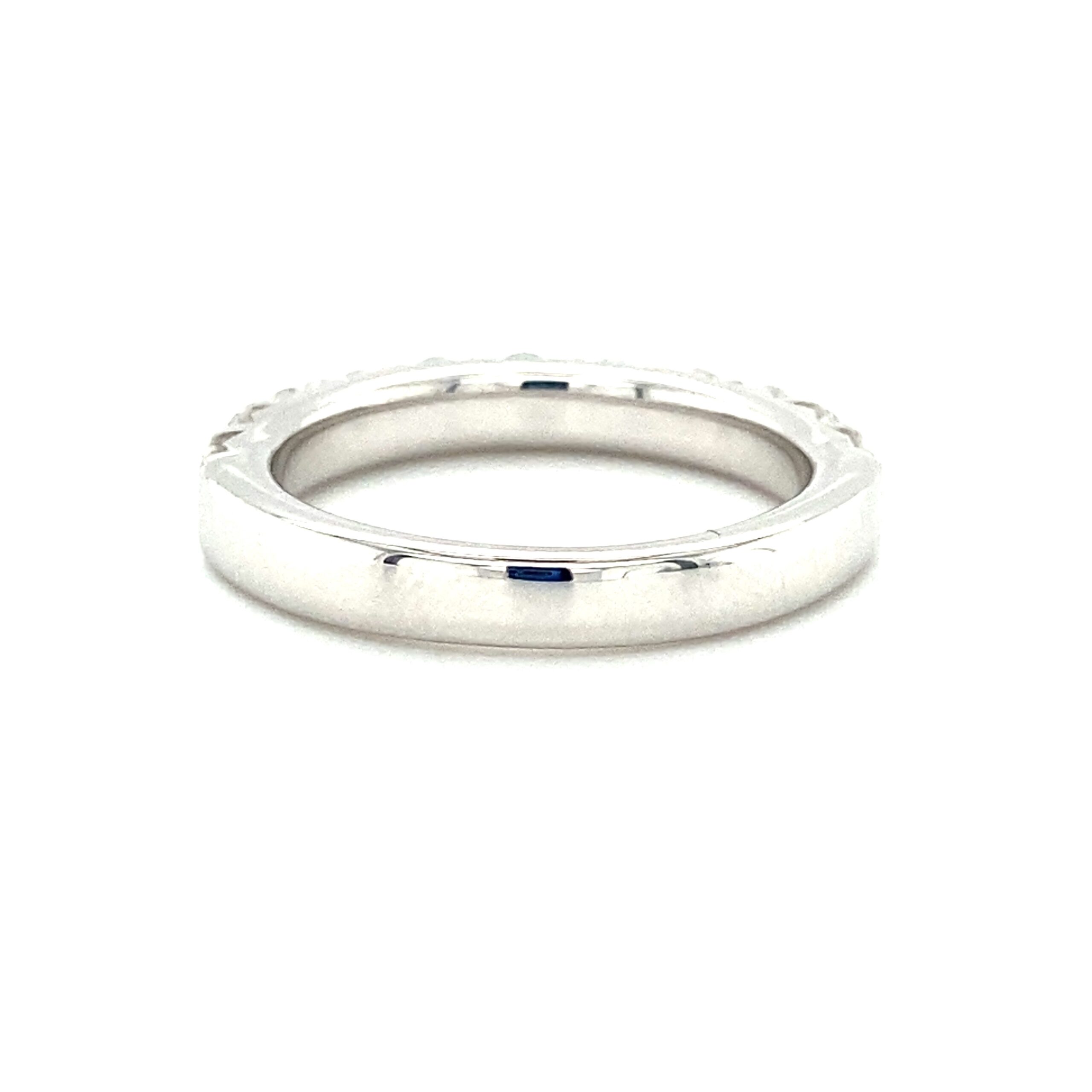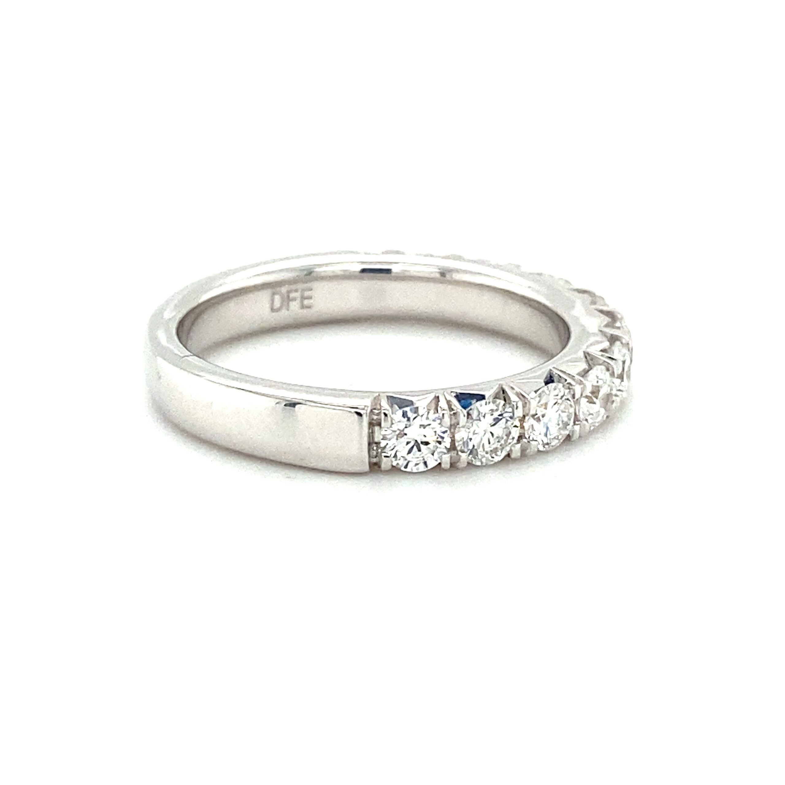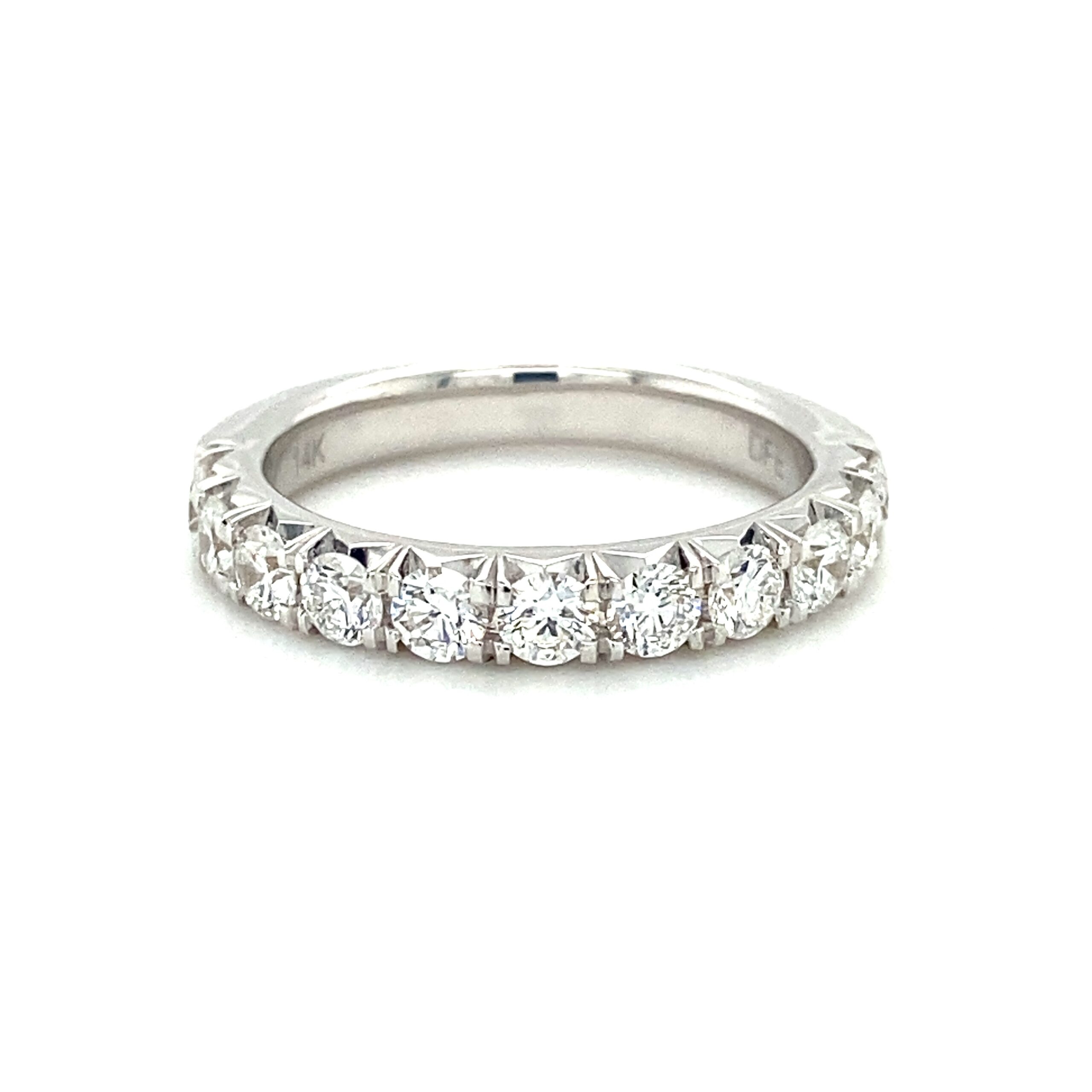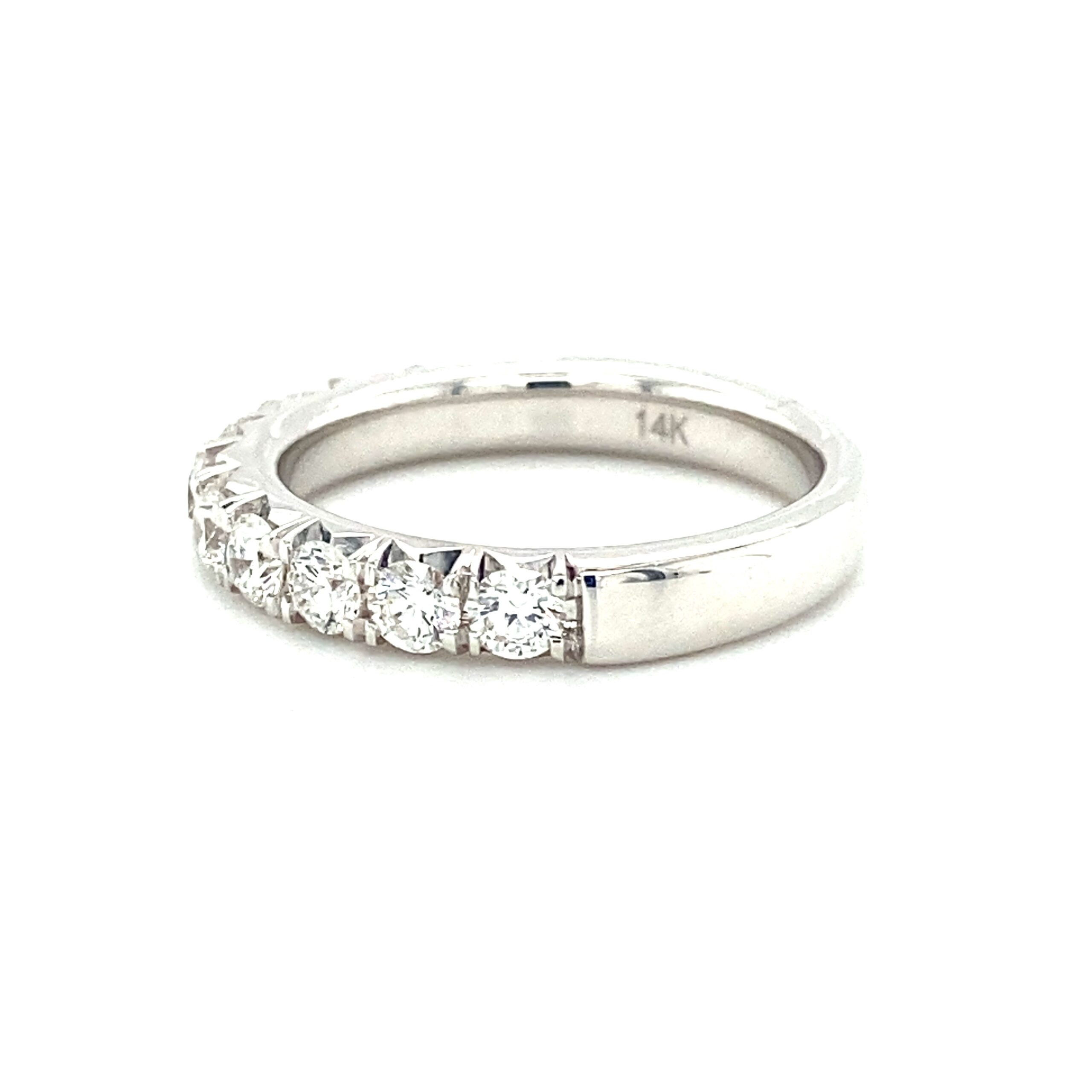 The 1.00ctw French Prong Diamond Band in 14 karat white gold features 11 round brilliant diamonds weighing 1.00ctw with G-H color and VS2-SI1 clarity in French cut-style prong settings. The top of the band measures 3.20mm wide and tapers to 3.13mm wide at the bottom of the shank. Stamped with “14K DFE.” Finger size 6.5.
