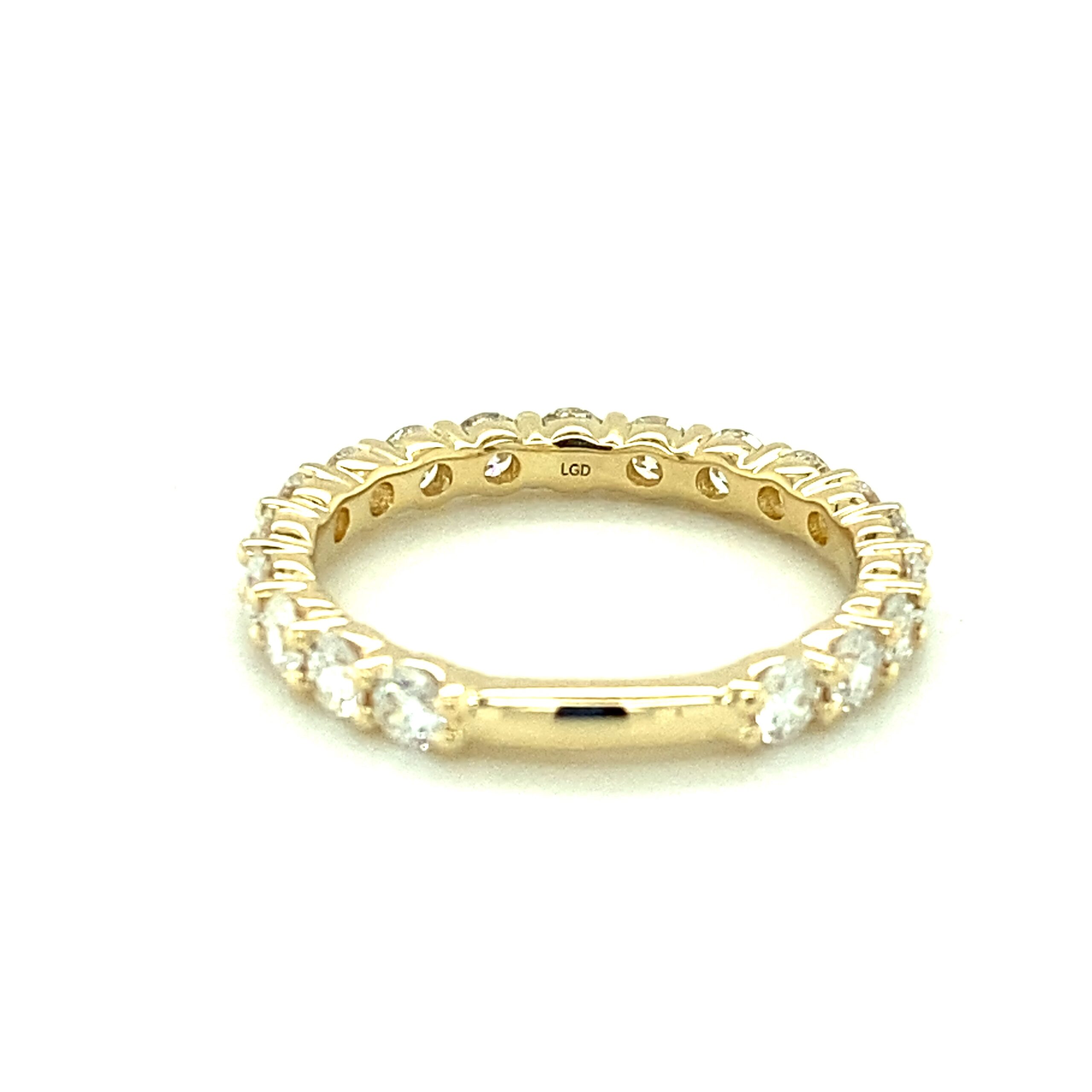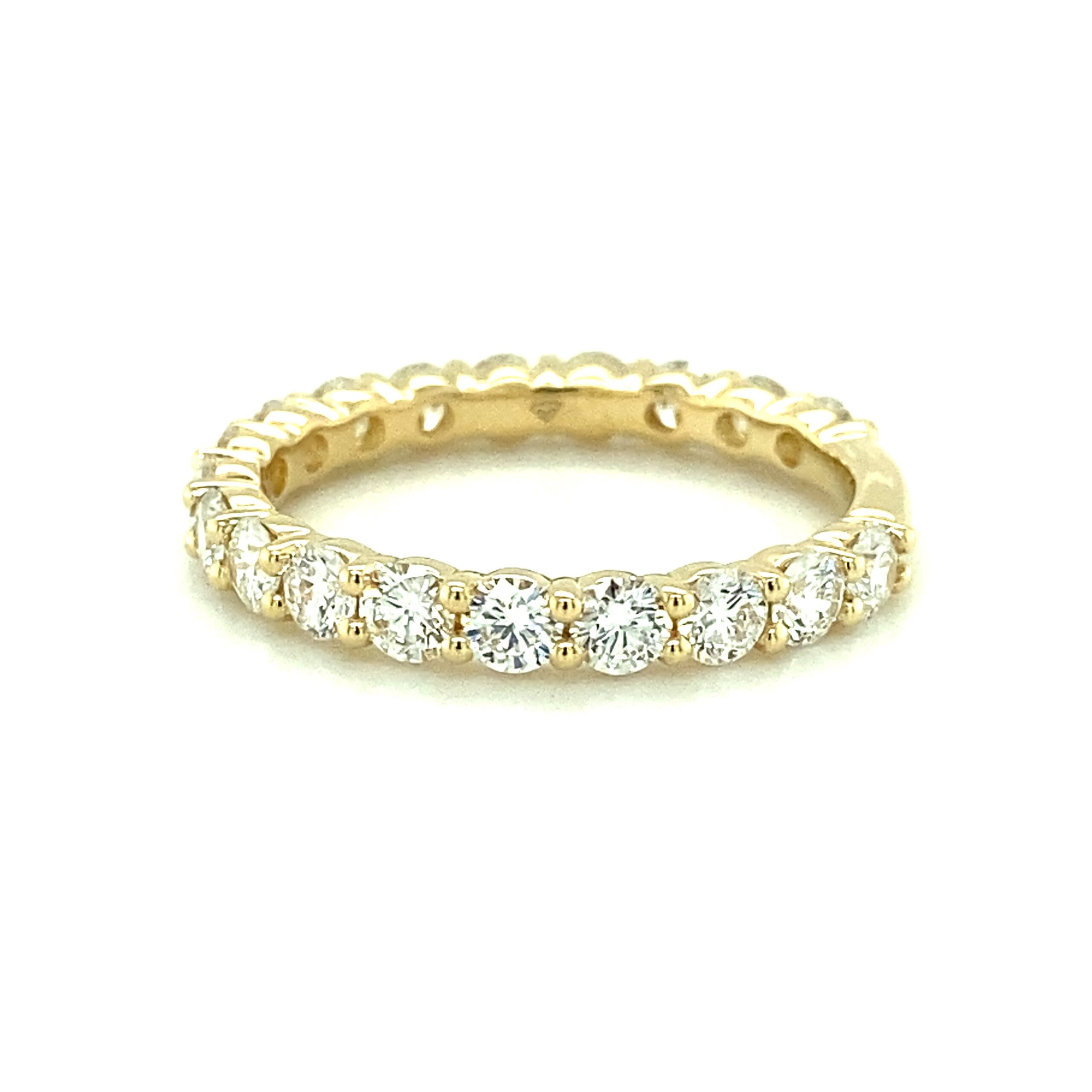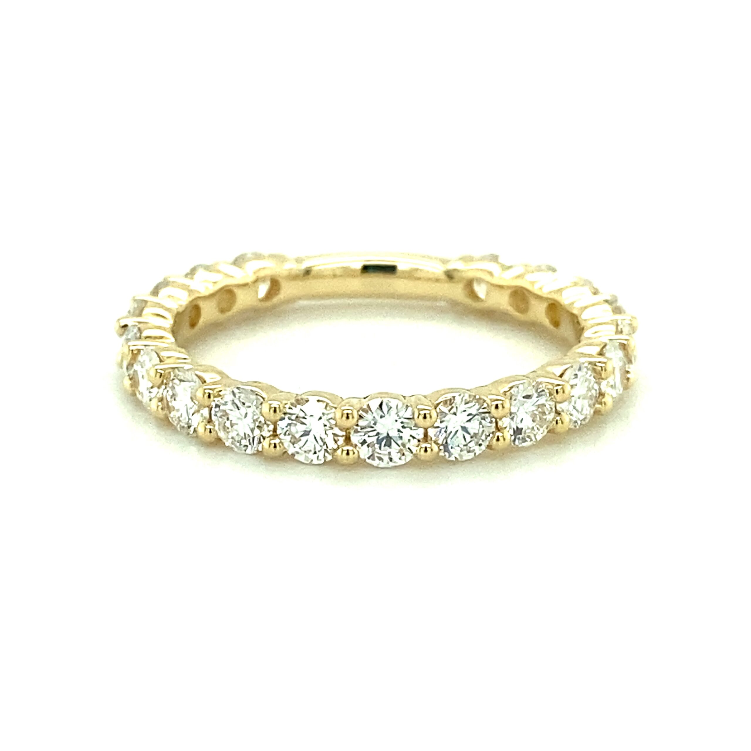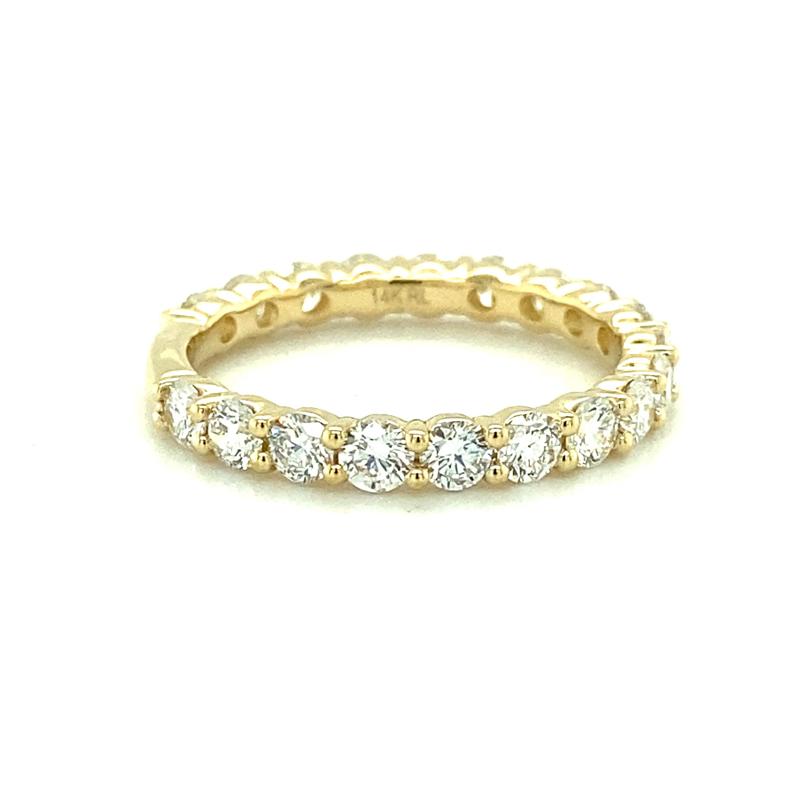 The 1.52ctw Lab-Grown Diamond Wedding Band in 14 karat yellow gold features 19 lab-grown round brilliant diamonds weighing 1.52ctw with G-H color and VS-SI1 clarity in shared prong settings.