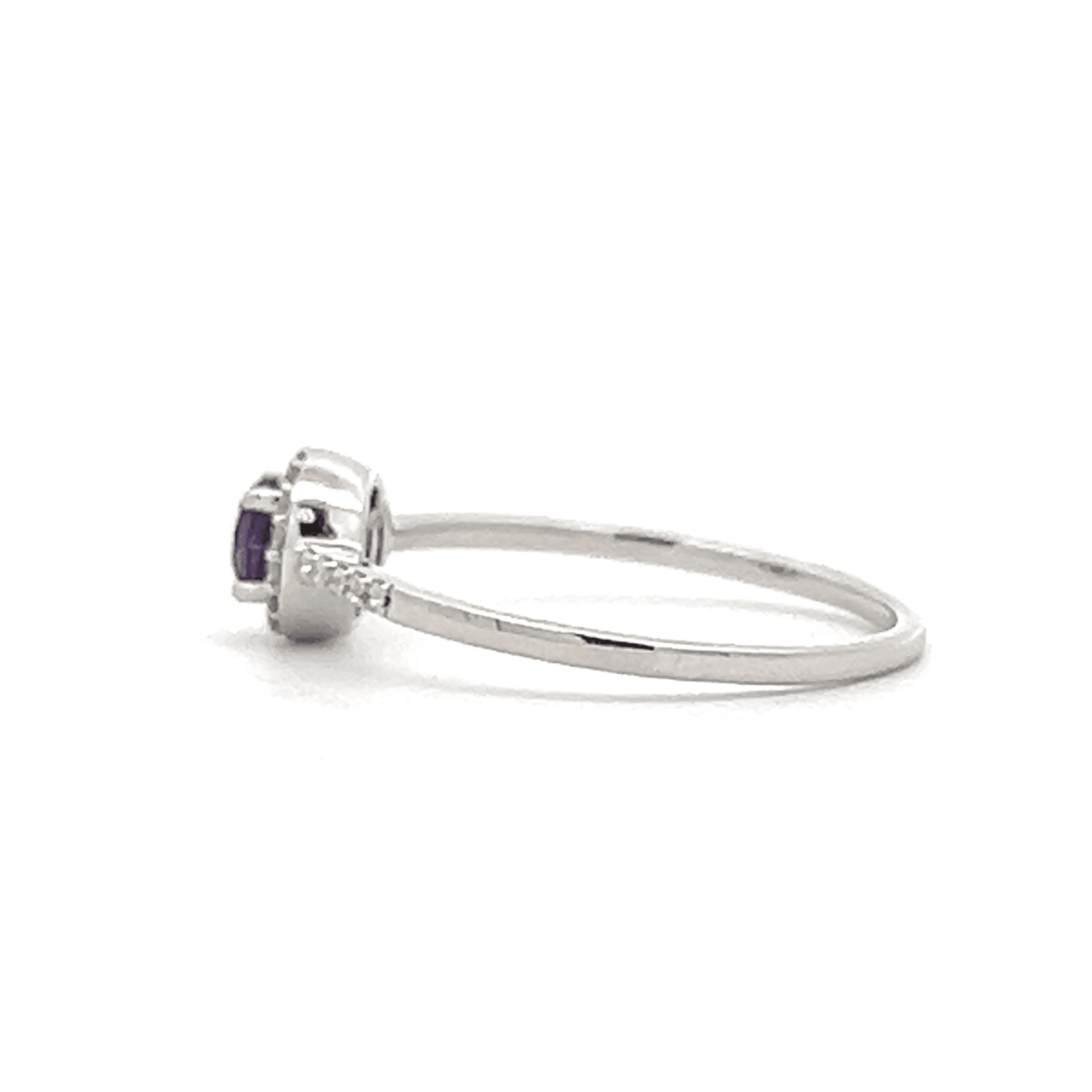 One 14 karat white gold ring set with one amethyst 4mm, 0.24 carat, surrounded by a halo of round brilliant diamonds and diamonds down the shank, 0.13 carat total weight with matching I/J color and SI1/SI2 clarity. The ring is a finger size 7.