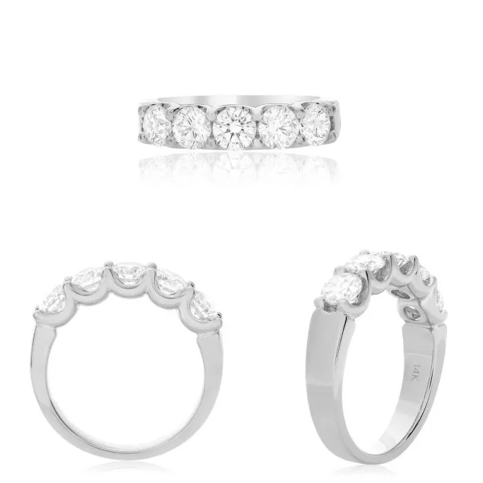 This 14K white gold wedding band features five round brilliant-cut diamonds, totaling 1.50 carats, in shared prong settings. The stones are GH color and SI clarity, arranged to showcase maximum light and fire.
