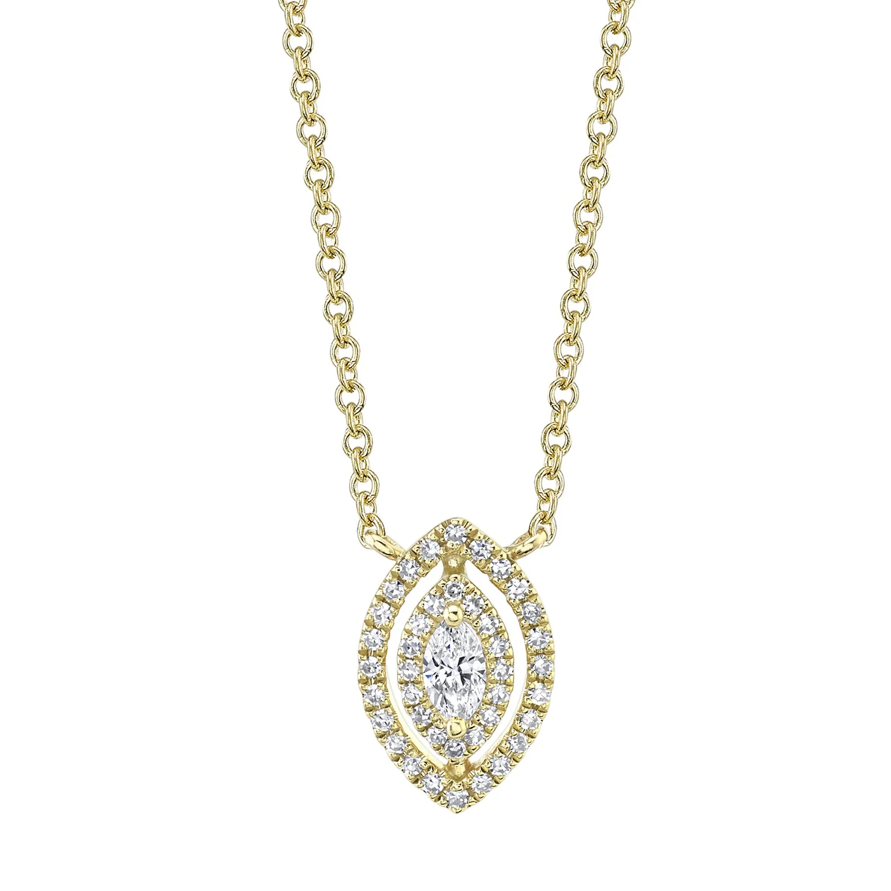 One (1) 14 karat yellow gold necklace featuring 0.18 carat total weight of diamond with a matching quality of GH/SI2. This necklace features a marquise shape design with two (2) halos around the center stone. The pendant is fixed in the middle of an 18 inch cable chain, complete with a high polish finish and lobster clasp closure with the ability to be worn at 18, 17, and 16 inches.