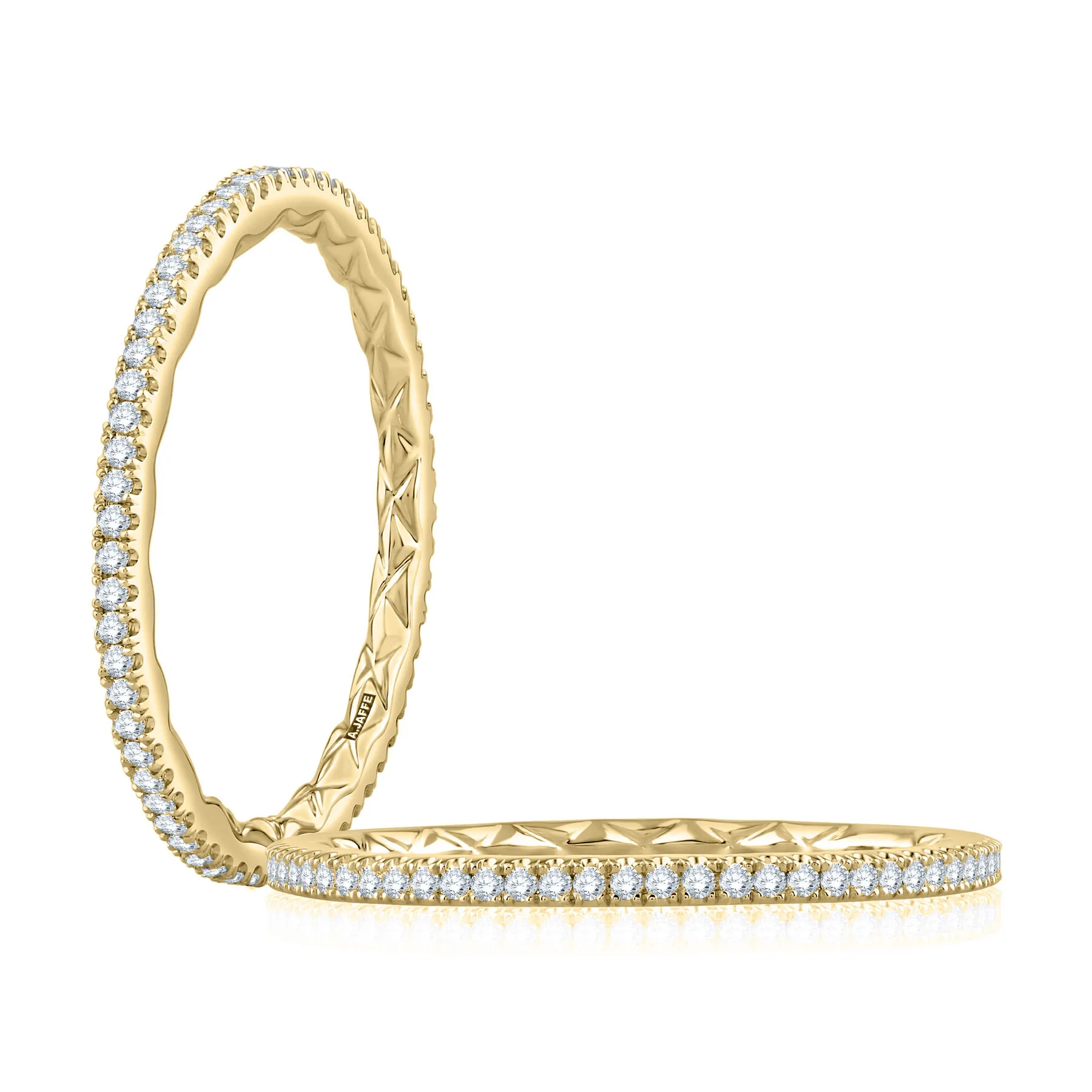 Crafted in 14K yellow gold, this A.JAFFE diamond eternity wedding band features 62 round brilliant-cut diamonds wrapping around the finger in a seamless full-circle design. With 0.25 carats total weight and a signature quilted interior, it blends delicate sparkle with everyday comfort.