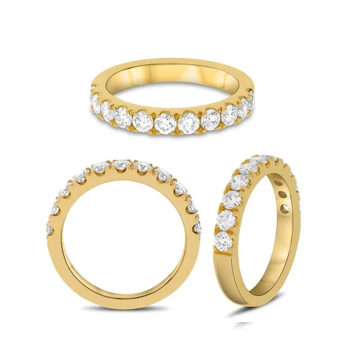 This 14K yellow gold band features 11 round brilliant-cut diamonds, totaling 1.00 carat, set in classic micro pave settings. The diamonds are GH color and SI clarity, delivering bold sparkle from every angle.