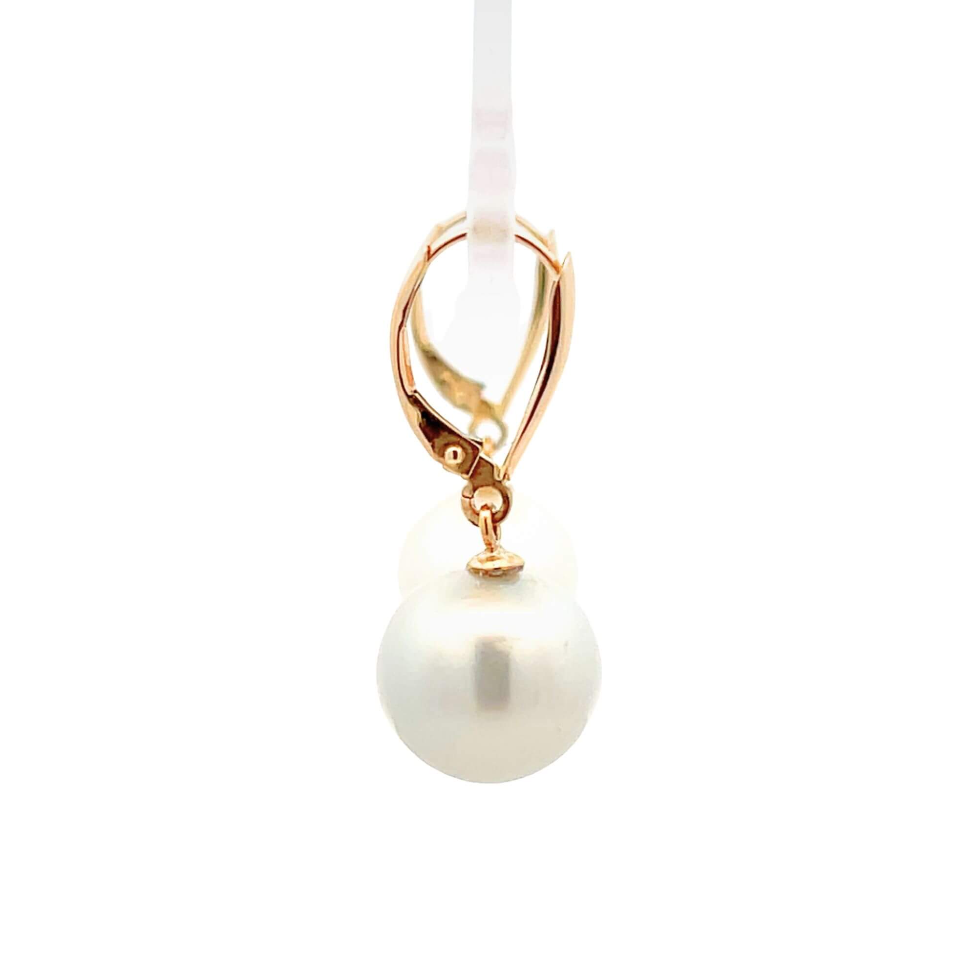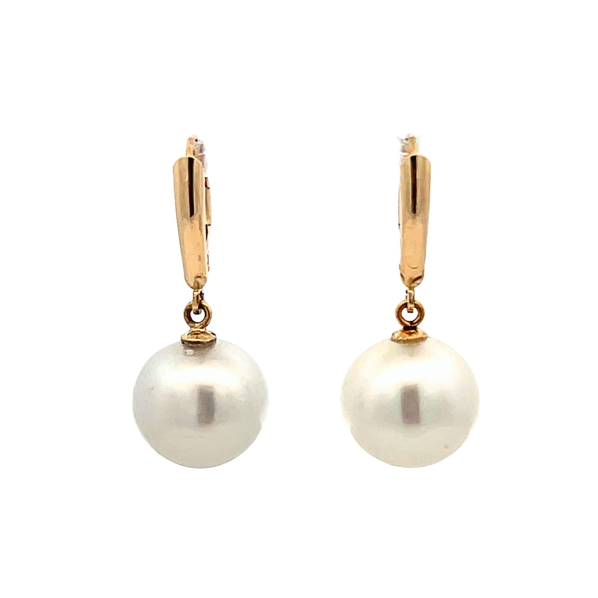 These dangle earrings are crafted in solid 14K yellow gold and feature two AA-grade South Sea pearls measuring 12mm each, chosen for their luminous luster and smooth, rounded form. The pearls are suspended from polished gold leverback settings that provide both visual balance and secure wear. With their generous size and clean construction, the design highlights the natural beauty of the pearls without additional embellishment.
