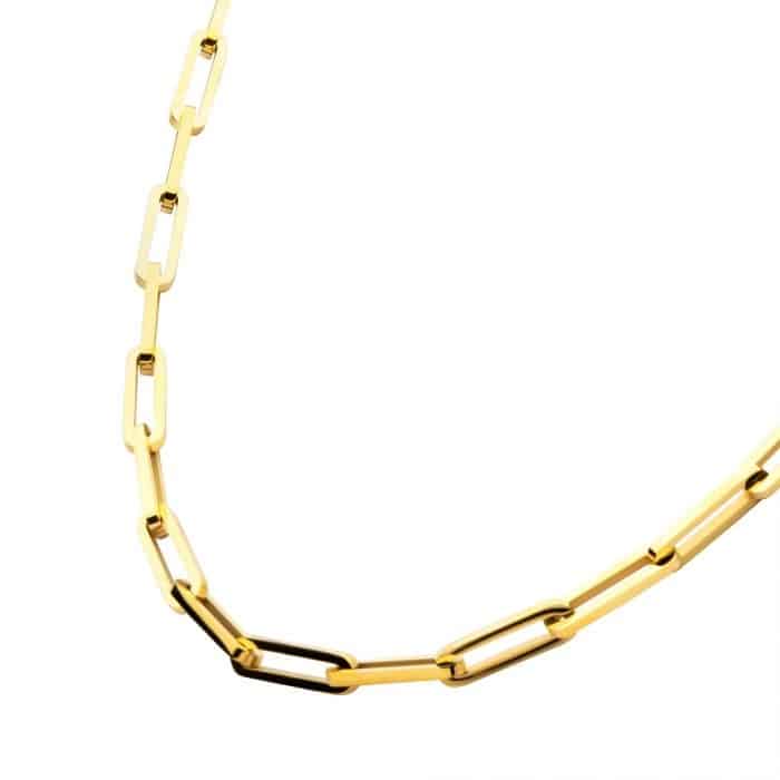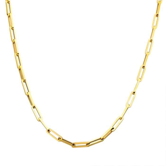 The 18k Gold Ion-Plated Paperclip Chain Necklace is crafted from stainless steel with ion-plated 18 karat yellow gold and features square-shaped paperclip-style links measuring 6mm x 20mm. The necklace measures 22″ long.