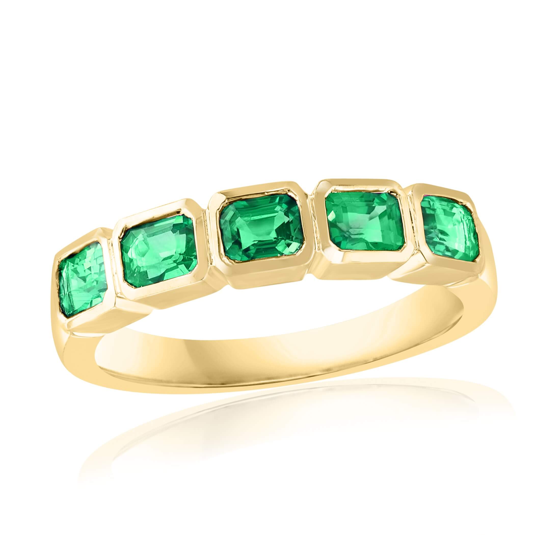 One 18 karat yellow gold band bezel set with five emerald cut emeralds, 1.02 carats total weight.