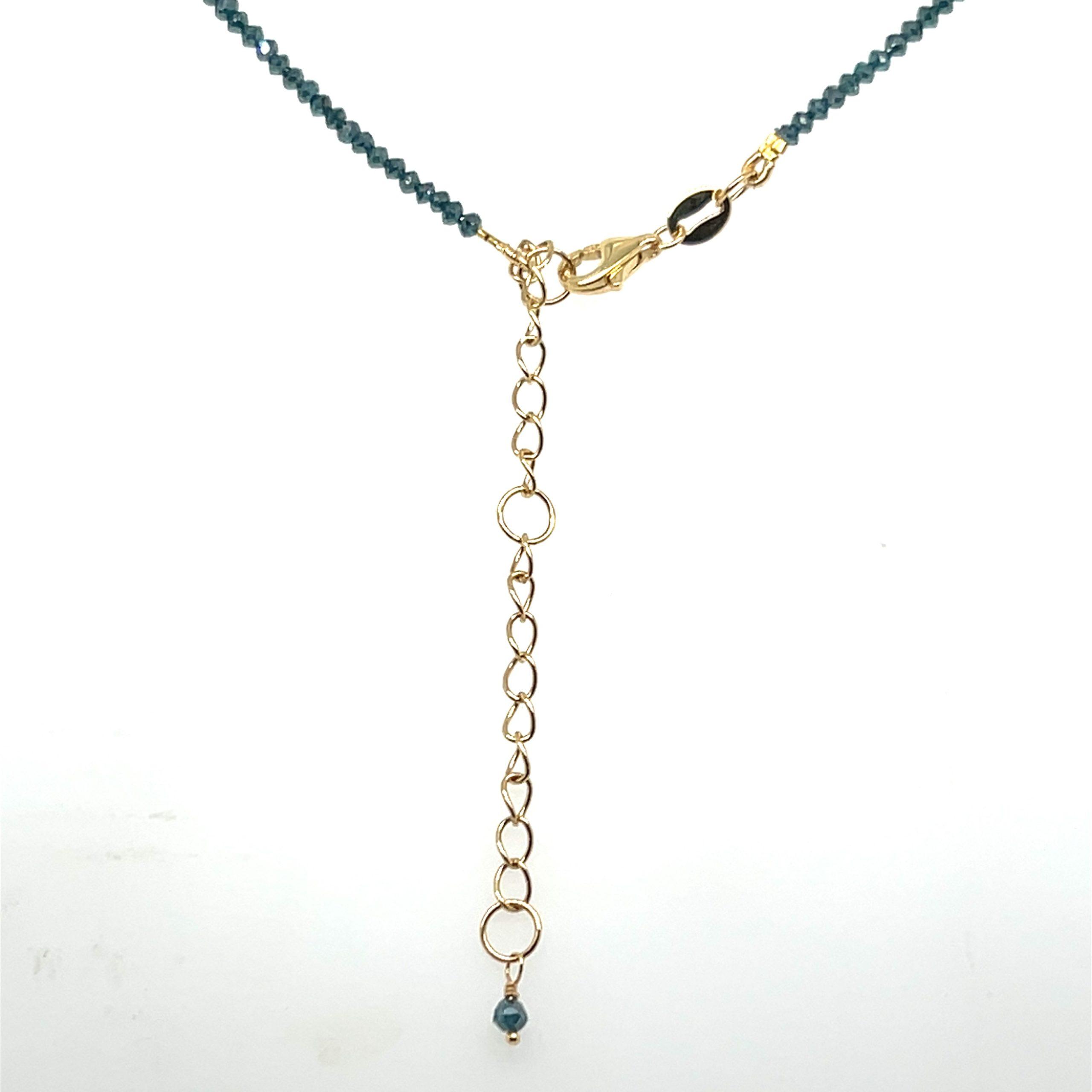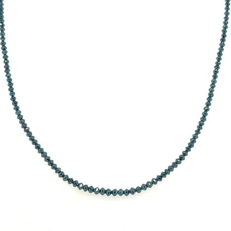 This 18k yellow gold necklace is crafted with 16.00 carats of bead faceted blue diamonds. The blue diamonds pair sparkle with color to give you a simple and unique addition to your necklace collection. This necklace is a show stopper when worn alone; but when worn with other necklaces, this piece is an brilliant enhancer to any necklace stack. This necklace is adjustable at 18-16 inches.