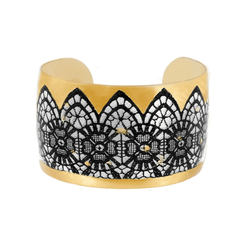 This cuff bracelet by Evocateur features a dramatic black lace pattern set against a luminous background of 22K gold leaf. The wide 1.5-inch cuff creates a bold visual impact, while the intricate lace motif adds depth, contrast, and a refined graphic quality. Framed by polished gold-toned edges, the design feels intentional and artful, balancing ornate detail with a clean, structured form.