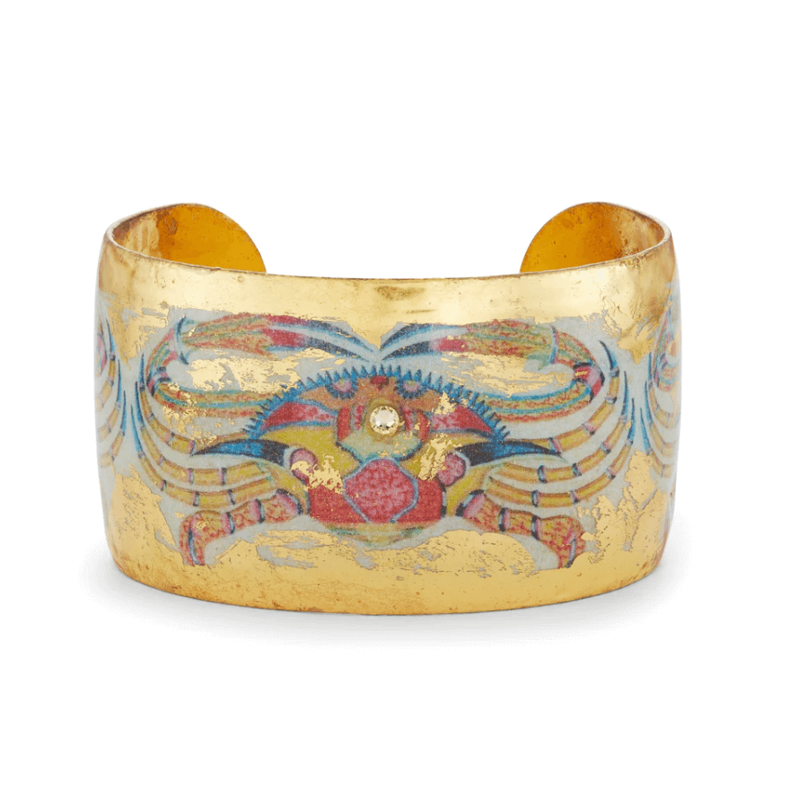 This cuff bracelet by Evocateur features a vivid crab motif rendered in rich, layered color and framed by luminous 22K gold leaf. The wide 1.5-inch cuff provides a bold canvas for the design, allowing the intricate detailing and painterly textures to stand out against the warm gold background. Polished gold-toned edges complete the piece, giving it a refined structure that balances its artistic character.
