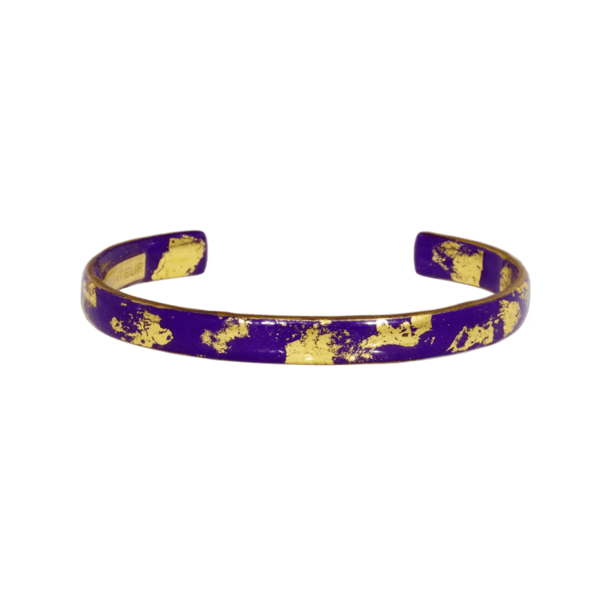 This cuff bracelet by Evocateur features a rich island purple enamel surface accented with luminous 22K gold leaf, creating a bold yet refined contrast. The slim 1/4-inch profile keeps the design sleek and lightweight, while the gold leaf adds organic texture and warmth against the saturated purple background. Polished gold-toned edges frame the cuff, giving it a clean, finished look that balances color with craftsmanship.