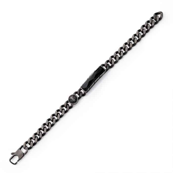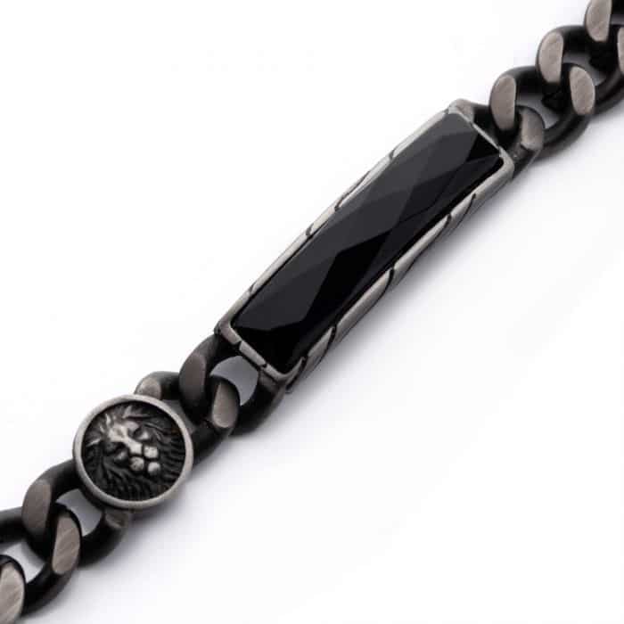 The Black Agate and Lions Head Gun Metal Bracelet features a stainless steel base with an ion-plated matte finish gun metal coating. Accenting the curb chain is a round lion’s head sigil and a rectangular-shaped faceted black agate. The bracelet measures 8.5″ long and is secured with a lobster claw clasp.