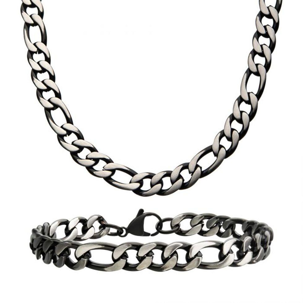 This black steel set features a brushed Figaro link necklace and matching bracelet.