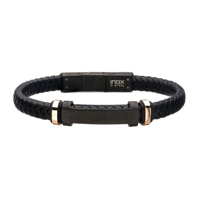 Gent’s stainless steel 8 mm black and rose gold plated engraved with black braided leather ID bracelet, 8.5″ long includes 0.5″ self adjustable link.