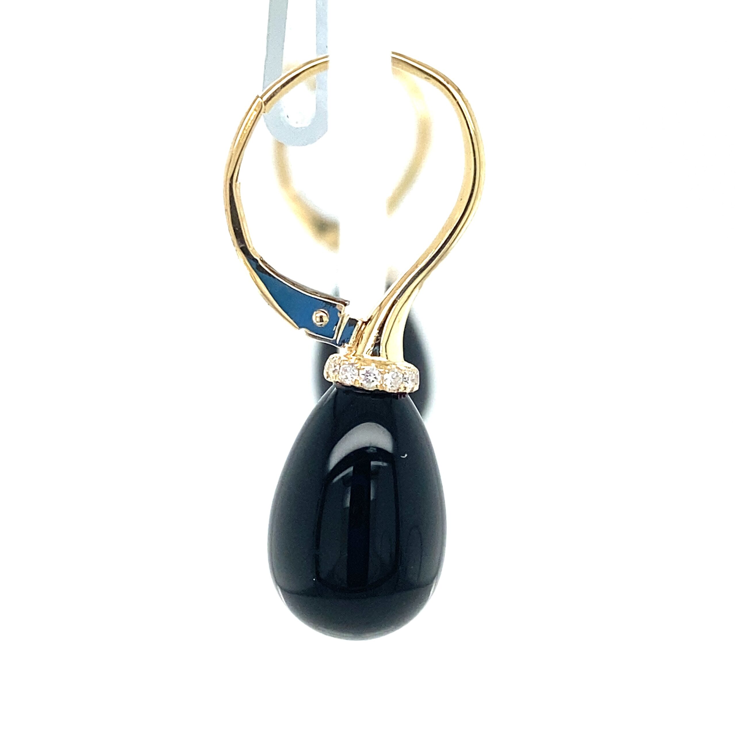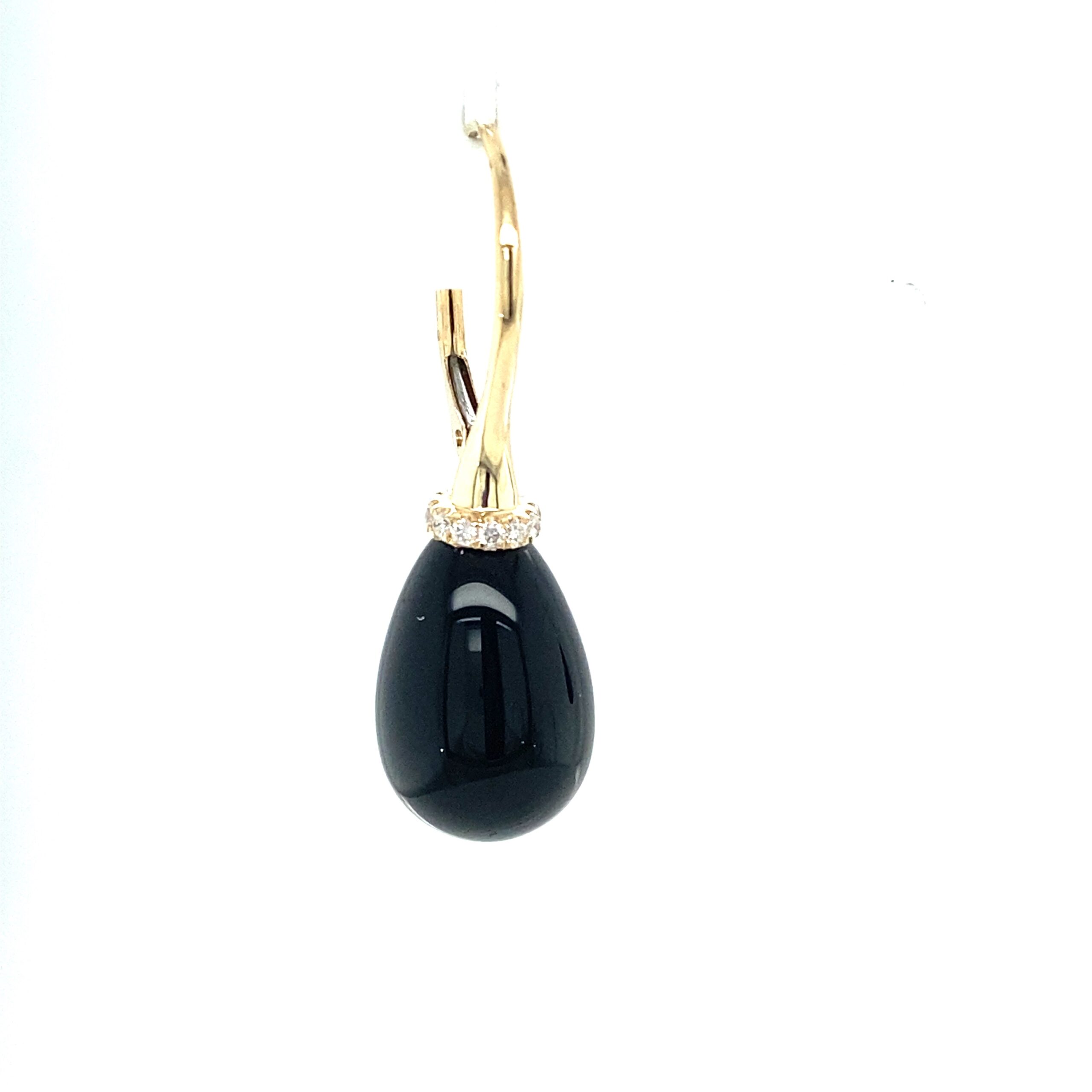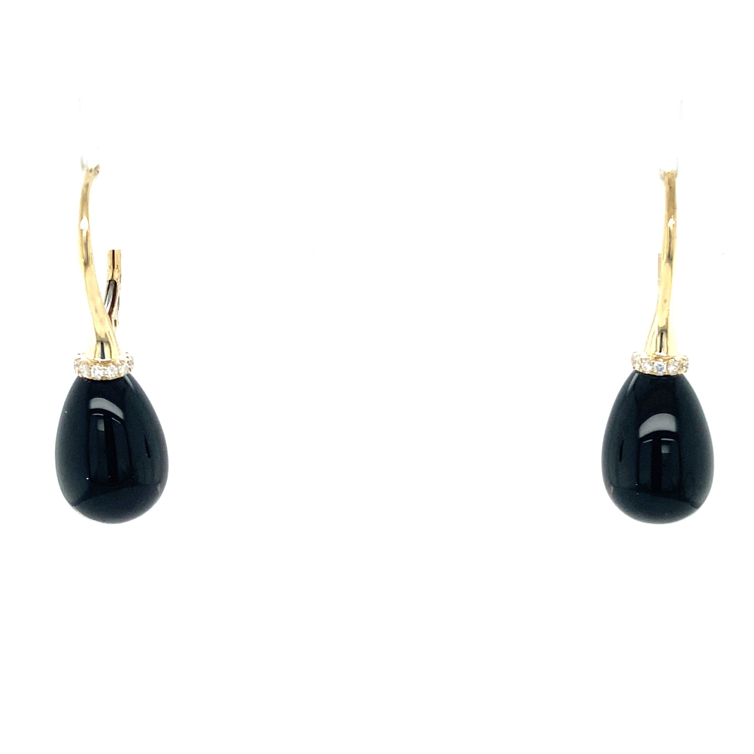 The Black Onyx and Diamond Drop Earrings in 14 karat yellow gold feature 2 polished pear-shaped black onyx drops measuring 13mm x 9mm and weighing 14.60ctw accented by 24 round brilliant diamonds weighing 0.11ctw with H-I color and SI2-I1 clarity. The earrings are secured with lever back closures.