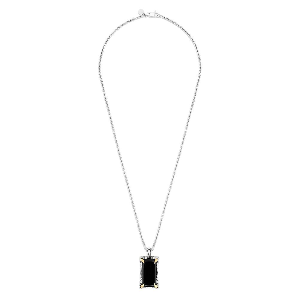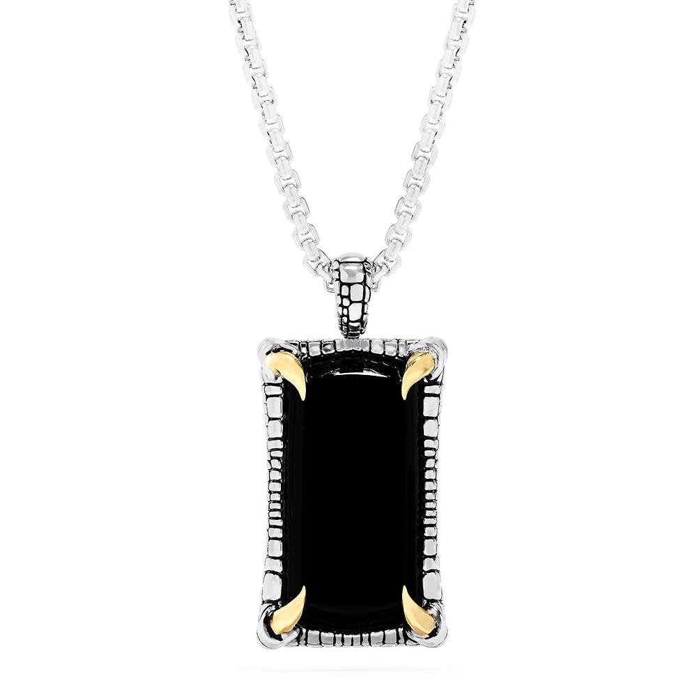 The Black Onyx Pendant in sterling silver features a rectangle-shaped cabochon black onyx measuring 20.43mm wide x 42.05mm long in 18k yellow gold claw prongs. The pendant is suspended from a sterling silver rounded box link chain measuring 2.67mm wide and 22″ long.