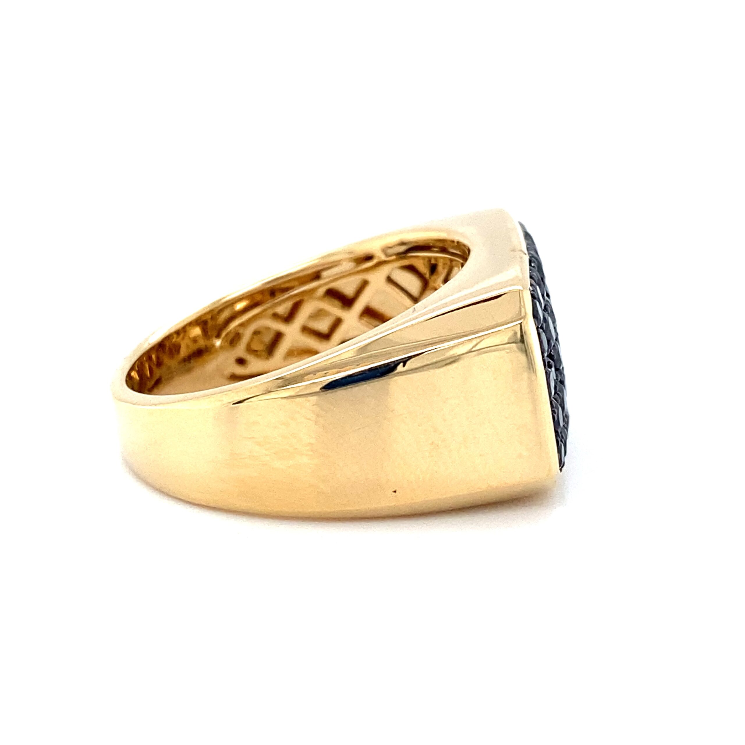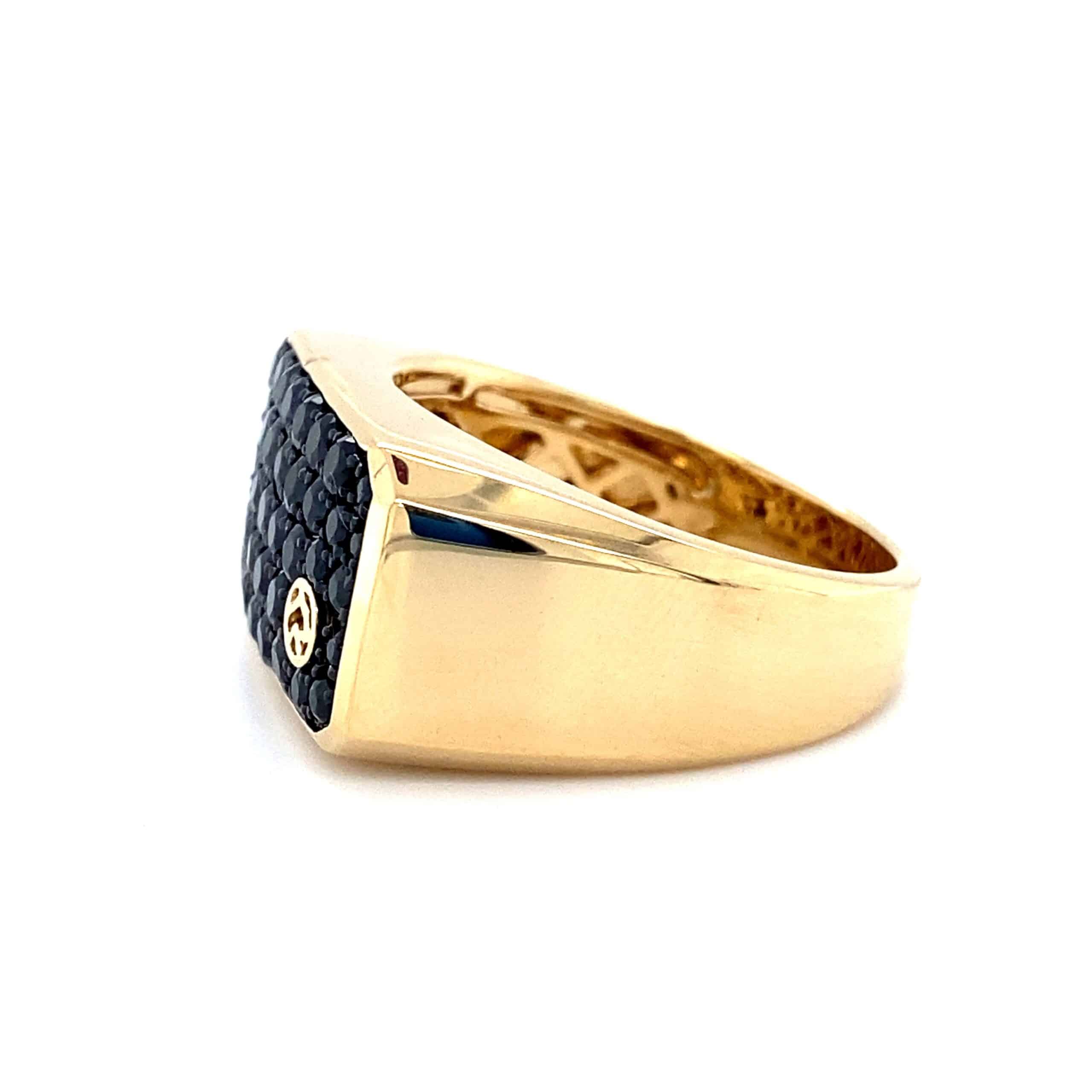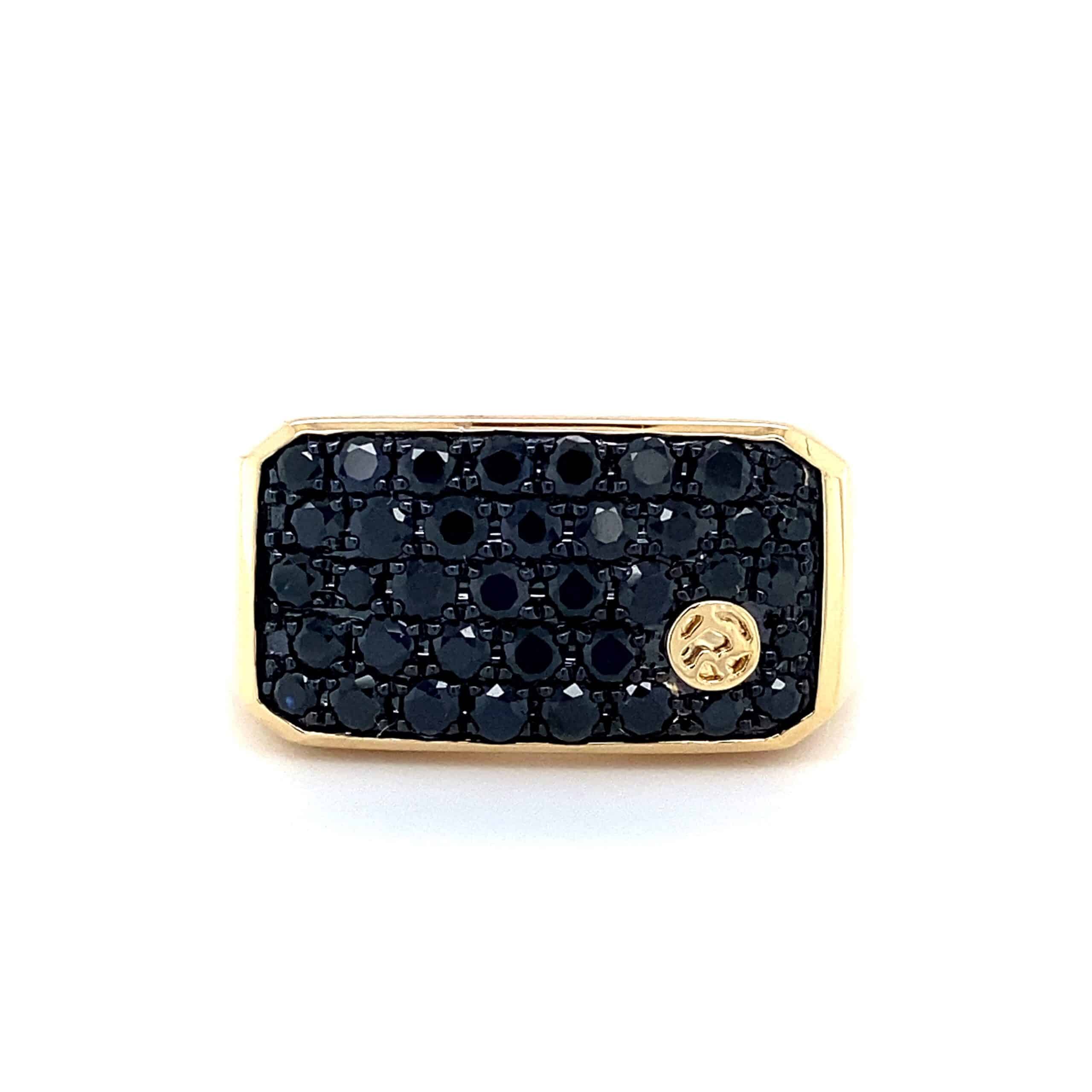 The Black Sapphire Signet Ring in 14 karat yellow gold features 38 round-faceted black sapphires weighing 1.74ctw pave set in a signet-style ring. Finger size 10.25.