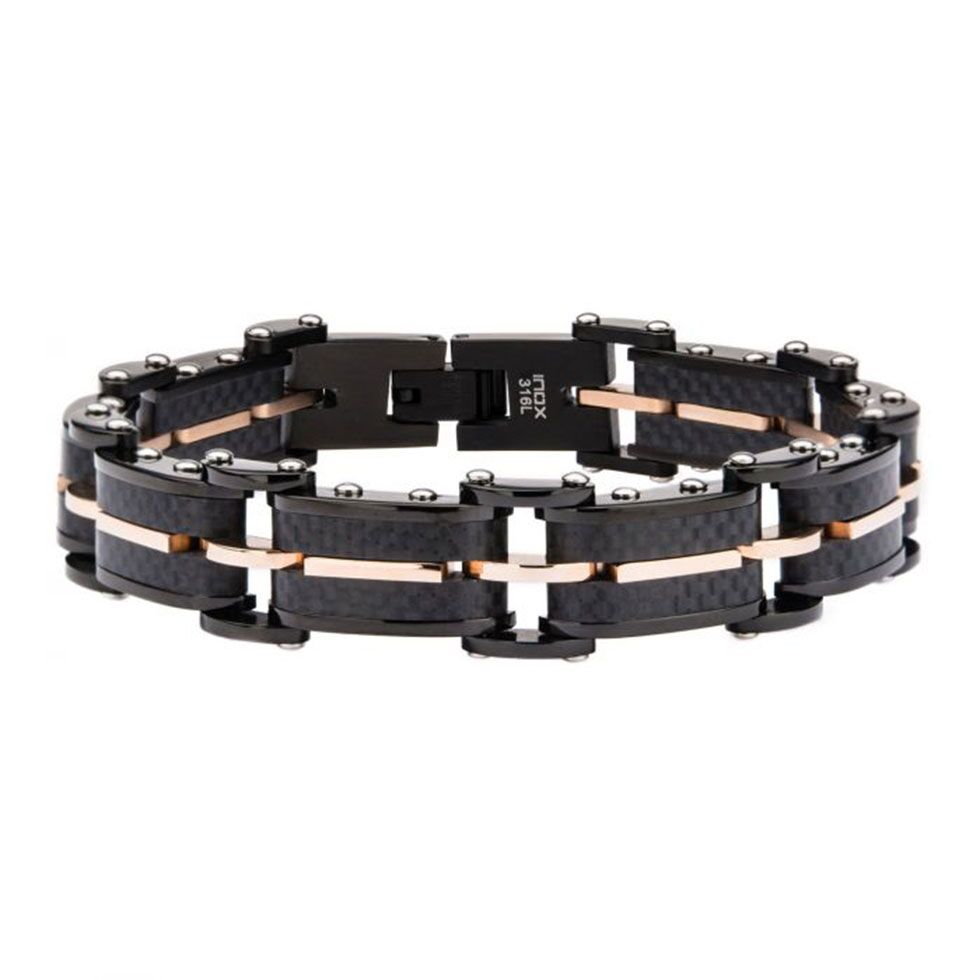 This black stainless steel bracelet features solid carbon graphite and rose gold plated links.