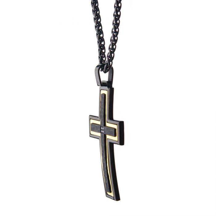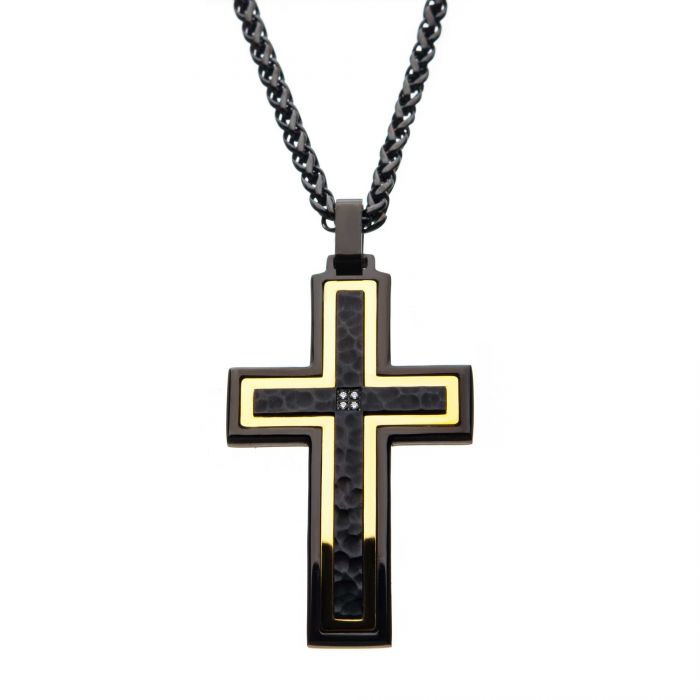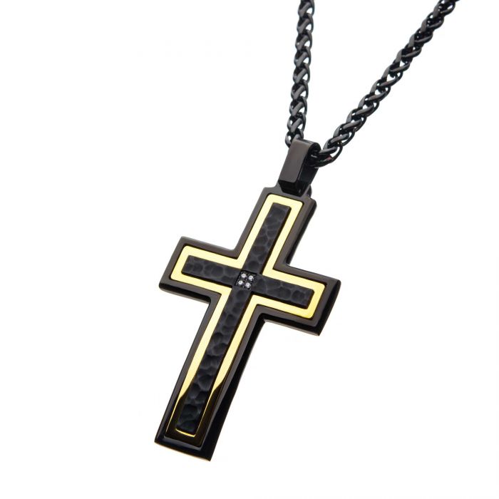 Cross pendant with hammered finish made from black stainless steel and gold IP with CZ accents on a 24″ long chain.