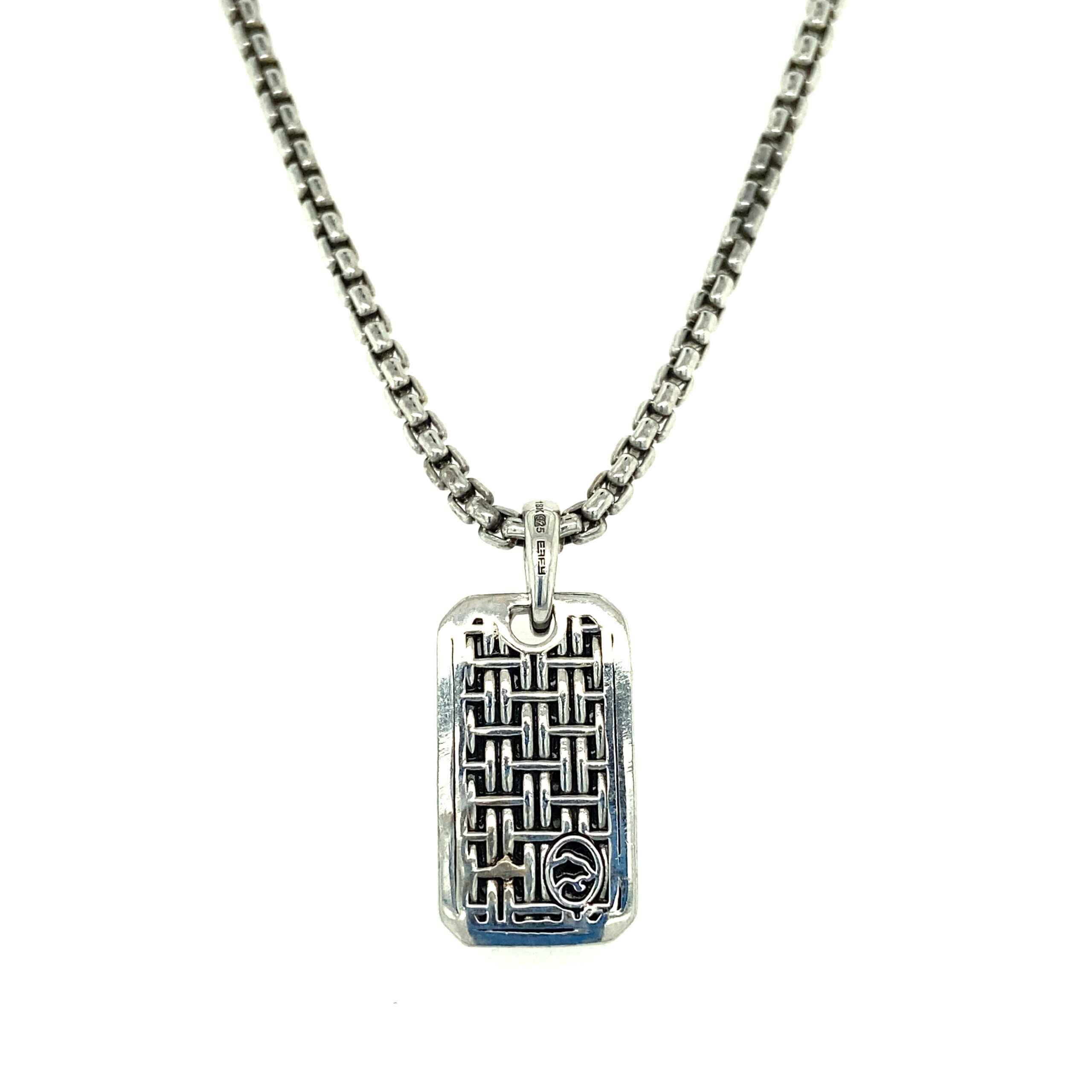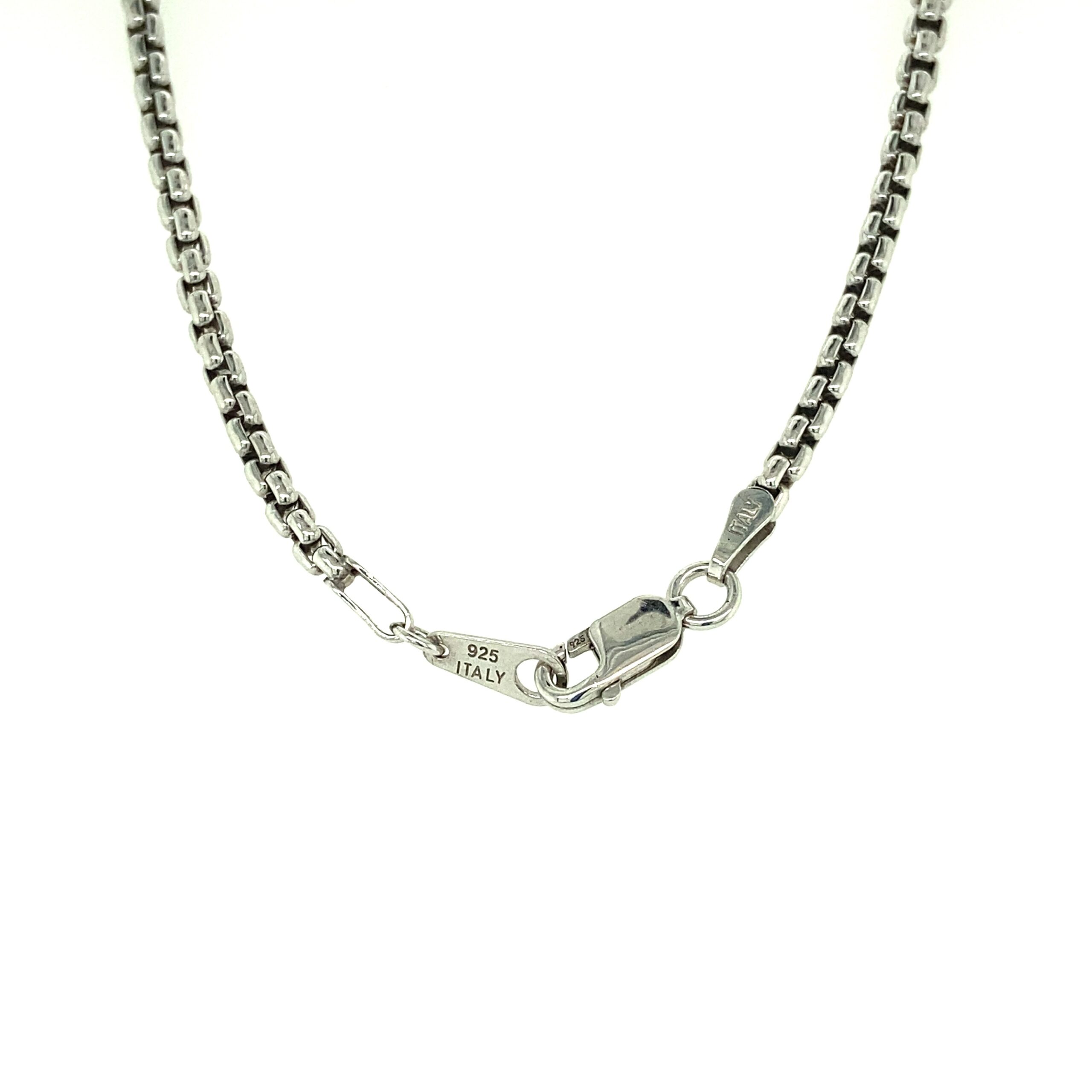 The pendant measures 11.57mm wide x 26.26mm long and is suspended from a rounded box chain measuring 2.61mm wide and 22″ long. The chain is secured with a lobster claw clasp.