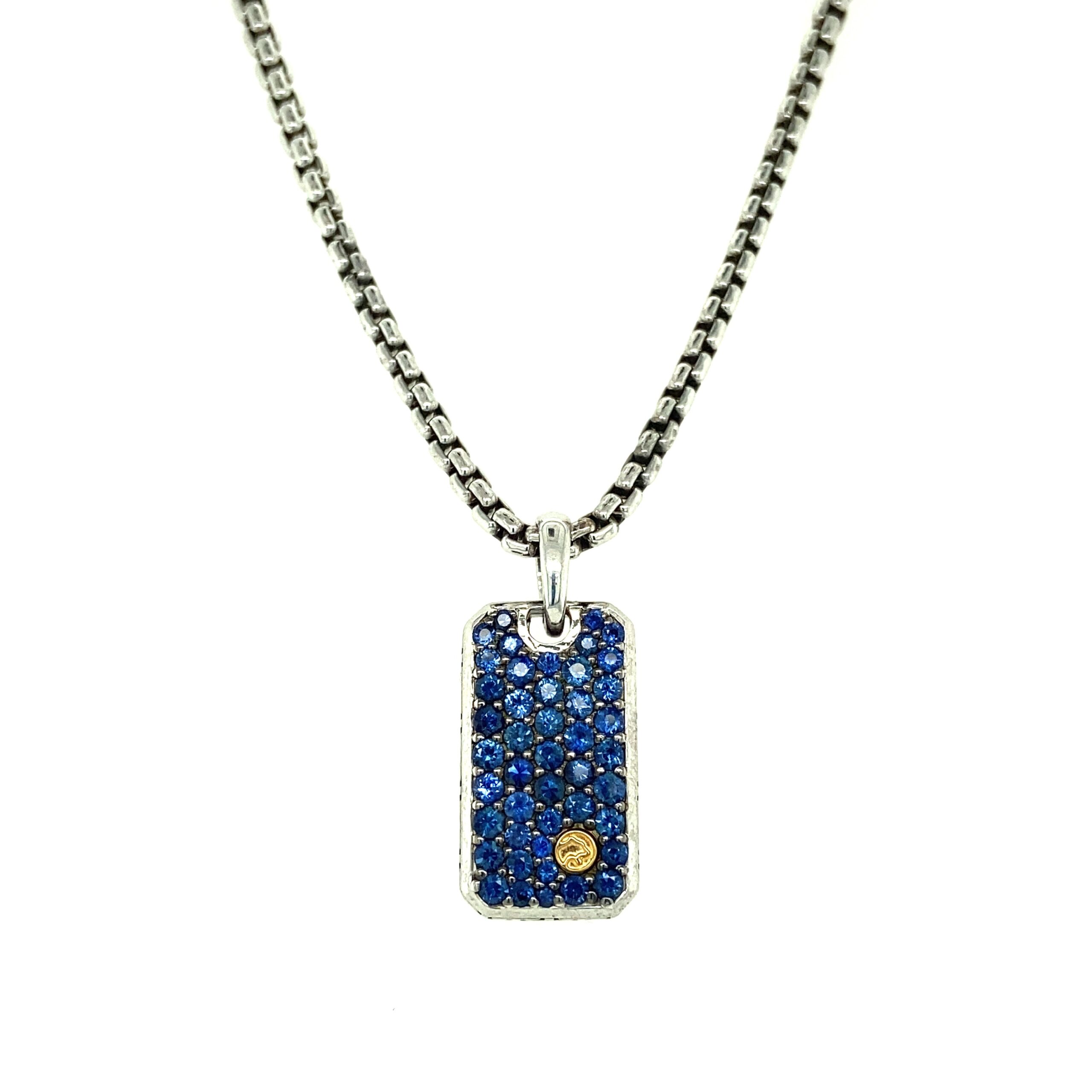 The Blue Sapphire Dog Tag Pendant Necklace features 45 round-faceted blue sapphires weighing 1.40ctw in pave settings with a round 18k yellow gold accent.