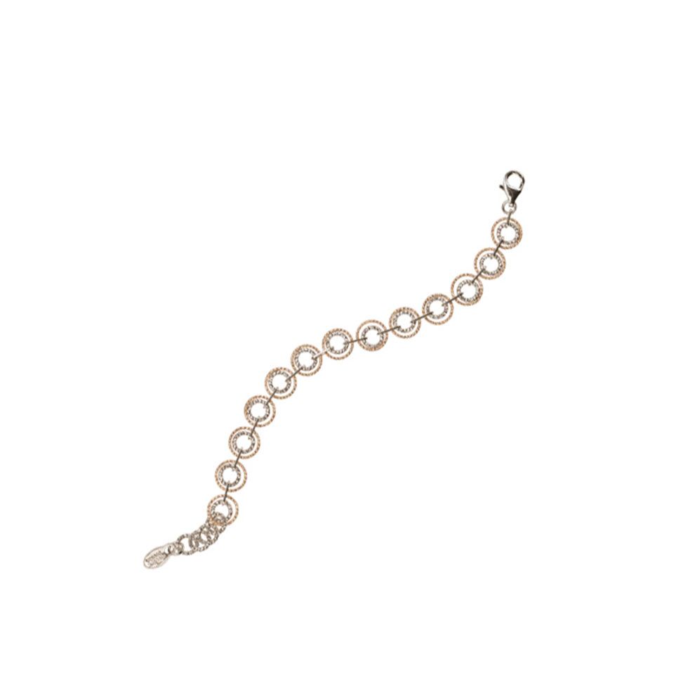 This sterling silver bracelet features diamond-cut rose gold plated open circles inside diamond-cut sterling silver open circles connected by sterling silver bar links.