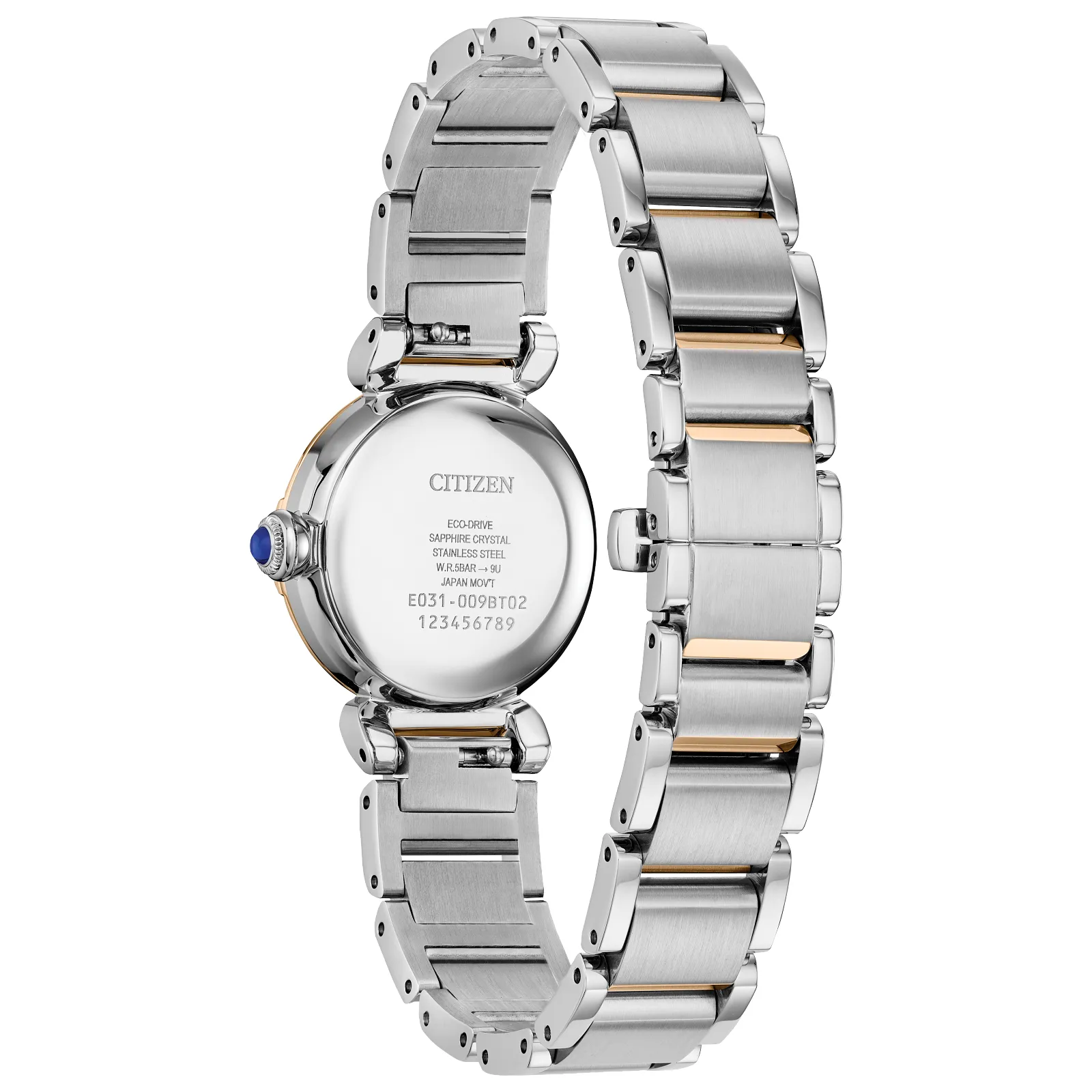 Delicate in size but rich in detail, the Citizen L Mae pairs elegant design with sustainable technology. Its 26mm two-tone stainless steel case features a raised spherical sapphire crystal that adds visual depth while protecting the dial with exceptional scratch resistance. A luminous white mother-of-pearl face and blue-tinted hands bring subtle color and texture to this timeless design.