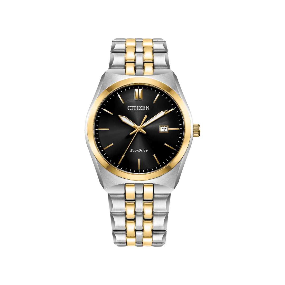 A time-honored watch with clean lines and simple accents, this watch will never go out of style. Featuring stainless steel with a black dial, gold-tone accents, mineral crystal, and date. Add a classic style to your wardrobe with this Corso timepiece. Featuring Citizen’s Eco-Drive technology – powered by light. It never needs a battery. Caliber number E111.