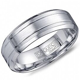 The Cobalt Double Groove Comfort Fit Band is a 7mm wide band featuring a double groove design with a satin finish and beveled edges. Finger size 10.