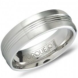 The Cobalt Grooved Center Comfort Fit Band is a pipe cut-style band that measures 7mm wide and features a grooved center with satin finish edges. Finger size 10. From the Torque Collection by Crown Ring.