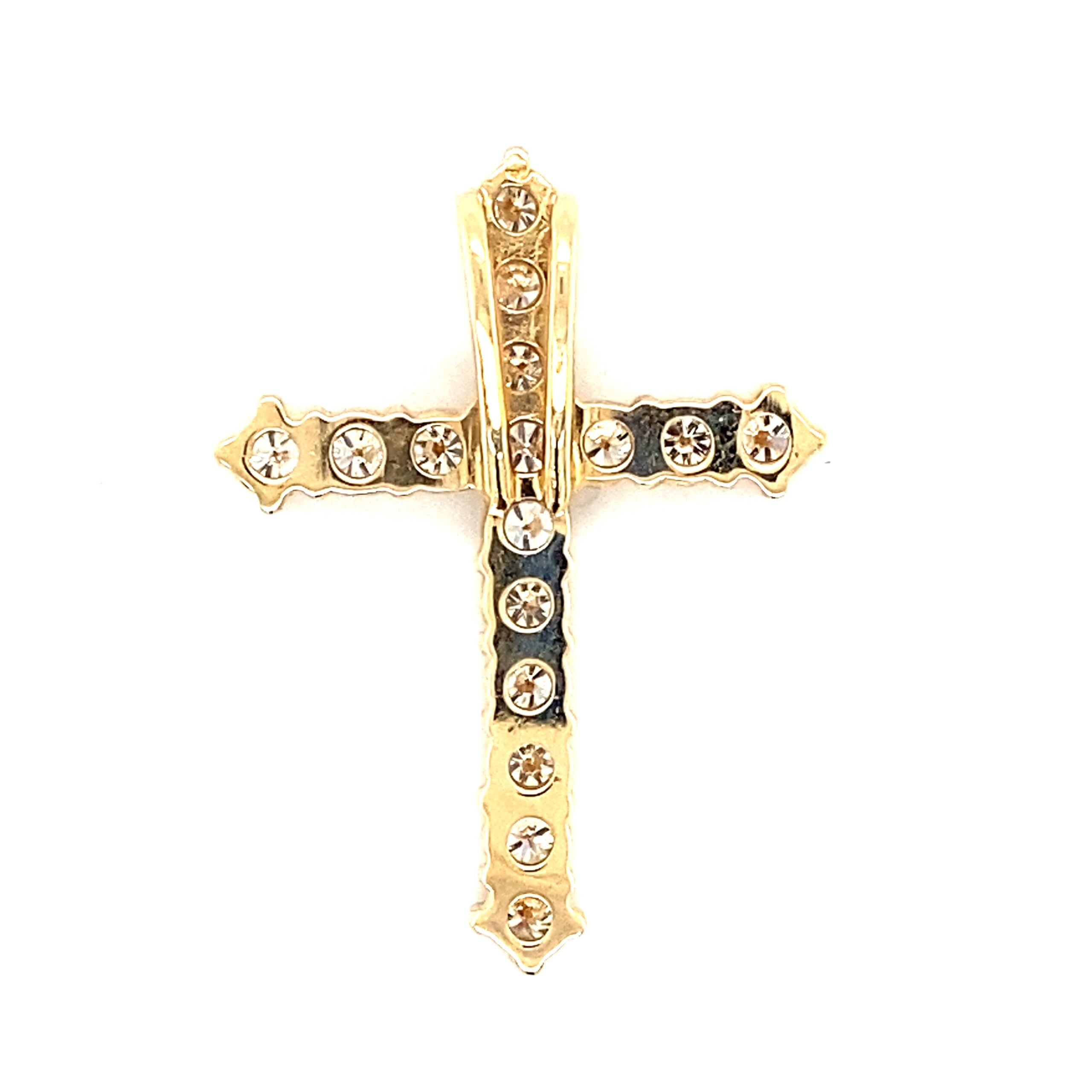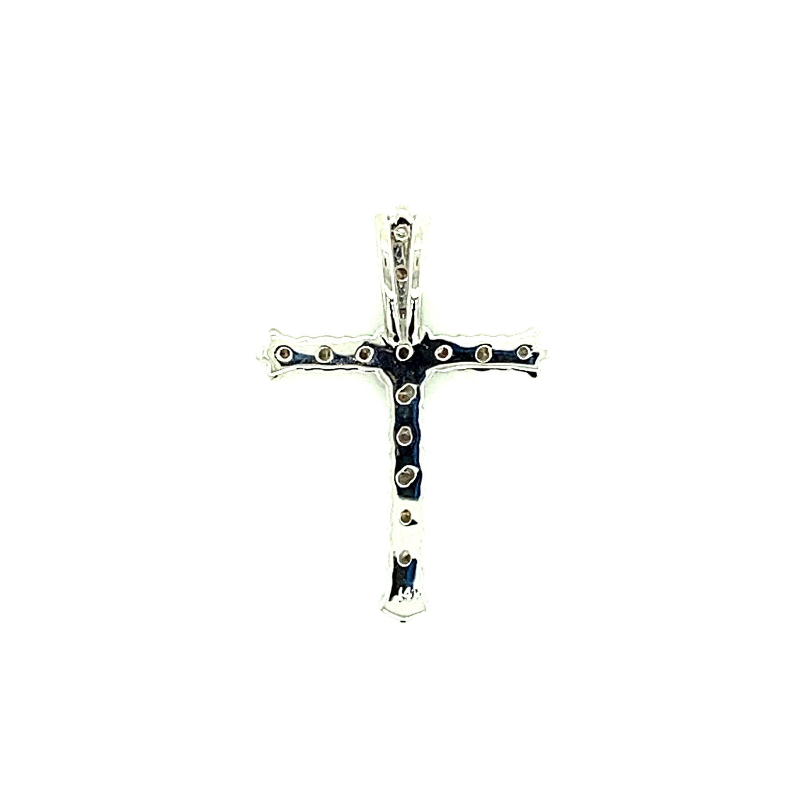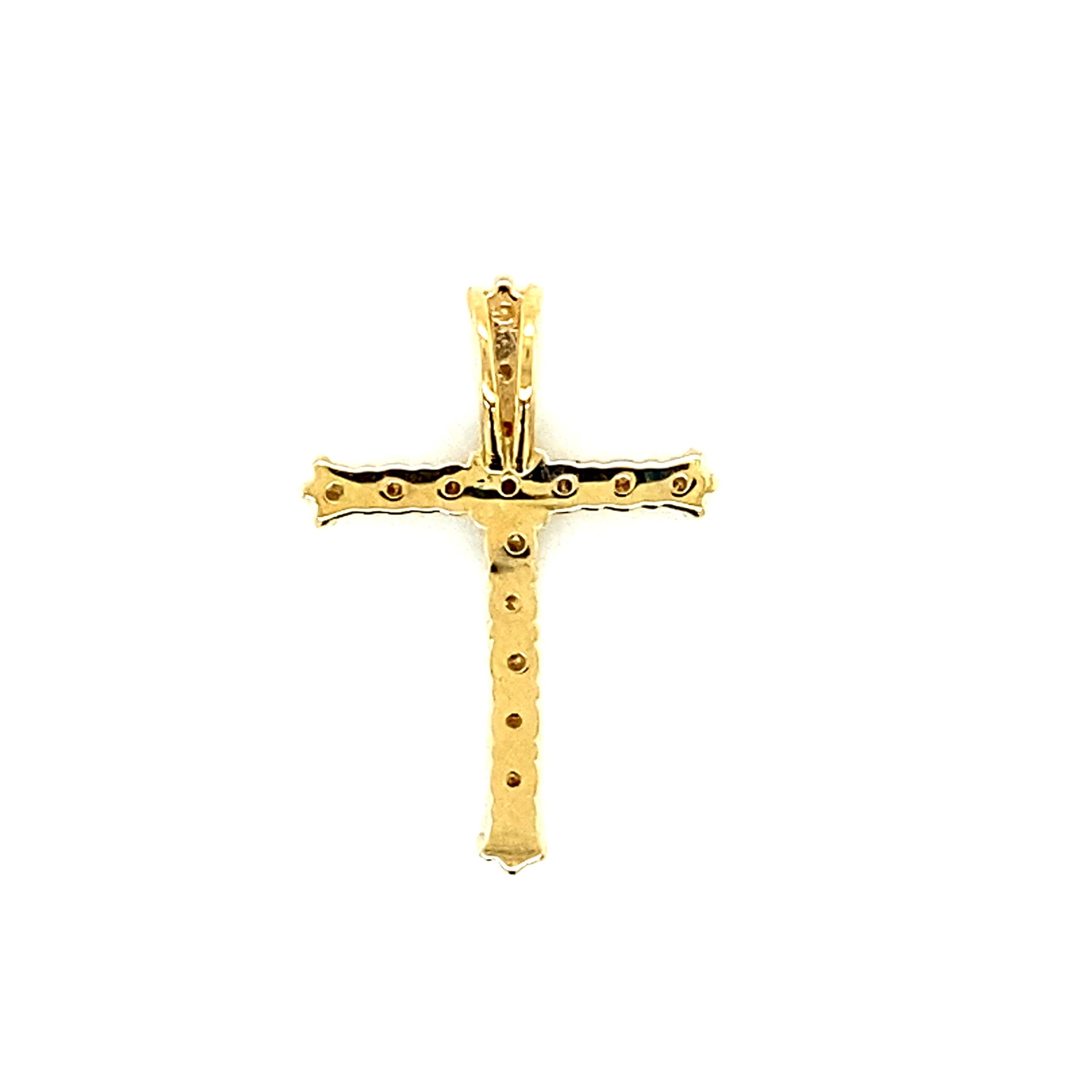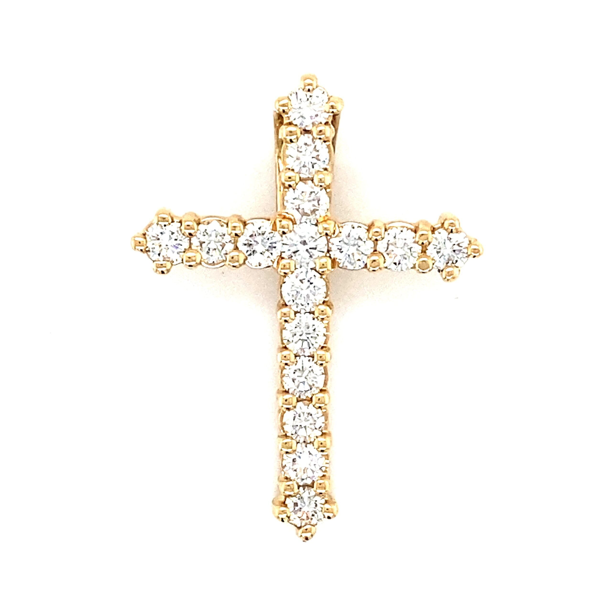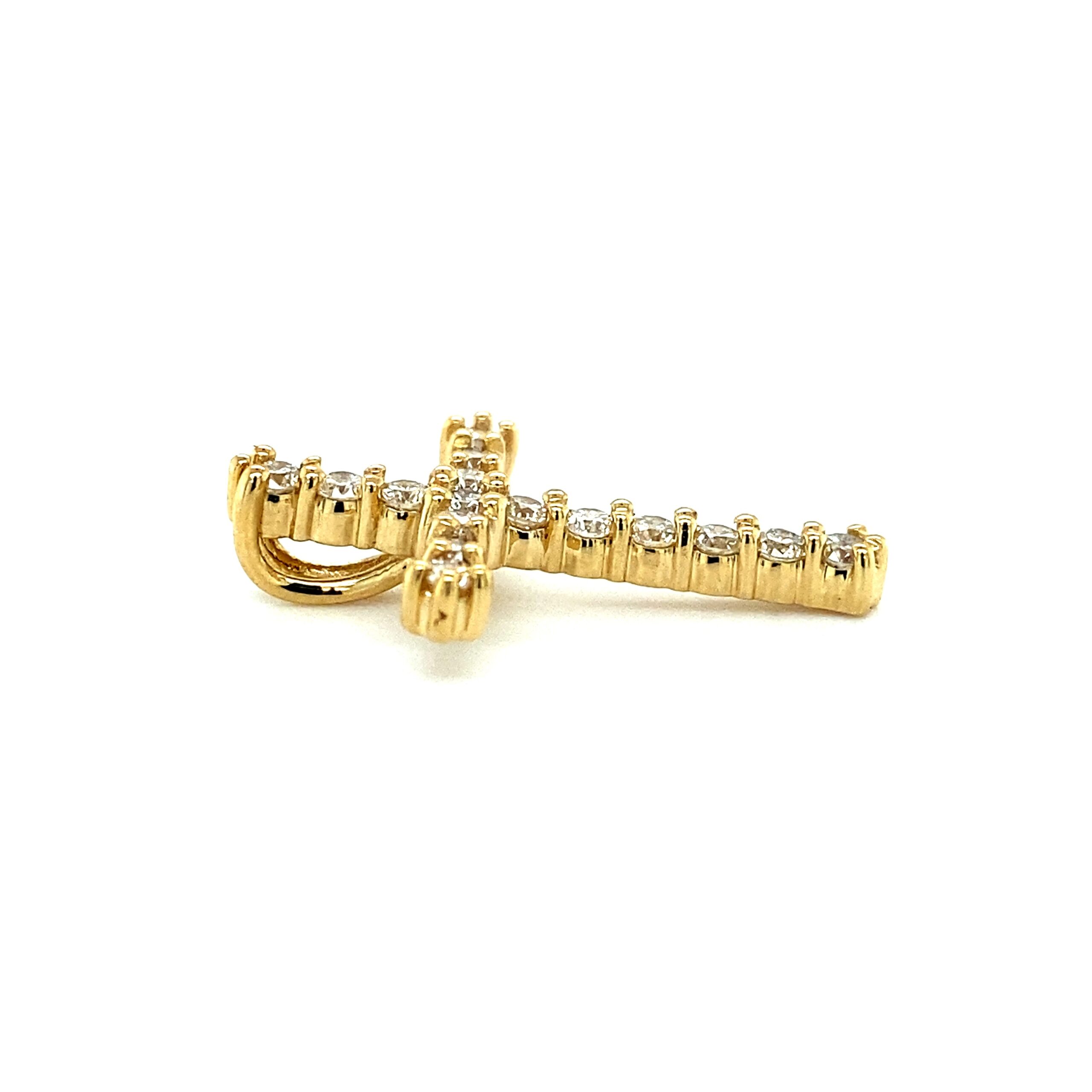 The Diamond Cross Pendant in 14 karat gold features 16 round brilliant diamonds with H color and VS-SI1 clarity in various carat weights in shared prong settings. Chain sold separately.