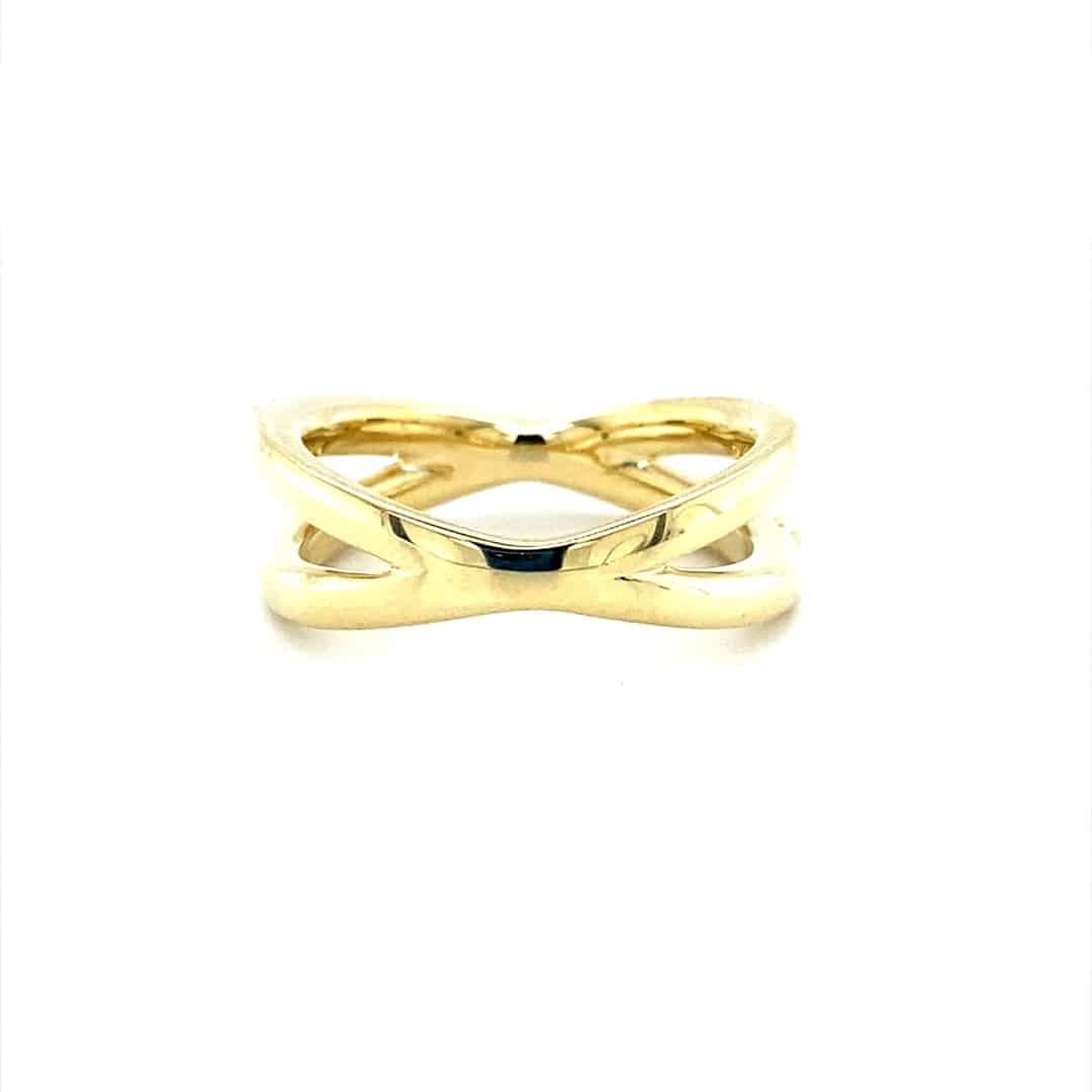 The Diamond and White Enamel Crossover Ring in 10 karat yellow gold features one strand accented with 17 round brilliant diamonds weighing 0.25 ctw with H-I color and SI2 clarity in shared prong settings while the other strand is accented by white enamel.