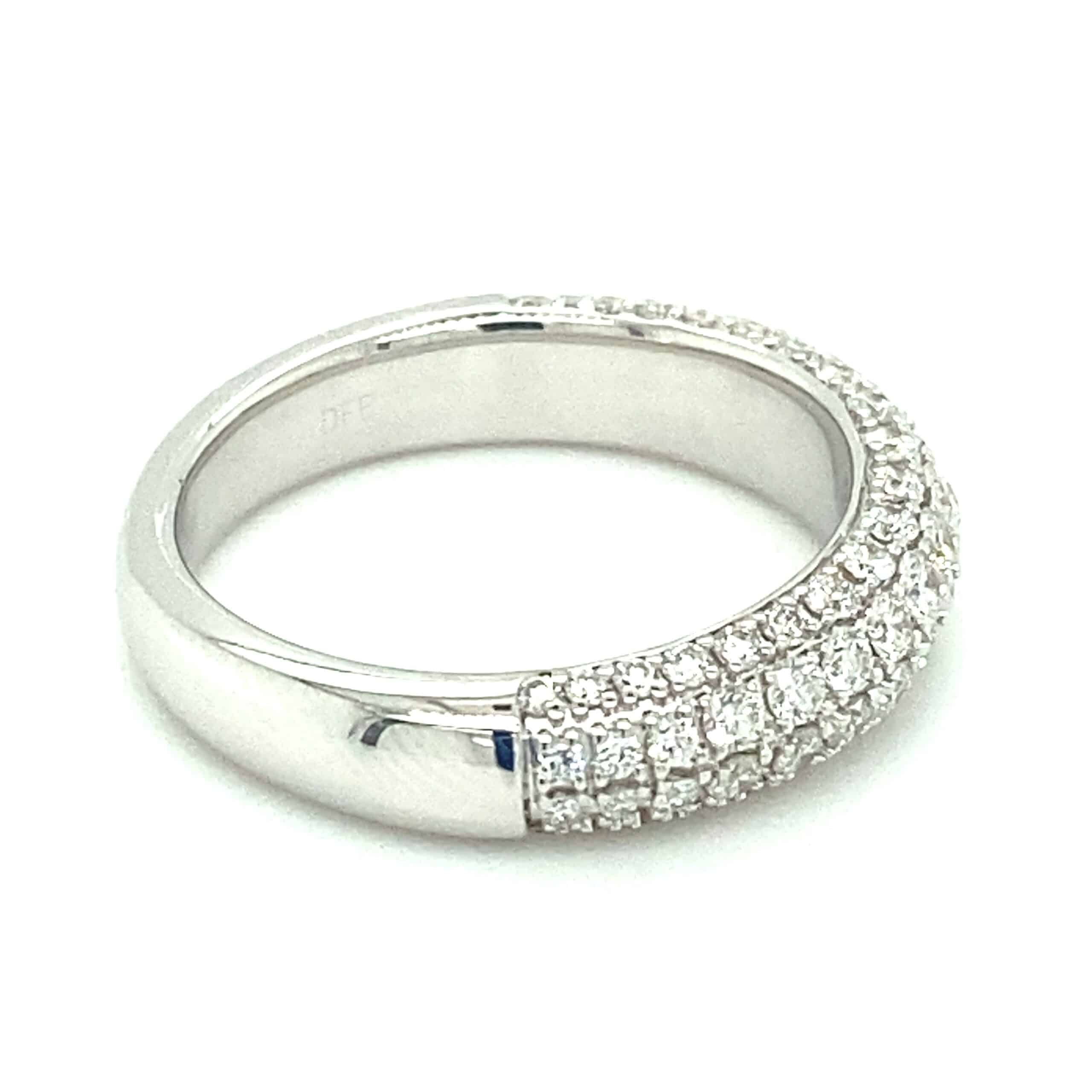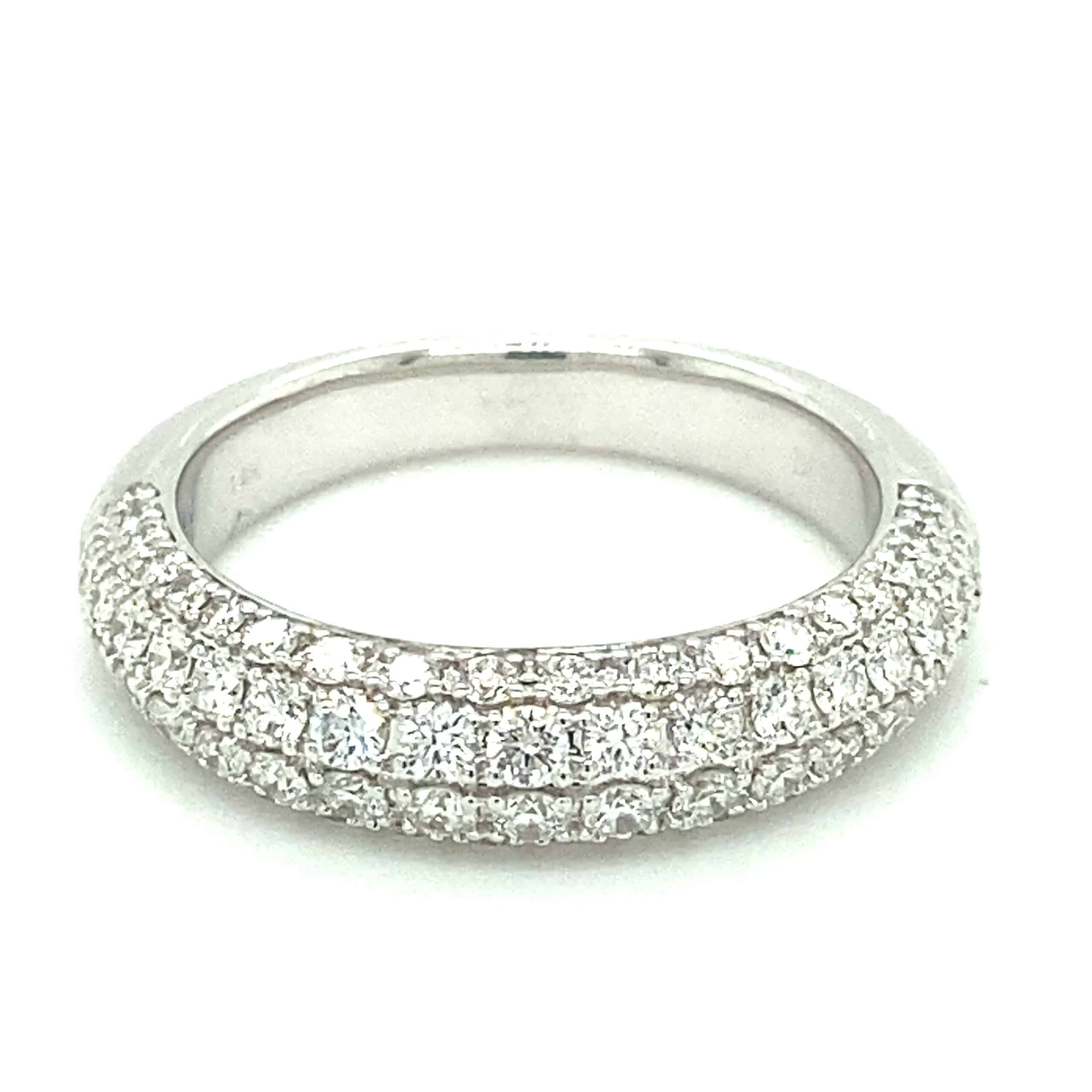The Domed Micro Pave Diamond Band in 14 karat white gold features 78 round-faceted diamonds weighing 1.00ctw with G-H color and VS2-SI1 clarity pave set in three rows. The top of the band measures 4.95mm wide and tapers to 3.36mm wide at the bottom of the shank. Stamped with “14K DFF.” Finger size 6.5.