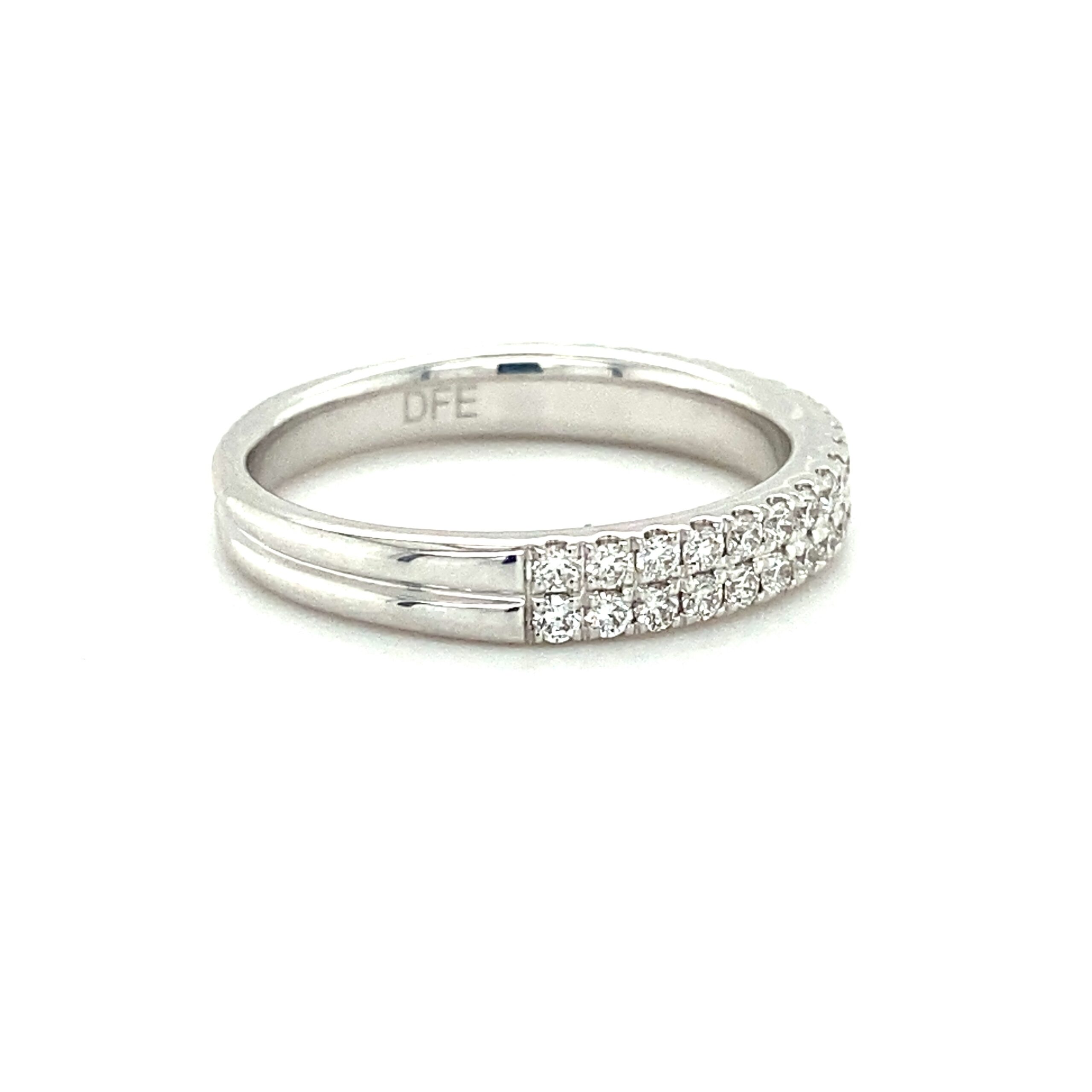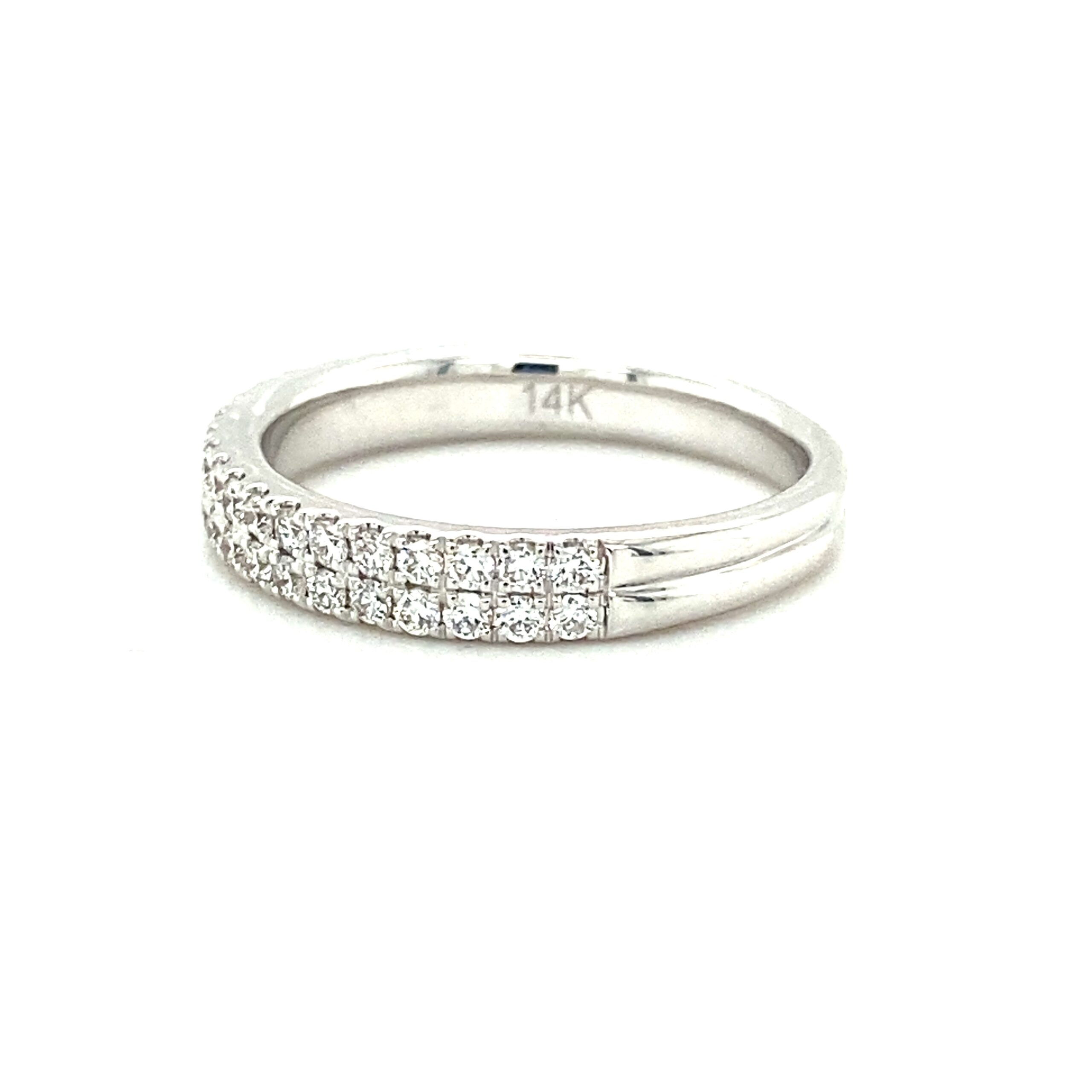The Double-Row Fishtail Prong Diamond Band in 14 karat white gold features 40 round brilliant diamonds weighing 0.55ctw with G-H color and VS2-SI1 clarity in two rows of fishtail-prong settings. The band measures 3.43mm wide at the top and tapers to 2.71mm wide at the bottom of the shank. Stamped with “14K DFE.” Finger size 6.5.