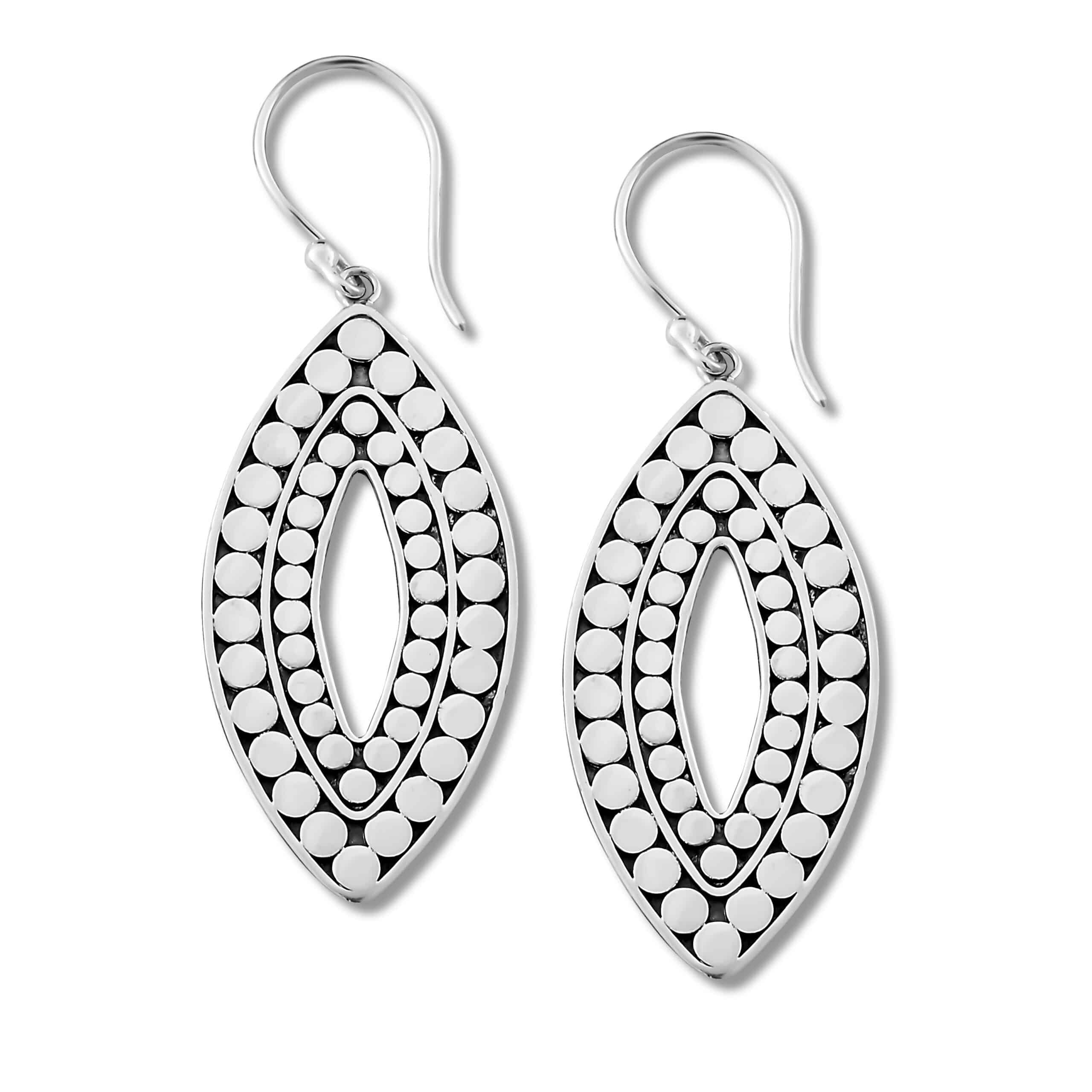 The Endut Dot Marquise-Shaped Drops in sterling silver feature marquise-shaped dangles with open centers and circle accents. French hook wires.