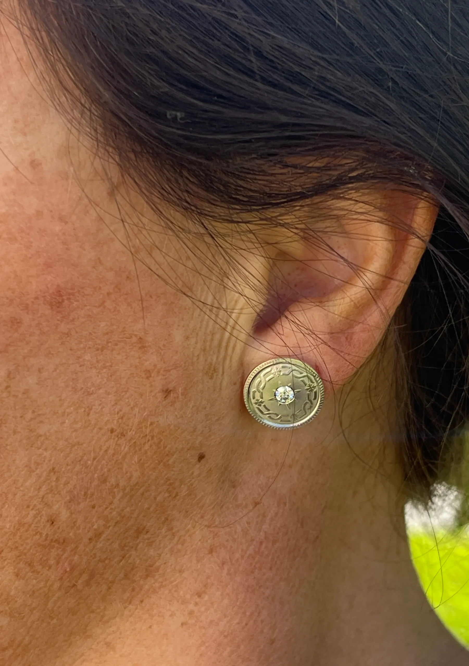 With their symmetrical form and tactile vintage finish, these converted earrings are a testament to craftsmanship and creativity. They offer a distinctive blend of heirloom elegance and everyday wearability.