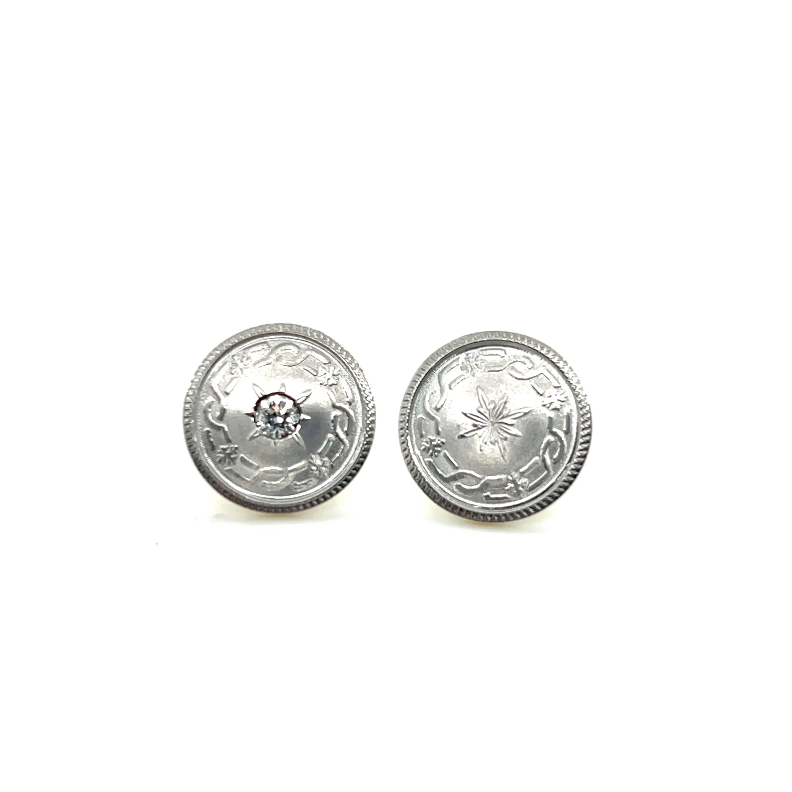 These estate earrings are a beautiful reinvention of early 20th-century design—crafted from a pair of antique cufflinks dating to around 1915. The platinum-topped discs are intricately engraved with starburst and geometric motifs, with one earring featuring a single transitional cut diamond set at the center for added brilliance.