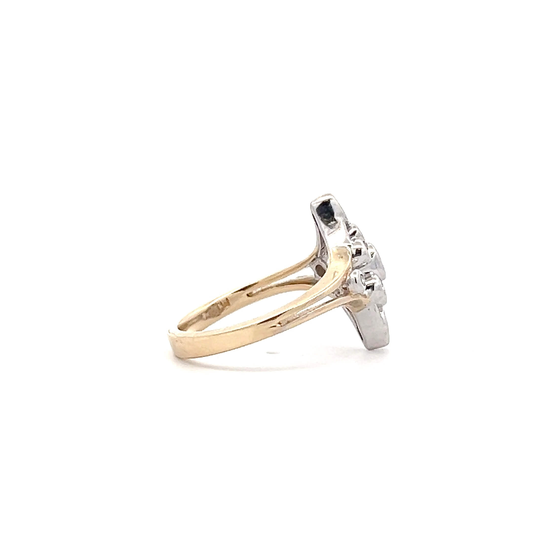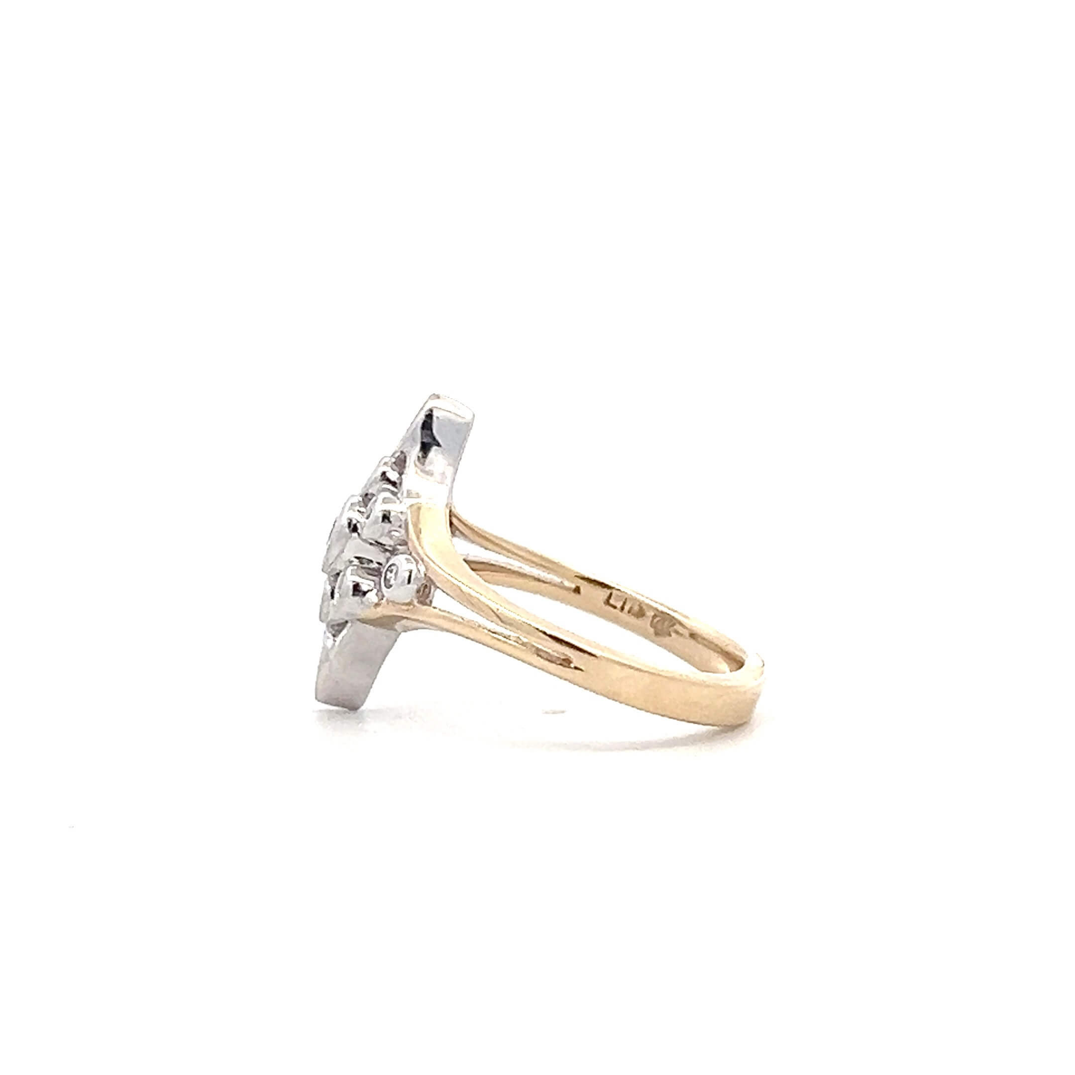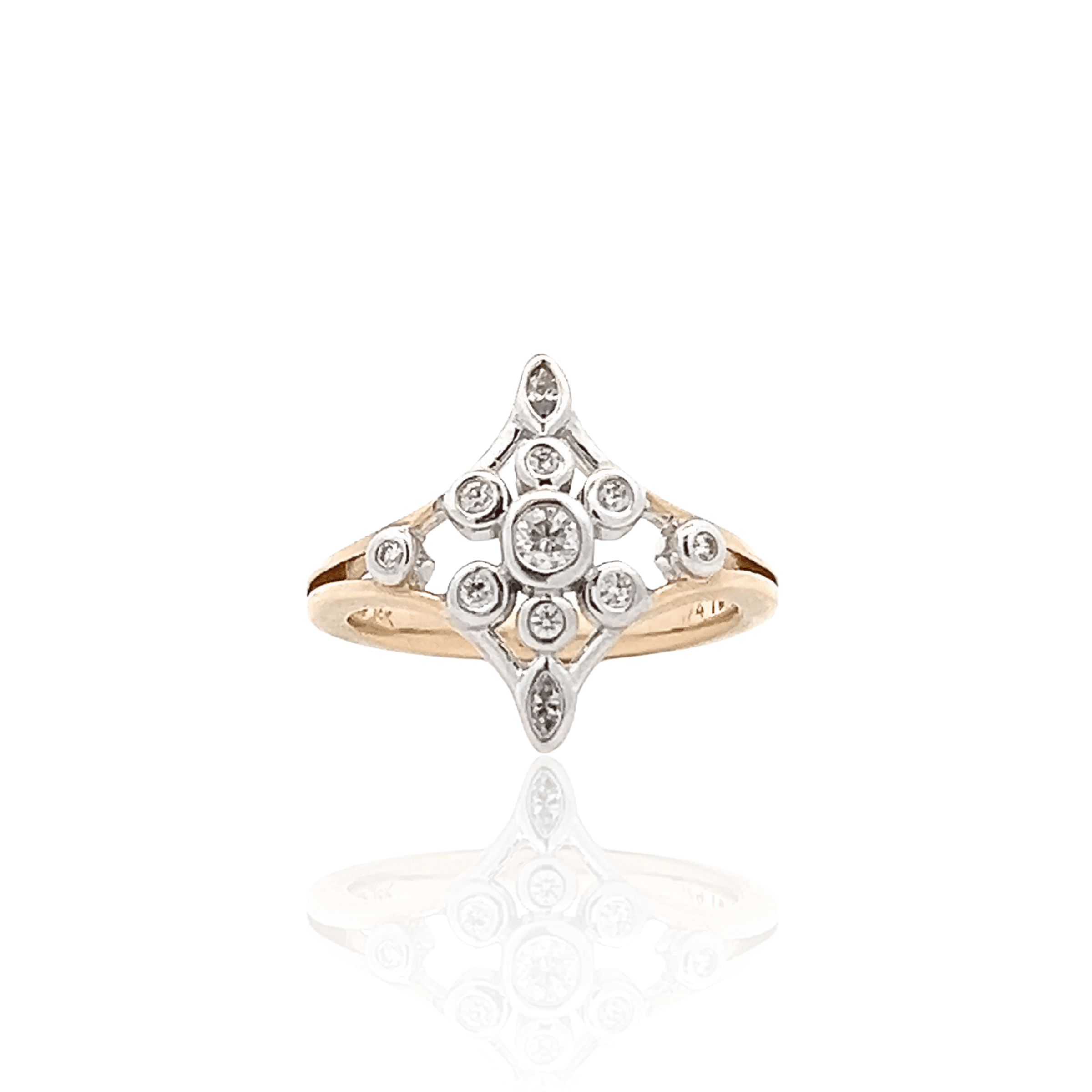 This estate navette ring is crafted in 14K two-tone gold, combining white and yellow gold to highlight its elongated, geometric silhouette. A mix of round and marquise diamonds is arranged in a balanced bezel-set pattern, creating visual interest while keeping the profile smooth and wearable.