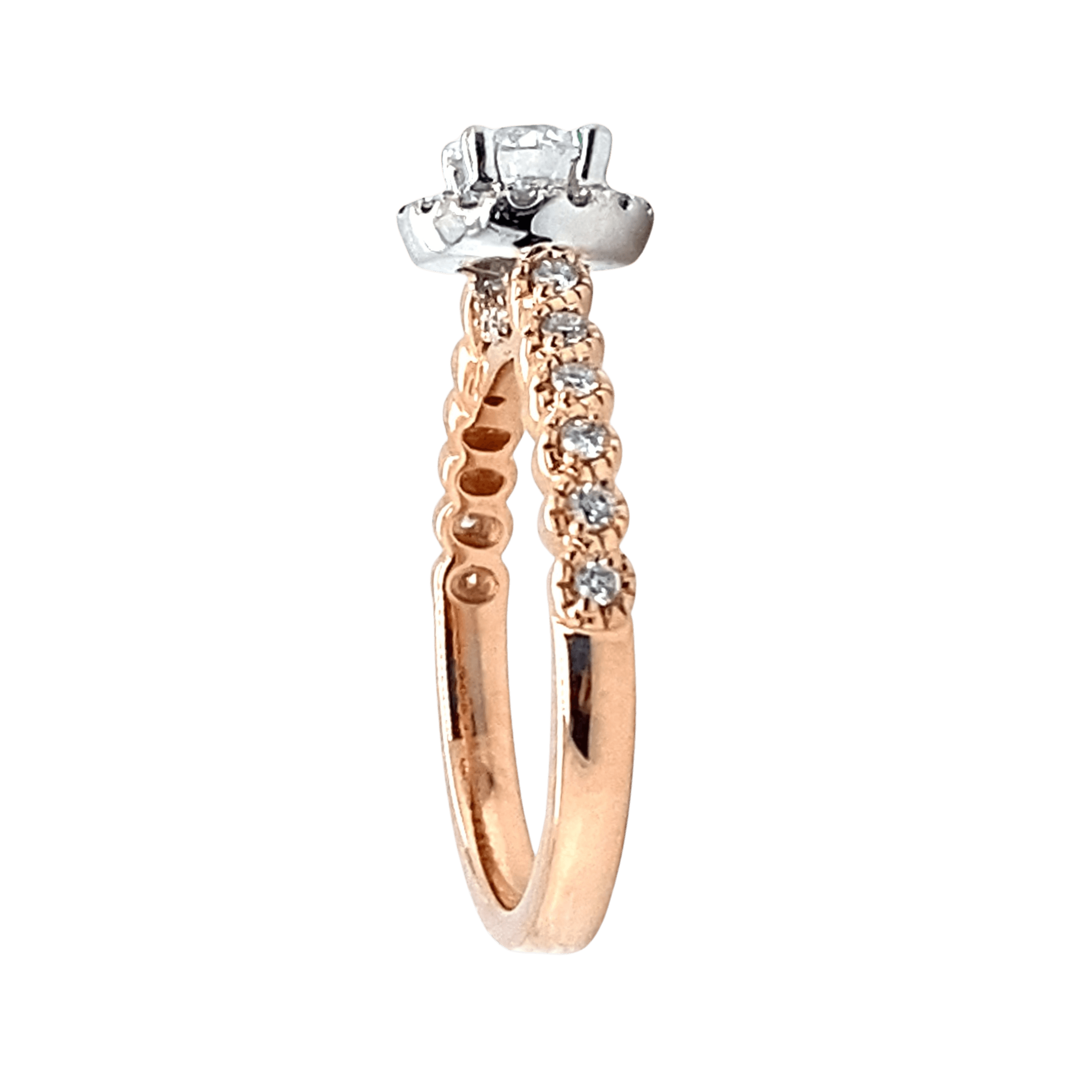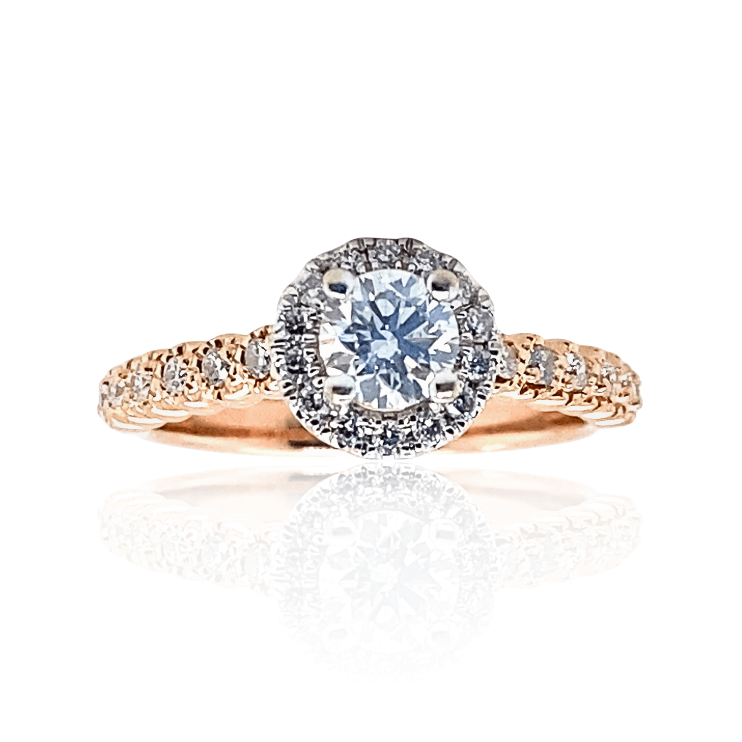 This estate engagement ring is crafted in 14K rose and white gold, featuring a round diamond center framed by a white gold halo and accented shank. The center diamond weighs approximately 0.44 carats and is set in a four-prong white gold head, while an additional 0.35 carats of accent diamonds outline the halo and continue along the shoulders. The contrast between the bright white gold halo and the warm rose gold shank highlights the center stone and adds dimension to the overall design.