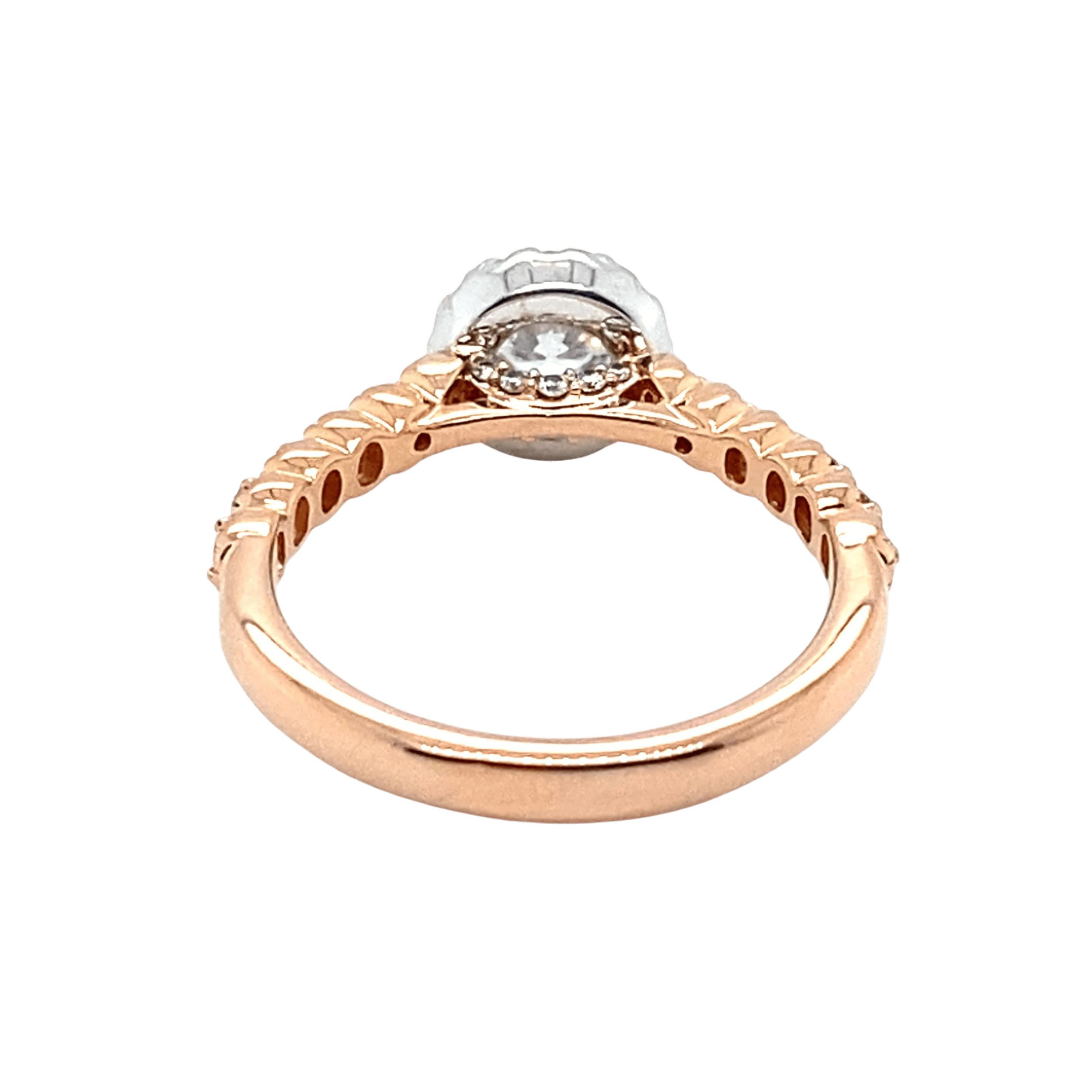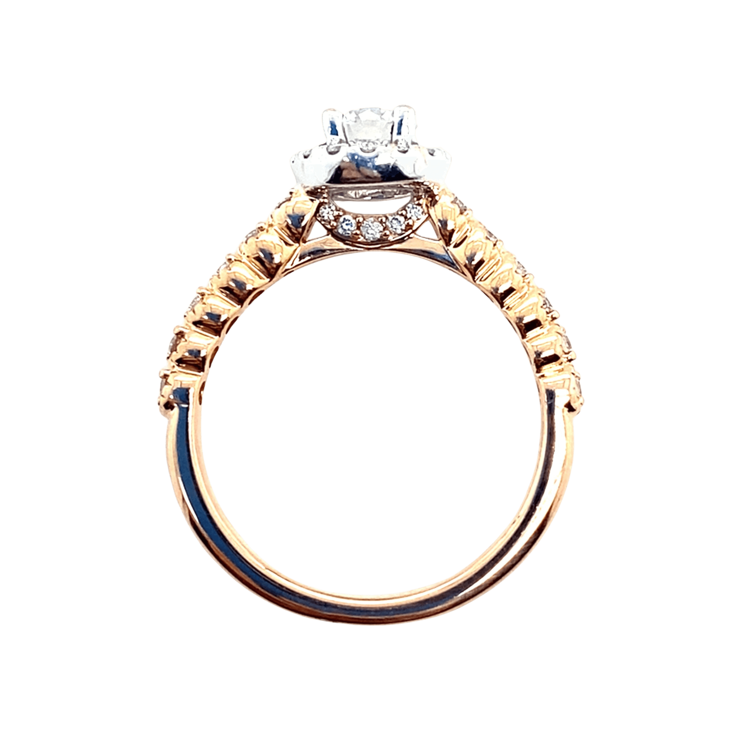 The style feels romantic and thoughtfully balanced, blending classic halo structure with a modern two-tone twist. It pairs beautifully with both rose and white gold wedding bands, and the accented shank allows the ring to stand confidently on its own without needing heavy stacking. This is a design that feels intentional and enduring, with enough detail to feel special while remaining easy to wear day after day. Ring Size: 6.75
