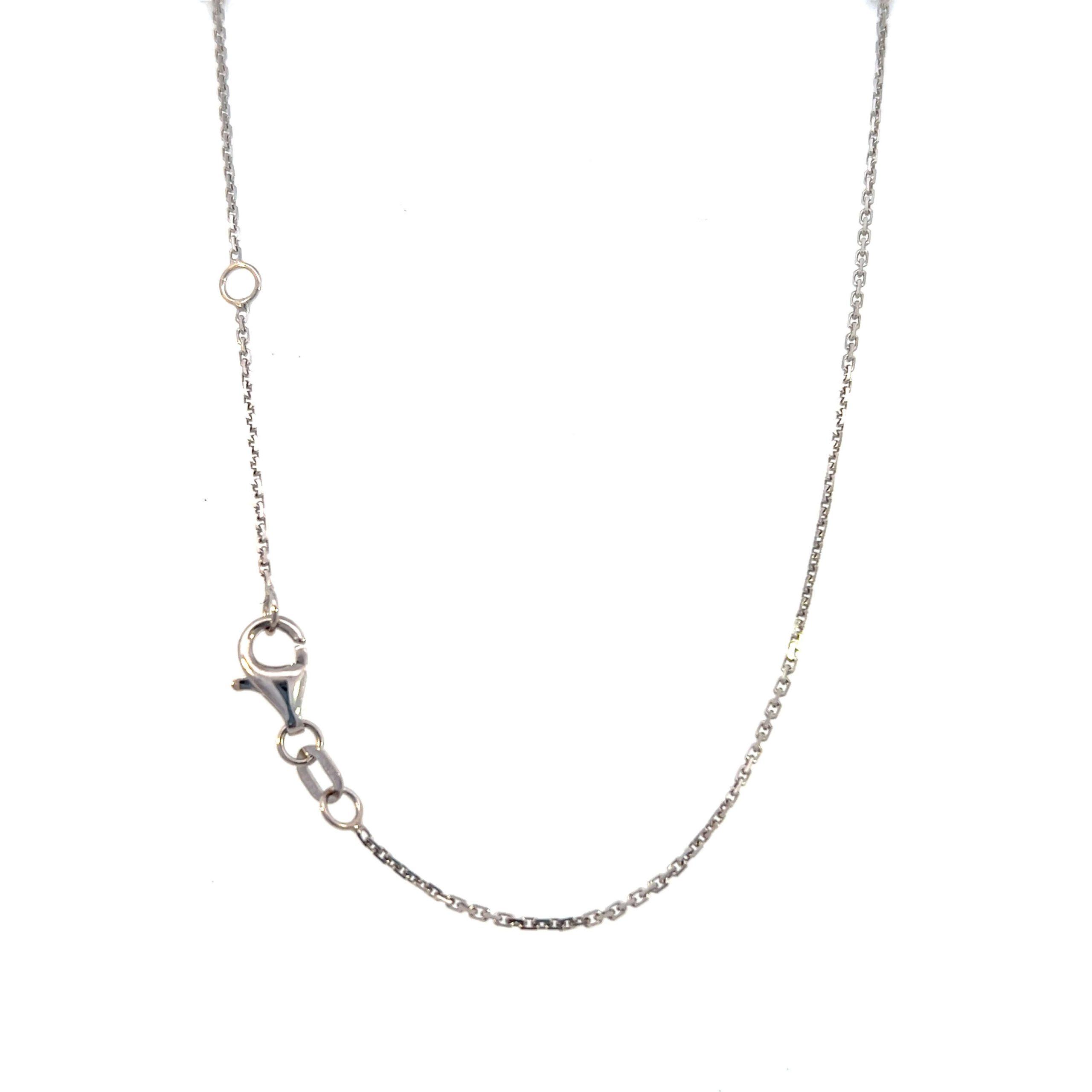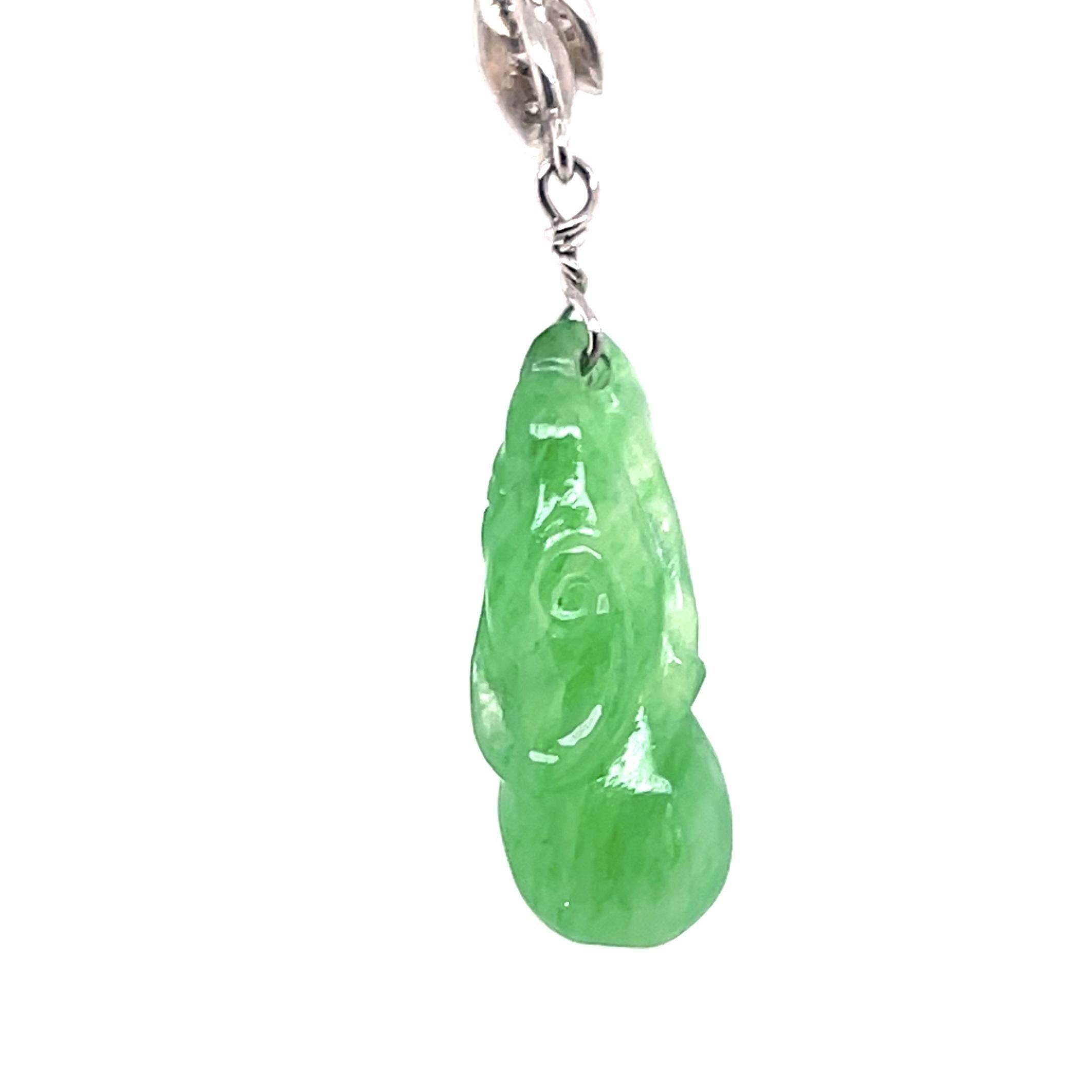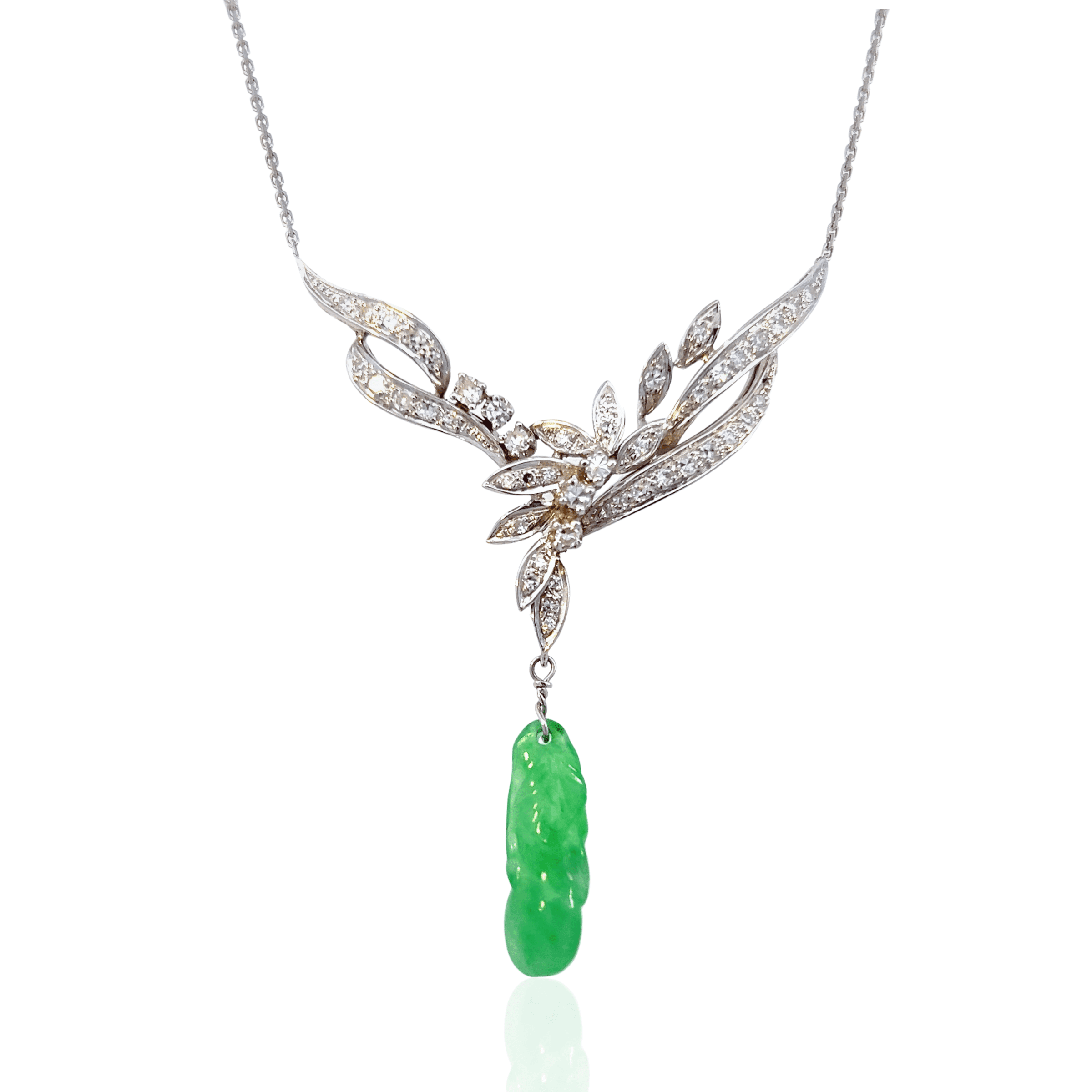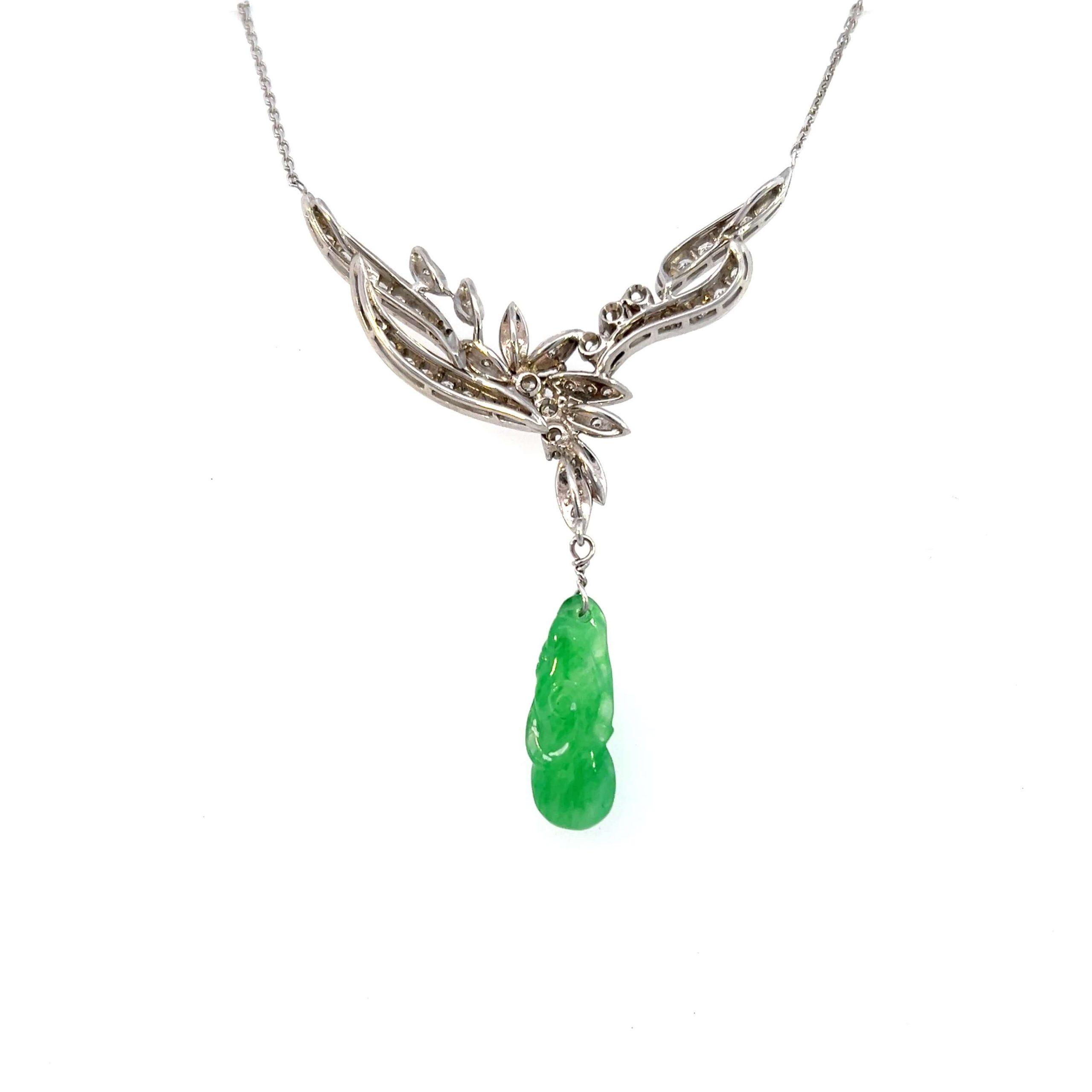 This estate necklace is crafted in 14K white gold and designed with an elegant, diamond-accented floral motif that suspends a finely carved green jadeite drop. The diamonds trace flowing leaf-like forms, creating movement and lightness, while the jadeite adds depth and richness through its saturated color and sculptural carving. The composition feels balanced and intentional, with the pendant drawing the eye without overwhelming the neckline.