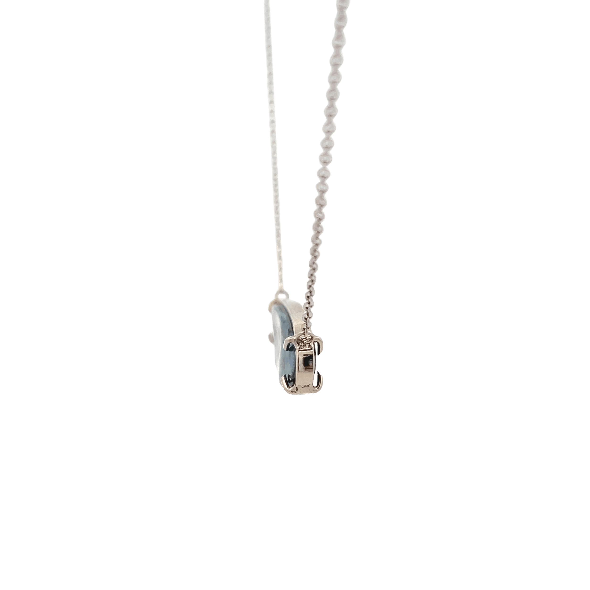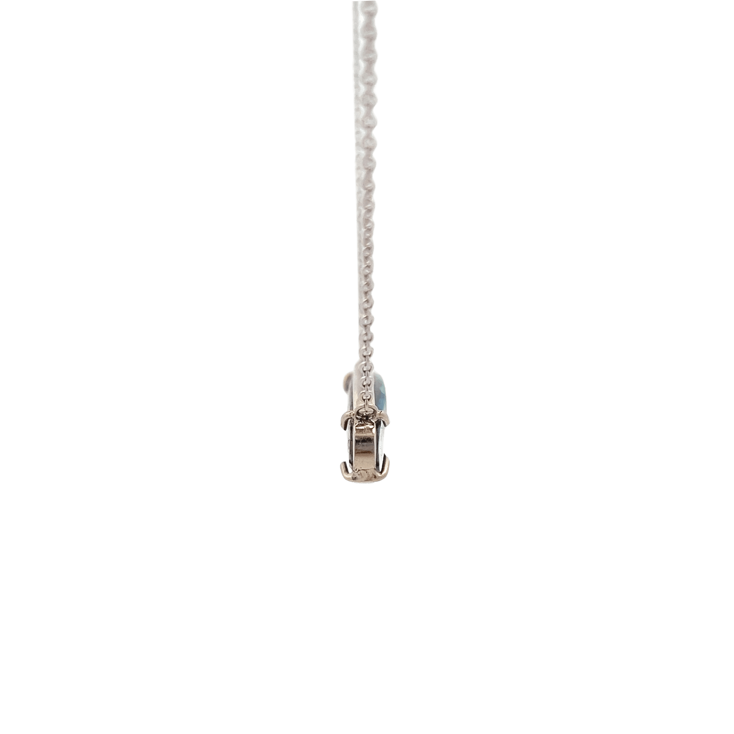 This estate necklace is crafted in 14K white gold and features a striking boulder opal set horizontally in an east–west oval frame. Measuring approximately 9.51 x 28mm, the opal displays natural variations in color and pattern, with deep blues and greens layered across the surface. The sleek frame setting keeps the profile clean and modern, while the 16-inch cable chain positions the pendant perfectly at the collarbone.