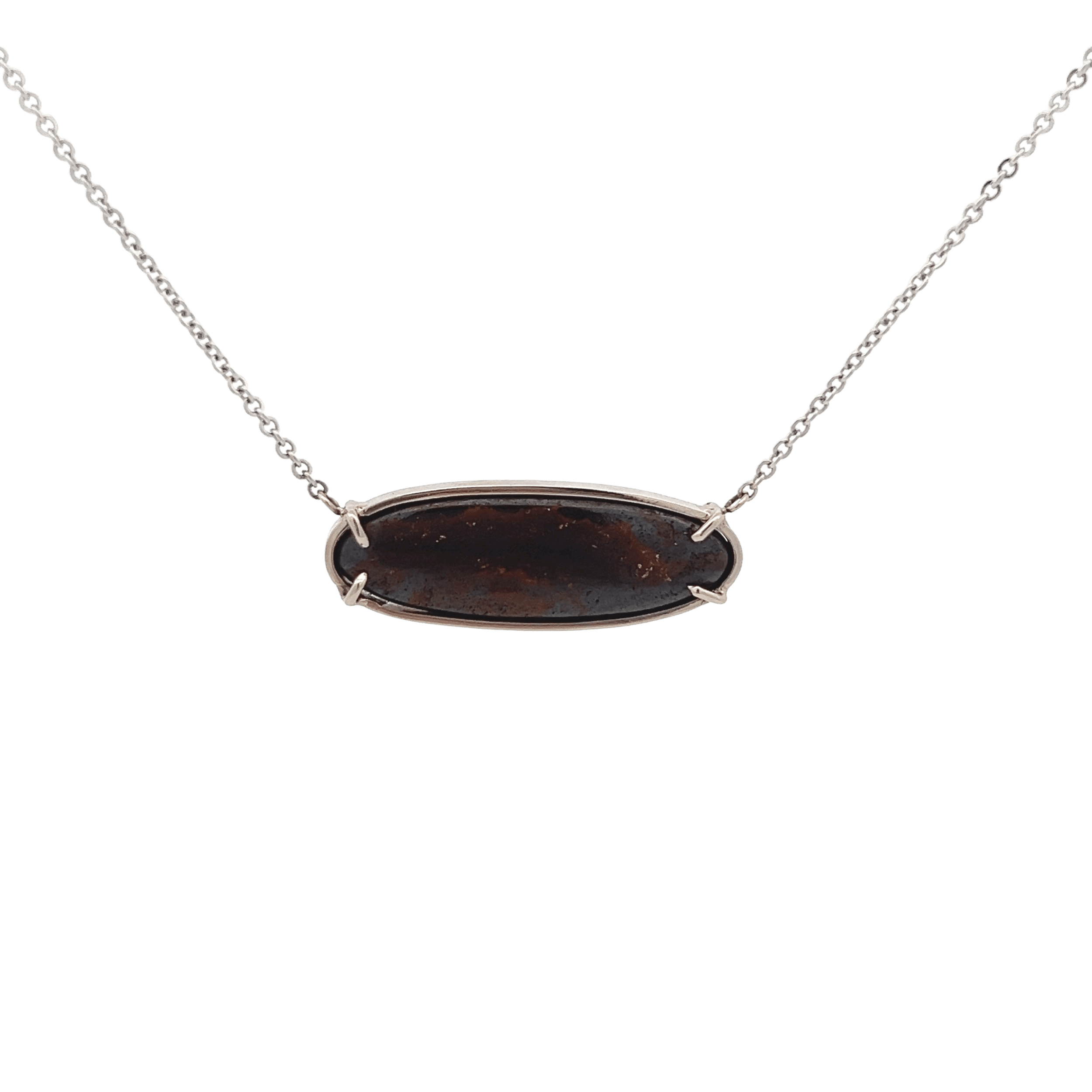 The design feels contemporary and intentional, offering a refined way to wear an opal without leaning traditional. It pairs especially well with open necklines, structured tops, or minimalist dresses where the horizontal orientation becomes a subtle focal point. The combination of white gold and boulder opal gives the necklace a confident, modern edge while remaining easy to wear day to day.