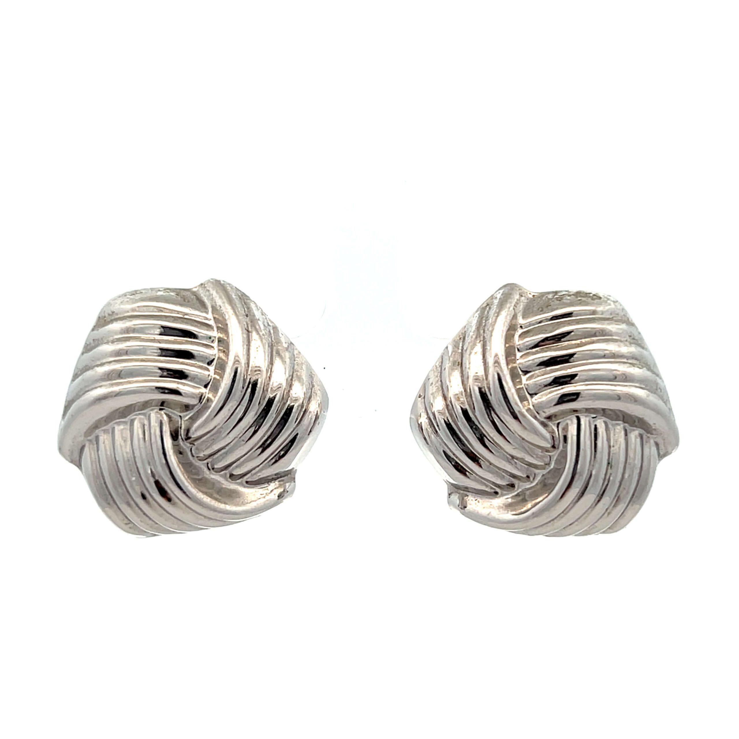 These estate stud earrings are crafted in 14 karat white gold and feature a sculptural hollow knot design with a bright, polished finish. The interwoven form creates depth and visual interest while remaining lightweight thanks to the hollow construction. Finished with omega backings, the earrings offer comfortable support and a secure fit, making them easy to wear despite their bold profile.