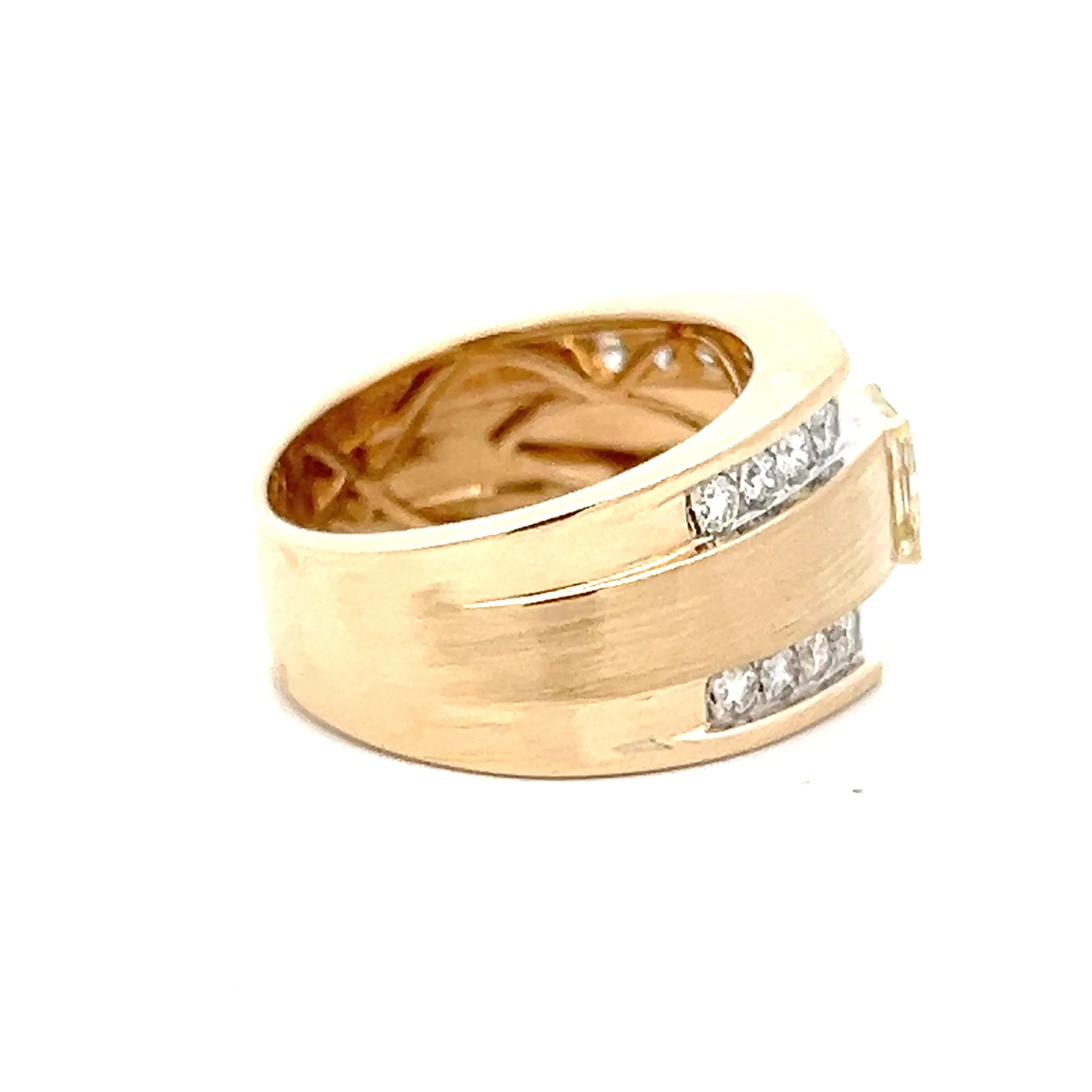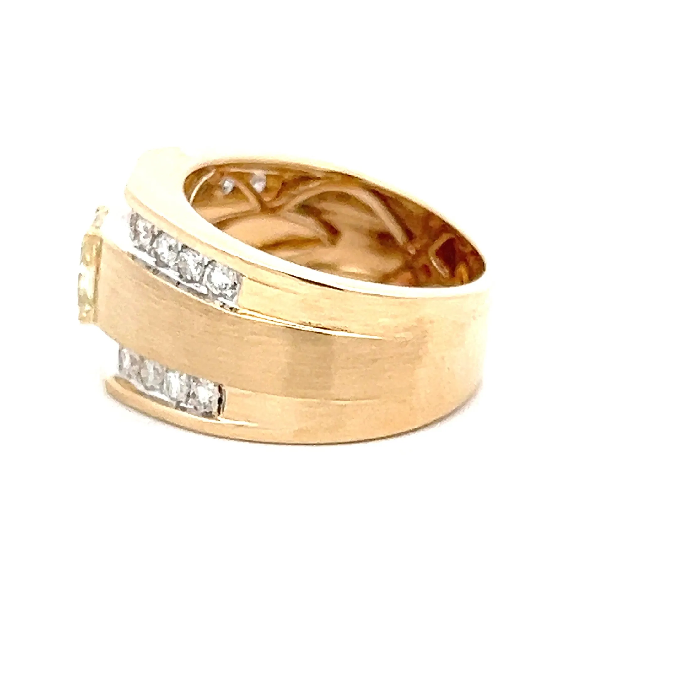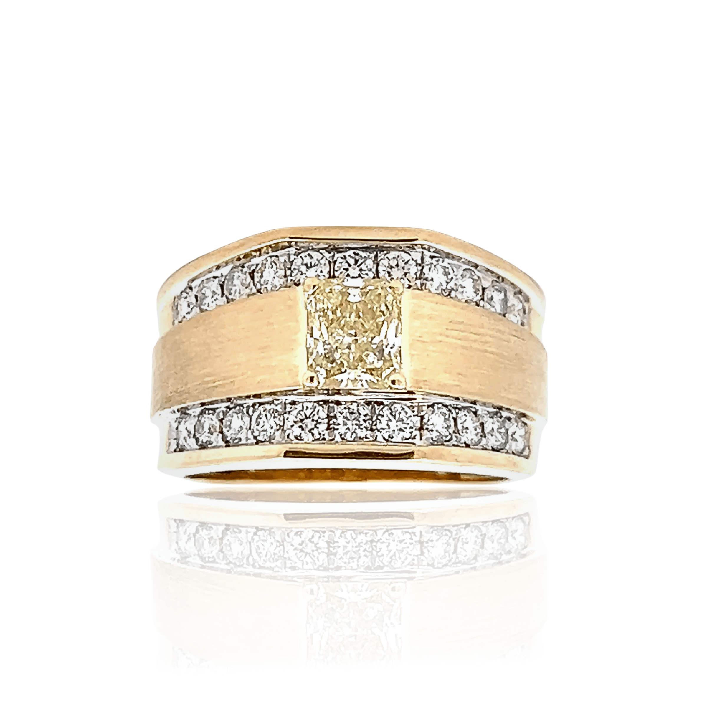 This bold estate 14K yellow gold ring features a striking 0.86 carat radiant cut fancy light yellow diamond, perfectly framed by two rows of sparkling round full-cut diamonds totaling 0.79 carats. The contrast between the satin-finish center and the high-polish gold edges creates a sophisticated, modern look. The bead and prong settings enhance the brilliance of each diamond, giving the ring an elegant yet powerful presence.