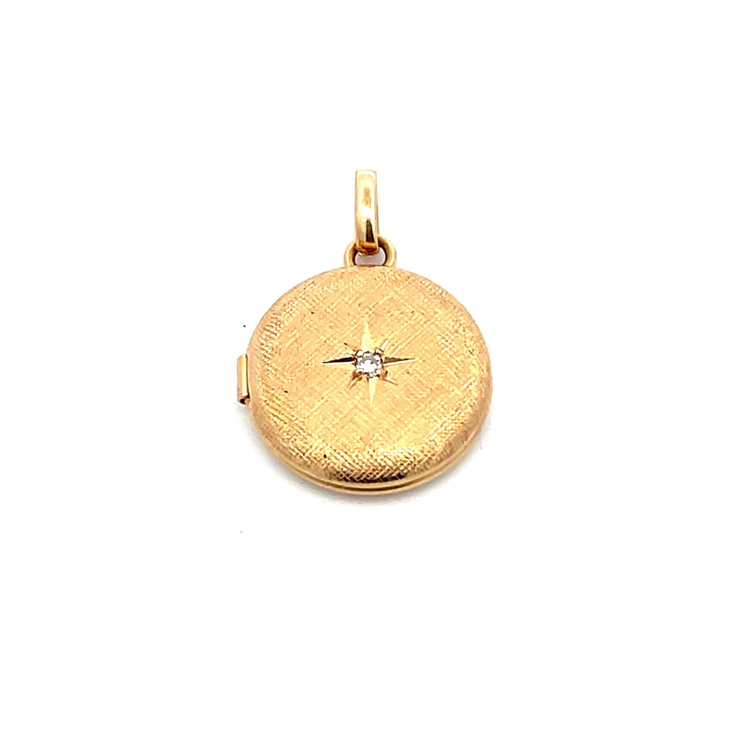 This estate locket necklace is crafted in 14 karat yellow gold and features a delicate round pendant finished with a classic Florentine texture. A small round brilliant diamond is set at the center, adding a subtle point of sparkle without distracting from the finely engraved surface. Measuring approximately 1/2 inch in diameter, the locket has a refined, petite scale that feels both intimate and timeless.